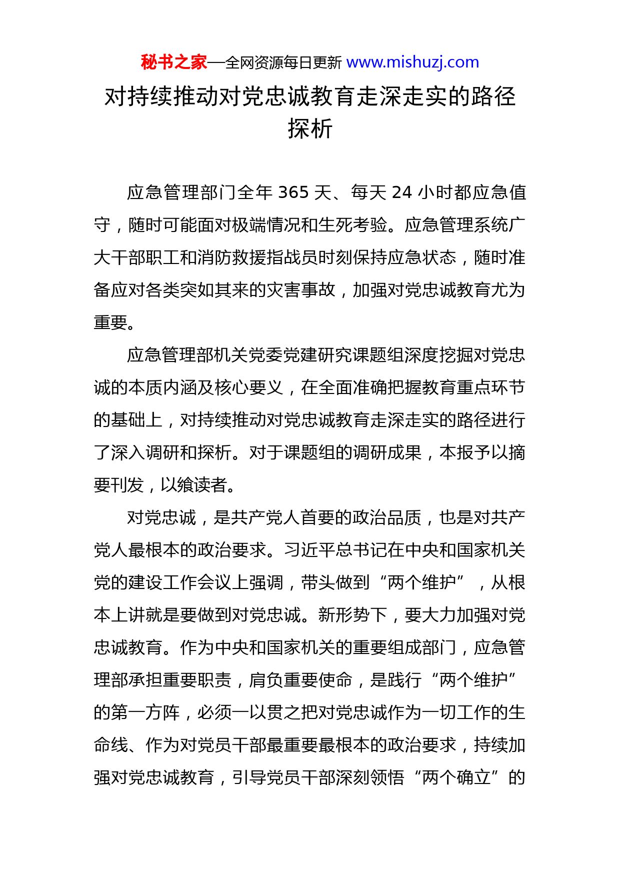 秘书之家—全网资源每日更新www.mishuzj.com对持续推动对党忠诚教育走深走实的路径探析应急管理部门全年365天、每天24小时都应急值守,随时可能面对极端情况和生死考验。应急管理系统广大干部职工和消防救援指战员时刻保持应急状态,随时准备应对各类突如其来的灾害事故,加强对党忠诚教育尤为重要。应急管理部机关党委党建研究课题组深度挖掘对党忠诚的本质内涵及核心要义,在全面准确把握教育重点环节的基础上,对持续推动对党忠诚教育走深走实的路径进行了深入调研和探析。对于课题组的调研成果,本报予以摘要刊发,以飨读者。对党忠诚,是共产党人首要的政治品质,也是对共产党人最根本的政治要求。习近平总书记在中央和国家机关党的建设工作会议上强调,带头做到“两个维护”,从根本上讲就是要做到对党忠诚。新形势下,要大力加强对党忠诚教育。作为中央和国家机关的重要组成部门,应急管理部承担重要职责,肩负重要使命,是践行“两个维护”的第一方阵,必须一以贯之把对党忠诚作为一切工作的生命线、作为对党员干部最重要最根本的政治要求,持续加强对党忠诚教育,引导党员干部深刻领悟“两个确立”的秘书之家—全网资源每日更新www.mishuzj.com决定性意义,增强“四个意识”、坚定“四个自信”、做到“两个维护”,始终在政治立场、政治方向、政治原则、政治道路上同党中央保持高度一致。一、深刻领会对党忠诚的本质内涵及核心要义党的十八大以来,习近平总书记多次发表关于对党忠诚的重要论述,系统回答了什么是对党忠诚和怎样对党忠诚的重要问题,深刻阐明了对党忠诚的具体内涵和实践要求。党的二十大提出,以中国式现代化全面推进中华民族伟大复兴。使命呼唤担当,奋进新征程、夺取新胜利的历史宏愿和现实需要对对党忠诚提出了新要求。对党忠诚是第一位的政治标准。突出政治标准,是党选人用人的一贯方针,其中最核心的就是要把好对党忠诚这一关。对党忠诚,是党员干部的首要政治品质和政治生命线,是建设忠诚干净担当的高素质干部队伍的根本保障,是确保干部队伍信得过、靠得住、能放心的根本因素,必须确保党员干部时时处处事事把对党忠诚体现在对党的信仰、党的组织、党的事业的忠诚上。对党忠诚是第一位的信仰信念。对党忠诚,是坚定政治信仰的前提,是共产党人一生的追求,要忠诚于党的信仰,自觉为实现党的理想信念而奋斗。当前,具有新的历史特点的伟大斗争仍然在继续,只有做到对党忠诚,才能确保对马克思主义的信仰、对中国特色社会主义的信念发秘书之家—全网资源每日更新www.mishuzj.com自内心、坚定不移;只有做到对党忠诚,才能始终在政治立场、政治方向、政治原则、政治道路上同党中央保持高度一致;只有做到对党忠诚,才能在任何时候任何情况下都信得过、靠得住、能放心。对党忠诚是第一位的纪律规矩。政治纪律是党最根本、最重要的纪律,对党忠诚是政治纪律的核心和基石。党员干部是否真正做到严守党的政治纪律和政治规矩,首先要看是否做到对党忠诚。作为党员干部,必须一以贯之把对党忠诚作为最重要的政治纪律,主动接受监督,确保队伍纯洁可靠,在对党忠诚上不讲价钱、不打折扣、不搞变通,任何时候任何情况下都不改其心、不移其志、不毁其节。对党忠诚是第一位的道德品质。对党忠诚是共产党人必备的优良政治品质,是每个共产党员入党宣誓时作出的庄严承诺。对党忠诚在共产党人的道德修养中居于统领地位。党选拔和任用干部历来重视察“德”,选人用人的原则和标准是“德才兼备,以德为先”,突出德的优先地位和主导作用。要具备德,首先就要对党忠诚,要坚定理想信念、锤炼坚强党性,在大是大非面前做到旗帜鲜明讲政治,听党话、跟党走,时刻做到心中有党、心中有民、心中有责,真正将对党、对人民的无限忠诚化为奋进的实际行动。秘书之家—全网资源每日更新www.mishuzj.com对党忠诚是第一位的担当作为。对党忠诚必须始于足下。中央和国家机关作为贯彻落实党中央决策部署的“最先一公里”,要带头把工作岗位作为对党忠诚的检验平台,作为为党尽忠、为国奉献、为民造福的实践舞台,以“等不起”“慢不得”“坐不住”的责任感和“朝受命、夕饮冰,昼无为、夜难寐”的事业心,把忠诚和担当转化成爱岗敬业、履职尽责、奉献社会的具体行动,把心思和能力转化成想干事、能干事、干成事的具体行动。二、准确把握对党忠诚教育的重点环节对党忠诚教育是习近平总书记反复强调的重大问题和时代课题,是党员干部首要的政治原则、首要的政治品格和最根本的党性要求。在主体对象上,必须做到全面覆盖。对党忠诚是对各级党组织和全体党员的基本要求,更是时代赋予每一名共产党人的最崇高的政治责任。全面从严治党首先要解决的问题,就是要在每一名党员干部心中厚植不可动摇的理想信念,培养对党忠诚的品格,牢固树立真诚的马克思主义信仰、为中国特色社会主义事业奋斗的信念,坚定党的理论、路线、纲领不动摇的决心。在检验标准上,必须保持“绝对”“纯粹”。习近平总书记指出,对党绝对忠诚要害在“绝对”两个字,就是唯一的、彻底的、无条件的、不掺任何杂质的、没有任何秘书之家—全网资源每日更新www.mishuzj.com水