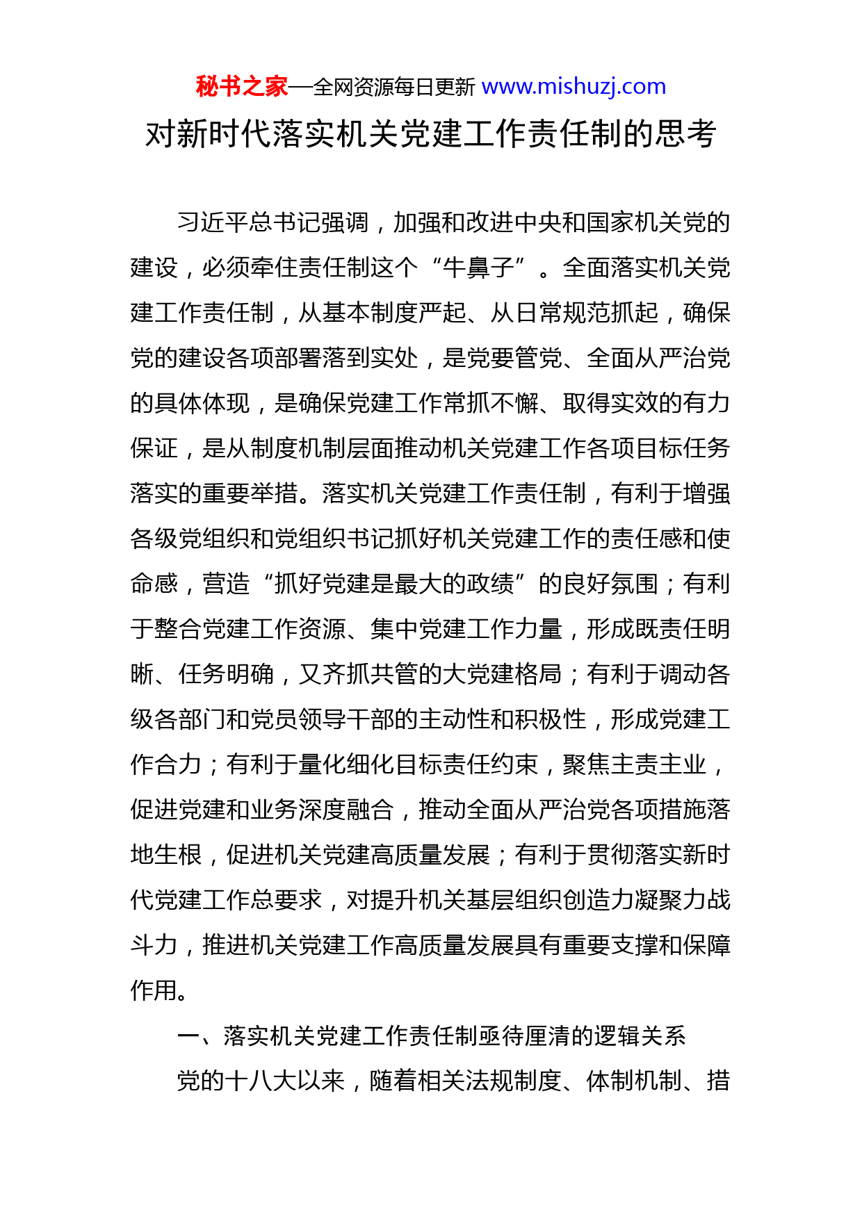 秘书之家—全网资源每日更新www.mishuzj.com对新时代落实机关党建工作责任制的思考习近平总书记强调,加强和改进中央和国家机关党的建设,必须牵住责任制这个“牛鼻子”。全面落实机关党建工作责任制,从基本制度严起、从日常规范抓起,确保党的建设各项部署落到实处,是党要管党、全面从严治党的具体体现,是确保党建工作常抓不懈、取得实效的有力保证,是从制度机制层面推动机关党建工作各项目标任务落实的重要举措。落实机关党建工作责任制,有利于增强各级党组织和党组织书记抓好机关党建工作的责任感和使命感,营造“抓好党建是最大的政绩”的良好氛围;有利于整合党建工作资源、集中党建工作力量,形成既责任明晰、任务明确,又齐抓共管的大党建格局;有利于调动各级各部门和党员领导干部的主动性和积极性,形成党建工作合力;有利于量化细化目标责任约束,聚焦主责主业,促进党建和业务深度融合,推动全面从严治党各项措施落地生根,促进机关党建高质量发展;有利于贯彻落实新时代党建工作总要求,对提升机关基层组织创造力凝聚力战斗力,推进机关党建工作高质量发展具有重要支撑和保障作用。一、落实机关党建工作责任制亟待厘清的逻辑关系党的十八大以来,随着相关法规制度、体制机制、措秘书之家—全网资源每日更新www.mishuzj.com施办法的不断完善,党建工作责任制逐步健全,有力强化了各级党组(党委)“抓好党建是最大的政绩”理念,在落实主体责任行动上更加自觉,推动了全面从严治党不断深入、取得实效。但有的党组织负责人、党员领导干部在理解和把握党建责任的内涵和实质、厘清责任边界、细化责任分工等方面还存在着模糊认识和思想困惑,主要体现在对“五对逻辑关系”的理解和把握上还不够明确和精准。(一)统一领导和具体领导的关系。党的十九大修订的党章将党组对机关党组织的指导关系修改为领导关系,2019年,《中国共产党党和国家机关基层组织工作条例》重新修订,进一步理顺了领导关系,强化了机关工委的领导责任和党组(党委)的主体责任,机关工委、部门党组(党委)、机关党委形成了责任明晰、层层传导的机关党建工作体系:机关工委作为党委派出机构,负有统一领导机关党的工作,指导督促部门党组(党委)落实机关党建主体责任的职能;部门党组(党委)作为具有管理职能的党组织,负有履行全面从严治党主体责任,具体领导和管理机关党建工作的职能;机关党委作为机关党建工作的专责机构,接受机关工委和部门党组(党委)双重领导,负有聚焦主责主业,统筹协调、组织落实机关党建重点工作,推进机关党建高质量发展的职责使命。对照新形秘书之家—全网资源每日更新www.mishuzj.com势新任务新要求,机关工委、部门党组(党委)、机关党委要全面履行好自身职责和使命,加强统筹协调、相互支持配合,突出重点、彼此呼应,同向发力、形成合力,共同落实机关党建政治责任,进一步提升机关党建质量,推动全面从严治党各项任务要求落到实处。具体工作中,有的部门党组(党委)角色转换还不够到位,对从“指导”到“领导”的角色变化还不适应,特别是对《党委(党组)落实全面从严治党主体责任规定》的内容落实不足,凡是涉及党建的内容,习惯于一揽子交给机关党委,对自身主体责任的落实缺乏主动性。加强和改进机关党建工作的机制体制还不够健全完善,对日常机关党建工作在部署安排、考核考评、信息互通、协同配合、培训交流、奖惩激励等方面还存在着“各吹各的号、各唱各的调”的情况。方式方法上创新不够,结合实际抓机关党建工作落实的举措不多、方法老旧,在进一步明晰职能定位、理顺工作关系、创新工作手段等方面还有明显的短板和弱项。(二)主体责任和监督责任的关系。落实党风廉政建设责任制,党委负主体责任、纪委负监督责任。正确理解把握主体责任和监督责任的关系,要充分认识到主体责任中有监督的要求、监督责任中有主体的内容,两者属同一责任范畴的两个方面,如车之双轮、鸟之双翼,相互贯秘书之家—全网资源每日更新www.mishuzj.com通、辩证相生,最终统一于党中央对全面从严治党的集中统一领导。正确把握党委主体责任和纪委监督责任的关系,既不能用纪委的监督责任代替党委的主体责任,也不能以党委的主体责任包揽纪委的监督责任。推动“两个责任”落实,必须站在讲政治的高度,将“两个责任”作为一项系统工程,坚决消除体制机制障碍,紧紧抓住宣传引导、监督检查、考核评议、责任追究、能力提升等重点环节,真正压实“两个责任”。具体工作中,有的领导干部对党风廉政建设责任制的重要意义认识不够,片面认为党风廉政建设是纪检监察机关的具体业务,认为开个会、讲个话和签个责任状就履行了党委主体责任,直接过问、具体研究和推动党风廉政建设相关工作用心用力不够。有的主体责任和监督责任“分工分家”,没有形成信息共享、手段互补、协同配合的格局。有的把党风廉政建设责任制与工作目标责任制脱离开来,年中考核不挂钩、年终考核不兑现,出了事故不追究,使责任制形同虚设。个别单位“好人主义”盛行,遇到矛盾大事化小、小事化了,甚至“捂盖子、堵窗子”,奉行“家丑不外扬”的利己主义原则,管党治党不严不实。个别领导干部因个人不廉