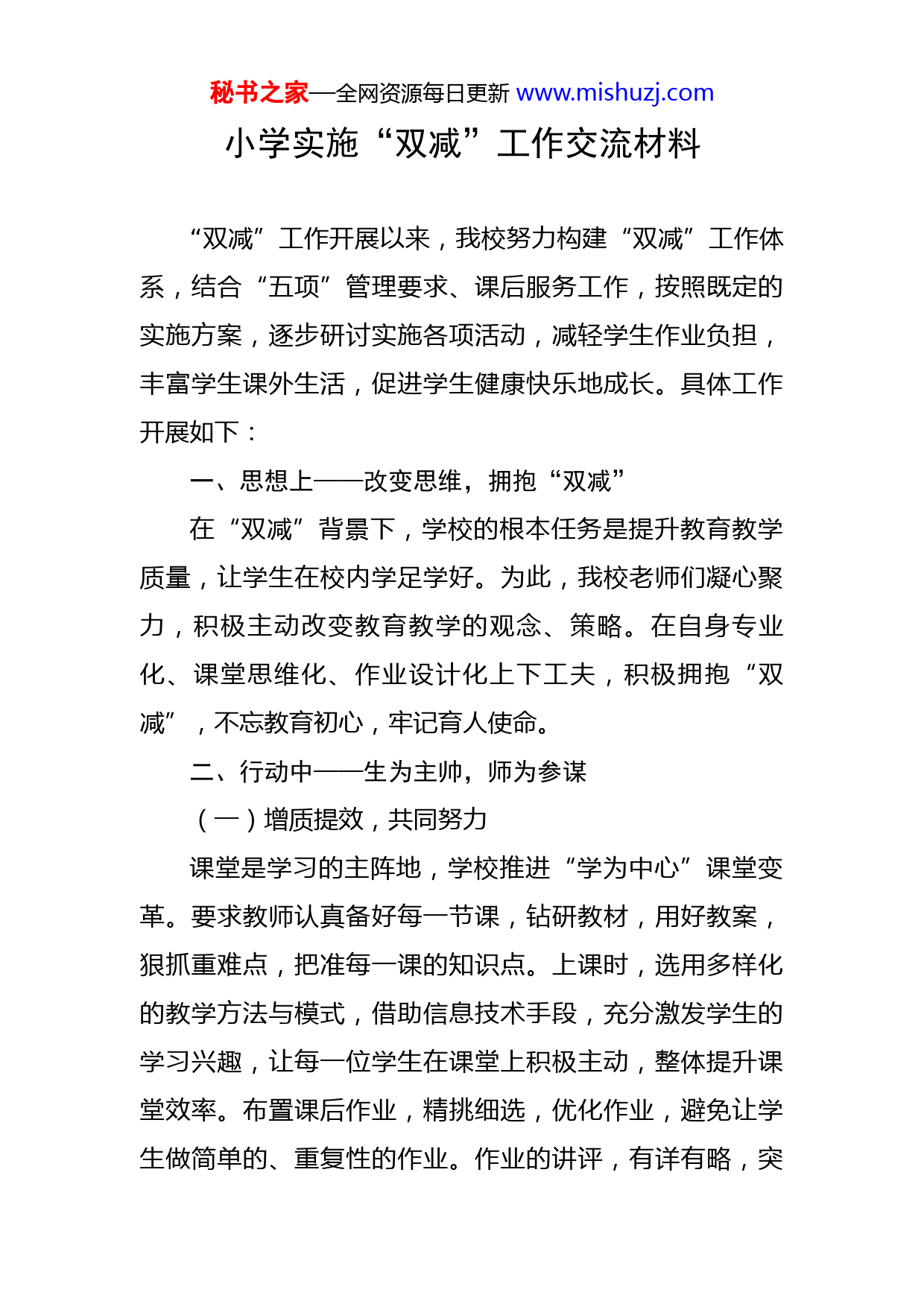 秘书之家—全网资源每日更新www.mishuzj.com小学实施“双减”工作交流材料“双减”工作开展以来,我校努力构建“双减”工作体系,结合“五项”管理要求、课后服务工作,按照既定的实施方案,逐步研讨实施各项活动,减轻学生作业负担,丰富学生课外生活,促进学生健康快乐地成长。具体工作开展如下:一、思想上——改变思维,拥抱“双减”在“双减”背景下,学校的根本任务是提升教育教学质量,让学生在校内学足学好。为此,我校老师们凝心聚力,积极主动改变教育教学的观念、策略。在自身专业化、课堂思维化、作业设计化上下工夫,积极拥抱“双减”,不忘教育初心,牢记育人使命。二、行动中——生为主帅,师为参谋(一)增质提效,共同努力课堂是学习的主阵地,学校推进“学为中心”课堂变革。要求教师认真备好每一节课,钻研教材,用好教案,狠抓重难点,把准每一课的知识点。上课时,选用多样化的教学方法与模式,借助信息技术手段,充分激发学生的学习兴趣,让每一位学生在课堂上积极主动,整体提升课堂效率。布置课后作业,精挑细选,优化作业,避免让学生做简单的、重复性的作业。作业的讲评,有详有略,突秘书之家—全网资源每日更新www.mishuzj.com出重点。对于学生而言,只有真正跟老师互动起来,学习积极性才会真正调动起来,我们多措并举,积极提高学生课堂学习参与率、作业完成率。(二)体育强志,活动育人“双减”后,学生的课余时间明显增多,结合我校自身特点,加之有专职体育教师的配备,因此,学校开展了丰富的体育活动。上学期,除了开展一年一度的冬季运动会,学校还组织了班级篮球联赛,比赛中,气氛热烈,同学们挥洒汗水,努力拼搏的身影,充分彰显了X小学子们蓬勃的朝气,同时,激发了学生团结互助、集体观念、竞争意识和拼搏精神。年末,我校与丰乐完小展开了一场激烈的校际篮球联谊赛,锻炼了学生体魄,切磋了球技,体验了运动带来的乐趣,展现了自我风采。同时更有力的促进了学校之间的交流,进一步增进了学校之间的友谊,真正做到以体育促德育,五育并举、紧密联动,为学校贯彻党的教育方针,全面育时代新人增添了活力。2021年12月31日下午,学校组织了“喜迎元旦”师生篮球联谊赛。赛场上,学生队不甘示弱,全心投入,奋力拼搏。教师队最后甘拜下风。活动不仅拉近师生之间秘书之家—全网资源每日更新www.mishuzj.com的距离,还增进了师生的友谊,丰富了师生的课余生活,也为学校教育教学工作增添了活力,让老师们以更充沛的精力和团队凝聚力投入到教育教学工作中去。本学期,我校积极报名参加“大理市第七届校园足球啦啦操联赛”,希望能再创佳绩,以体现学校“体育强志,活动育人”的办学理念。三、评价上——初显成效,继续探索由于一、二年级期末学业水平综合测评不再进行纸笔考试,我校在上学期期末进行了为期两天的“无纸化”测评活动。活动以过程评价代替终端评价,将传统的考试,转变为适合学生年龄特点的测评形式。运用开放式的表现性评价,对学生进行学习能力测评,集综合性、趣味性、探究性为一体,努力让孩子在轻松愉快的多样评价中,感受学习知识的快乐,体验学习成功的喜悦,更好地指导教师的教和学生的学。本学期,我们将继续完善对各年级学生的评价方式。初步以星级来评价学生,将学校日常活动与星级卡评价紧密联系,通过德、智、体、美、劳等基础教育,因材施教,教育引导学生学会做人、学会学习、学会创造,学会发展。让学生行动有目标,发展有方向,个个有亮点。四、延时班——双向进攻,用心服务(一)基本服务秘书之家—全网资源每日更新www.mishuzj.com指导学生完成作业,对个别学生进行针对性的辅导与答疑等。(二)拓展服务1.继续打造特色体育活动,丰富活动内容,增强学生体质。2.我校即将引入校外正规培训机构,对学生进行公益性艺术类服务,通过绘画、吉他等课程的开设,助力学生全面发展。五、计划中——双减双升,双向发力(一)加强课堂教学研讨,提高课堂教学效率。(二)努力探索特色作业,有效巩固教学效果。教育路上减负增效,还有更多更好的路径等待我们去探索,我校全体师生也将继续教育初心,勇担育人使命。