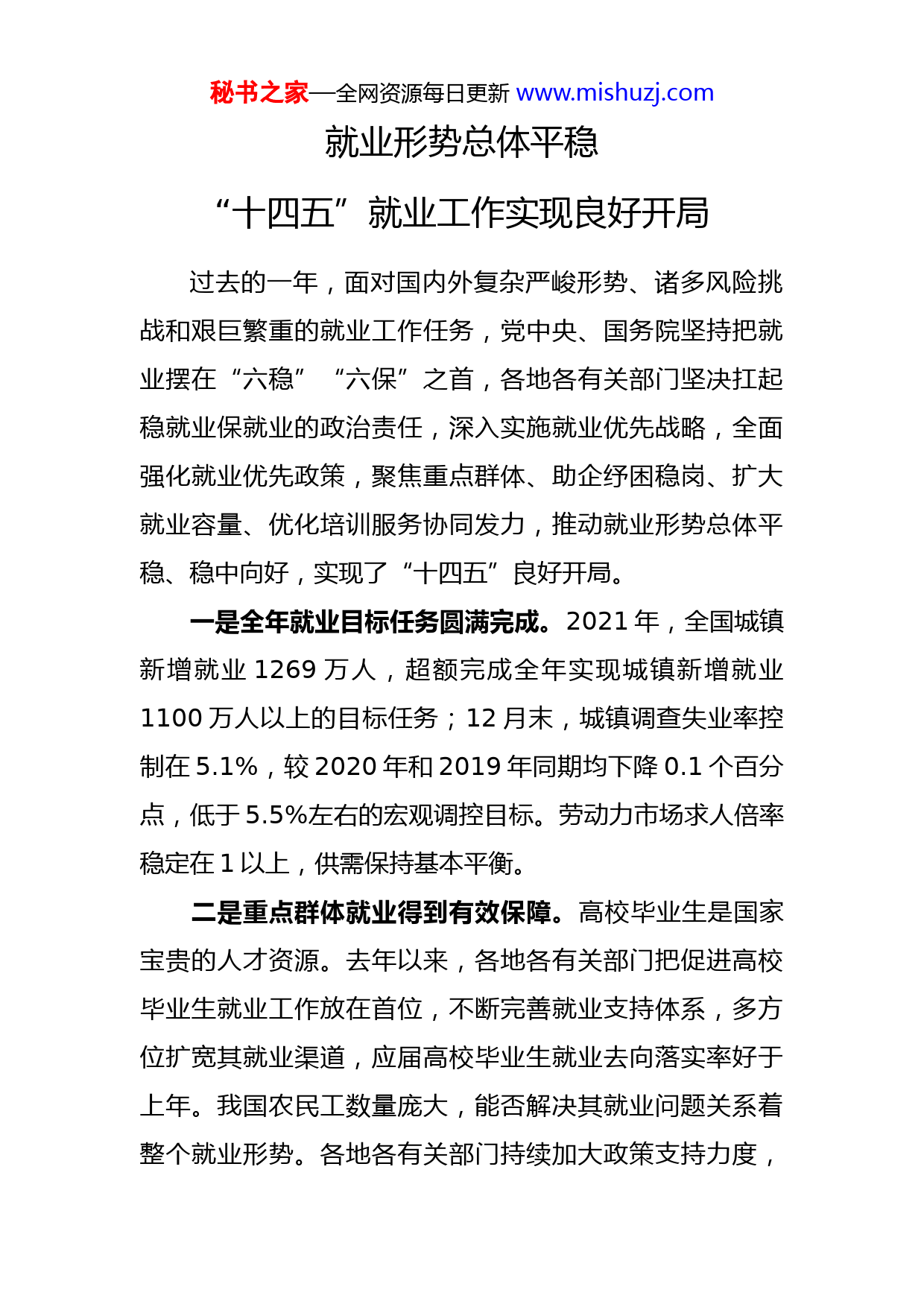秘书之家—全网资源每日更新www.mishuzj.com就业形势总体平稳“十四五”就业工作实现良好开局过去的一年,面对国内外复杂严峻形势、诸多风险挑战和艰巨繁重的就业工作任务,党中央、国务院坚持把就业摆在“六稳”“六保”之首,各地各有关部门坚决扛起稳就业保就业的政治责任,深入实施就业优先战略,全面强化就业优先政策,聚焦重点群体、助企纾困稳岗、扩大就业容量、优化培训服务协同发力,推动就业形势总体平稳、稳中向好,实现了“十四五”良好开局。一是全年就业目标任务圆满完成。2021年,全国城镇新增就业1269万人,超额完成全年实现城镇新增就业1100万人以上的目标任务;12月末,城镇调查失业率控制在5.1%,较2020年和2019年同期均下降0.1个百分点,低于5.5%左右的宏观调控目标。劳动力市场求人倍率稳定在1以上,供需保持基本平衡。二是重点群体就业得到有效保障。高校毕业生是国家宝贵的人才资源。去年以来,各地各有关部门把促进高校毕业生就业工作放在首位,不断完善就业支持体系,多方位扩宽其就业渠道,应届高校毕业生就业去向落实率好于上年。我国农民工数量庞大,能否解决其就业问题关系着整个就业形势。各地各有关部门持续加大政策支持力度,秘书之家—全网资源每日更新www.mishuzj.com促进农民工外出务工和就近就地就业,着力稳定其就业规模。截至去年底,全国农民工总量达到29251万人,已超过2019年水平。脱贫人口就业帮扶取得积极成效,全年脱贫劳动力务工总量达到3145万人,全国3000余个以工代赈项目全面开工建设,带动10多万脱贫群众和低收入人口就近就业,基本实现有劳动力的易地扶贫搬迁家庭至少1人就业的目标。此外,帮扶183万困难人员和545万失业人员实现就业、再就业。三是就业质量明显提升。全年居民人均工资性收入19629元,比上年增长9.6%,两年平均增长6.9%;其中农村居民人均工资性收入增长14.1%,两年平均增长9.9%。截至去年11月底,基本医疗保险覆盖13.6亿人,基本养老保险覆盖10.2亿人。新就业形态劳动者权益保障持续加强,劳动关系更加和谐。四是创业带动就业动能显著增强。“放管服”改革深入推进,创新创业环境更加优化。截至去年10月底,全国市场主体已突破1.5亿户,个体工商户超过1亿户,市场活力和社会创造力进一步激发。返乡入乡创业高质量发展截至去年底,累计返乡入乡创业人员达到1120万人,新增110万人,带动就业超过3500万人。数字经济、平台经济等新产业新业态新模式逐步发展壮大,催生大量新就业秘书之家—全网资源每日更新www.mishuzj.com形态和灵活就业岗位。截至去年底,灵活就业人员规模已经达到2亿人左右。五是助企纾困稳岗成效明显。去年以来,部分援企减负稳岗政策延续实施,在税收、融资、用电用能用工等方面给予市场主体持续支持,对市场主体恢复生产经营、稳定用工岗位发挥了重要的作用。去年全年新增减税降费超过1万亿元,为制造业中小微企业缓税缓费2000亿元;1—11月份,减免失业、工伤保险费近1400亿元,共向超300万户企业发放失业保险稳岗返还近200亿元,惠及约7000万职工。六是就业政策和服务体系更加健全。去年10月份,国务院印发实施了《“十四五”就业促进规划》,对“十四五”时期就业工作作出全面部署,为推动就业高质量发展提供了系统指引。大规模职业技能培训持续推进,全年政府补贴性培训超2400万人次。发展改革委安排中央预算内投资12亿元,支持地方新建52个公共实训基地。各地各有关部门持续开展各类公共就业服务活动,为劳动者提供就业创业服务,推动人力资源服务业高质量发展,劳动力市场配置效率进一步提高。2021年,面对诸多不利因素,在极其困难条件下,实现就业大局稳定来之不易,主要得益于以习近平同志为核心的党中央的坚强领导和习近平新时代中国特色社会主义秘书之家—全网资源每日更新www.mishuzj.com思想的科学指引,得益于党中央、国务院坚持人民至上的价值理念和就业优先的战略部署,得益于各地各部门担当作为、创新举措做好就业工作的巨大努力,得益于上亿市场主体和广大劳动者迎难而上、克难攻坚的共同奋斗。当前和今后一段时间,我国经济长期向好的基本面没有变,韧性强的特点较为突出,高质量发展的特征逐步显现,这为稳定和促进就业提供了有利的条件和重要的支撑。但也要看到,我国经济发展面临需求收缩、供给冲击、预期转弱三重压力,加上局部新冠肺炎疫情仍有可能反复,市场主体尚未完全恢复,就业总量压力不减,结构性矛盾更加突出,就业形势依然复杂严峻。今年将迎来党的二十大,做好就业工作具有特殊重要的意义。为此,应坚决贯彻落实党中央、国务院决策部署坚持稳字当头、稳中求进,继续把就业摆在“六稳”“六保”首要位置,认真组织实施《“十四五”就业促进规划》,落实落细就业优先政策,确保完成全年目标任务,持续改善民生,推动实现更加充分更高质量就业迈出坚实步伐。一是在推动高质量发展中强化就业优先导向,提高经济增长的就业带动力。解决就业问题,根本要靠发展。要坚持经济发展就业优先导向,强化跨周期和逆周期宏观调控政策有机结合,做好预期管理,保持经济运行在合理区秘书之家—全网资源每日更新www.mishuzj.com间。深入实施扩大内需战略,适度超前开展基础设施投资加快补齐重点领域短板,
