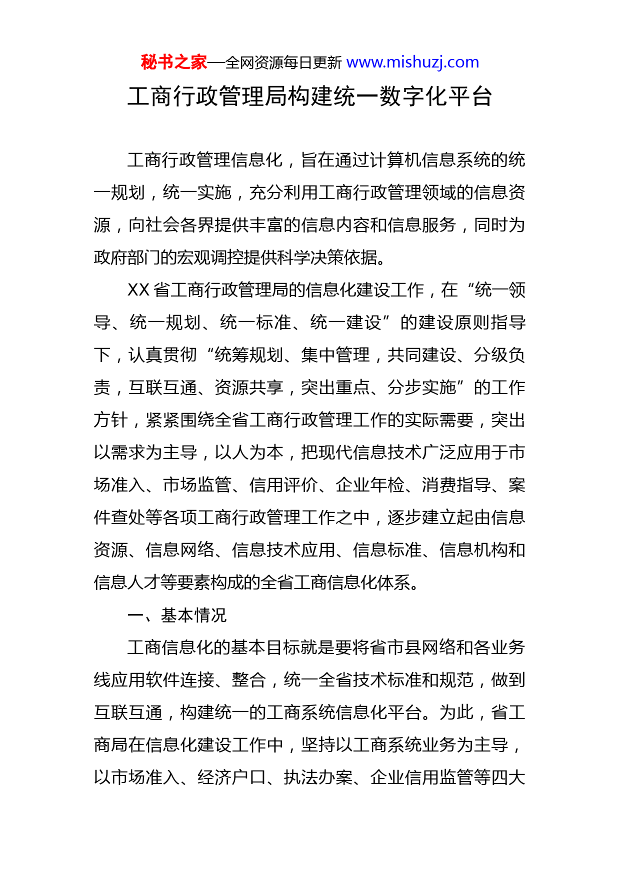 秘书之家—全网资源每日更新www.mishuzj.com工商行政管理局构建统一数字化平台工商行政管理信息化,旨在通过计算机信息系统的统一规划,统一实施,充分利用工商行政管理领域的信息资源,向社会各界提供丰富的信息内容和信息服务,同时为政府部门的宏观调控提供科学决策依据。XX省工商行政管理局的信息化建设工作,在“统一领导、统一规划、统一标准、统一建设”的建设原则指导下,认真贯彻“统筹规划、集中管理,共同建设、分级负责,互联互通、资源共享,突出重点、分步实施”的工作方针,紧紧围绕全省工商行政管理工作的实际需要,突出以需求为主导,以人为本,把现代信息技术广泛应用于市场准入、市场监管、信用评价、企业年检、消费指导、案件查处等各项工商行政管理工作之中,逐步建立起由信息资源、信息网络、信息技术应用、信息标准、信息机构和信息人才等要素构成的全省工商信息化体系。一、基本情况工商信息化的基本目标就是要将省市县网络和各业务线应用软件连接、整合,统一全省技术标准和规范,做到互联互通,构建统一的工商系统信息化平台。为此,省工商局在信息化建设工作中,坚持以工商系统业务为主导,以市场准入、经济户口、执法办案、企业信用监管等四大秘书之家—全网资源每日更新www.mishuzj.com工商行政管理行为为切入点,结合数据采集、数据处理、数据应用,为各级工商行政管理机关提供成熟、合理和专业化的解决方案。自2000年开始至今,XX省工商系统的信息化建设大致走过了以下五个阶段:一是基础建设阶段(2000年—2002年),全省各级工商机关根据全省统一的《网络建设技术标准》,集中资金,购置硬件,搭建了工商系统内网(专网)、外网(互联网)二个网络平台。二是应用开发阶段(2001年—2003年),在硬件基本配备、网络基本形成的基础上,先后开发了经济户口准入系统、经济户口监管系统、工商所综合管理系统、政务系统、经检办案系统等业务应用系统,并逐渐在系统内进行推广和应用。三是整合提高阶段(2003年—2004年),在业务应用的前提下,全系统着力做好应用与软件的整合工作,并先后形成了一批数据库。四是数据建设阶段(2003年至今),建设全省数据资源平台,实行数据集中,建立了省市二级数据中心,并不断提升业务应用,为真正实现数据共享打下了基础。五是全面提升阶段(2004年至今),根据省政府的统一部署,在全省经济户口中积极推行企业数字证书,不断深化数据开发应用,建立统一电子政务平台。通过这几年的持续努力,省工商局的信息化建设取得了阶段性的成果:秘书之家—全网资源每日更新www.mishuzj.com1.经济户口综合监管系统渐趋成熟为配合全省商品市场流通领域整顿工作,建立了流通领域商品质量抽查和市场检测结果发布系统,建立了食品安全预警发布平台。以企业信用监管的功能提升和扩充为重点,形成了全新的信用评价体系,并形成了评价、警示、分类监管的全面互动。改造升级了工商所巡查监管功能,实行了移动办公。2.推进了数字化工商所建设根据数字化工商所建设纲要及考核办法,推出了“工商所综合管理系统”,把工商所的日常工作都列入工商信息化管理的范畴。3.政务系统建设卓有成效对省局政务系统内网门户网站进行了升级改造,真正把政务内网改造成“宣传的窗口、交流的平台、指挥的中枢”。各市县也都已全面应用了OA政务系统,省局和大多数市县局都实现收发的电子化流转。4.全省视频音频会议系统成功开通并顺利应用省、市、县三级视频音频会议系统的建成,既节约了会议费用,又提高了工作效率,使上下沟通更加便利、快捷。5.省、市二级数据中心建设全面启动秘书之家—全网资源每日更新www.mishuzj.com在确保安全的前提下,加快了省、市二级的数据交换系统及数据决策分析系统的建设,全面部署了全省经济户口系统的中间件软件,完善了全省业务系统的技术架构,为全省业务软件的全面提升及经济户口数据的统计、挖掘、分析奠定了扎实的基础。6.网上便民利民服务富有特色省工商局以“公开透明、快捷便民”为宗旨,以“政务公开、网上办事、咨询投诉”为三大主题,在省局外网门户网站上推进了“网上办照、网上查询、网上投诉、网上交流、网上咨询”五大网上功能,公开了五类信息,实现了新设立企业的网上登记,在全省政府部门中率先使用企业数字证书开展电子商务应用,塑造了“便民、利民”的工商部门形象,促进了效能建设。二、主要特点经过这几年的工作探索和应用,全省工商系统的信息化建设主要有以下几个特点。1.规划是基础早在信息化建设初期,省局就立足XX工商的实际,对全省工商系统的信息化建设进行了全面的调研,陆续出台了涉及工商信息化建设的一系列规划和管理规定,如《XX省工商系统信息化建设规划纲要和总体实施方案(1999年—2002年)》、《XX省工商系统网络建设技术标准》、秘书之家—全网资源每日更新www.mishuzj.com《XX省工商系统数据建设规划纲要和数据中心方案》、《数据备份和恢复操作规范》等,明确了系统信息化建设的工作原则、建设目标、总体架构、阶段任务、重点应用及远景展望、努力方向,这些文件的出台使XX省工商系统的电子政务建设更加有章可循,对全省工商系统信息化的统一建设起到了关键的作用。2.应用是核心