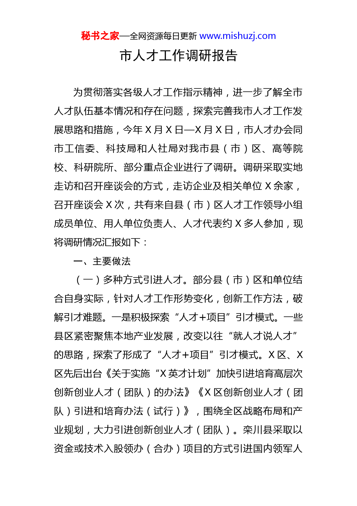 秘书之家—全网资源每日更新www.mishuzj.com市人才工作调研报告为贯彻落实各级人才工作指示精神,进一步了解全市人才队伍基本情况和存在问题,探索完善我市人才工作发展思路和措施,今年X月X日—X月X日,市人才办会同市工信委、科技局和人社局对我市县(市)区、高等院校、科研院所、部分重点企业进行了调研。调研采取实地走访和召开座谈会的方式,走访企业及相关单位X余家,召开座谈会X次,共有来自县(市)区人才工作领导小组成员单位、用人单位负责人、人才代表约X多人参加,现将调研情况汇报如下:一、主要做法(一)多种方式引进人才。部分县(市)区和单位结合自身实际,针对人才工作形势变化,创新工作方法,破解引才难题。一是积极探索“人才+项目”引才模式。一些县区紧密聚焦本地产业发展,改变以往“就人才说人才”的思路,探索了形成了“人才+项目”引才模式。X区、X区先后出台《关于实施“X英才计划”加快引进培育高层次创新创业人才(团队)的办法》《X区创新创业人才(团队)引进和培育办法(试行)》,围绕全区战略布局和产业规划,大力引进创新创业人才(团队)。栾川县采取以资金或技术入股领办(合办)项目的方式引进国内领军人秘书之家—全网资源每日更新www.mishuzj.com才,聘请中国户外运动协会副会长、全国优秀职业经理人X,担任X山滑雪度假乐园总经理,进一步提升了该县的旅游业发展水平。中航锂电公司结合企业整体发展战略,专门推出“人才伯乐计划”,重点吸引电池行业专家级人才、中高端技术专业人才、电池生产高级技能人才,并设立“伯乐奖”,重奖推荐人员,发动社会力量为公司发展聚集优秀人才。二是大力实施“柔性引才”。部分单位结合自身实际,采取灵活方式柔性引才。例如X县注重发挥用人单位主体作用引进人才,天迈传动科技有限公司在北京建立研发中心,以大城市的区位优势吸引7名高层次人才,有力地促进了企业竞争力的提升。万基铝业公司通过柔性引进“博士服务团”,帮助企业攻克技术难关。X科技大学设立兼职教授、客座教授等特需岗位,去年以来先后引进X、X等2名“千人计划”专家在内的多名国内外有较高知名度的高端人才。同时,预备启动“人事代理制度”,不占编制,同工同酬,灵活选拔学校急需人才。X集团聘请10多位院士成立专家咨询委员会,作为企业发展的外脑和智库。三是搭建平台吸引人才。X市通过建立X省社会科学院X分院、智能装备协同创新研究院和产业研发平台,大力吸引智库人才、专业技术人才和产业提升人才。X县克服区位优势不明显的困难,通过引进X集团核心技术团队,建立X浮法玻璃新技术国家重点实验室和X秘书之家—全网资源每日更新www.mishuzj.com省玻璃质量检验监督中心,打造高层次科研平台,吸引科技人才在X长期发展。X公司与中科院微生物所等国内外X多家科研机构合作,通过联合研发项目或共建实验室,使得行业院士、境内外著名科学家成为公司重要的人才资源。四是依托项目建设引进人才。X区依托城轨车辆装备制造、X国龙、通和物流产业园等重大项目吸收人才,近年来引进各类高层次人才X名。五是破除体制机制障碍引才。X县打破体制机制限制,大力实施“百人计划”,计划用X年时间引进X名研究生学历人才,补充到事业单位中,截止目前已引进X名高层次优秀人才。X区采取面向全国高校招聘优秀毕业生的方式,共吸引X名博士、硕士到区直各单位工作,为今后发展储备人才。(二)结合实际培养人才。各县(市)区根据各自经济、资源优势,制定适合自己的育才方式。一是因地制宜,按需培养。X县实行“农业协会+人才”模式,成立了X烟叶协会、X苹果协会等十几个农业专业技术协会,实现农村优秀人才优势互补、强强联合。X县将“十大技能标兵”、“十大乡土能手”作为优秀专业技术人才进行评选。X区大力推进“专业技术人才知识更新工程”,2021年共培训企业技术人员X人次。二是依托平台,借力提升。X区、涧西区以企业研发中心、院士工作站、博士后科研工作站为平台,与国内重点院校共建研究生培养(见秘书之家—全网资源每日更新www.mishuzj.com习)基地、企业就业实践基地为依托,加强与高等院校、科研院所的互惠合作,提升人才素质。X正骨医院先后建立全国骨伤科医师培训基地、博士后科研工作站、国家临床药品研究基地等,取得X项厅局级科研成果,输出了大批优秀人才。三是发挥主体作用、创新培养模式。X公司成立了内部学院,下设药学系、营销系、人力资源系,常年开设培训课程,年人均培训超过50学时,对员工技能提升、管理创新、文化认同等发挥了独特作用。X集团强化人才工程建设,在国内首先设立了“大工匠”高级技能等级,实施“金蓝领工程”,建立了工程技术序列、技能工人序列和管理序列三条职业发展通道。X石化打破固定模式,成立“任满年专家工作室”,让科技领军人才跨部门直接挑选组建团队,形成聚智效应,以需求为导向不断进行技术创新促进企业发展。X实施师徒助理制度,先后为X名新员工确定了指导老师,指导他们学习工作。先后聘用X名优秀青年员工为助理,使他们基层管理岗位上得到考察、培养和锻炼。(三)创新方式服务人才。部分县(市)区和单位能够充分考虑高层才人才的需求,以人为本搞好服务。X县在洛新产业集聚区和X产业集聚区设