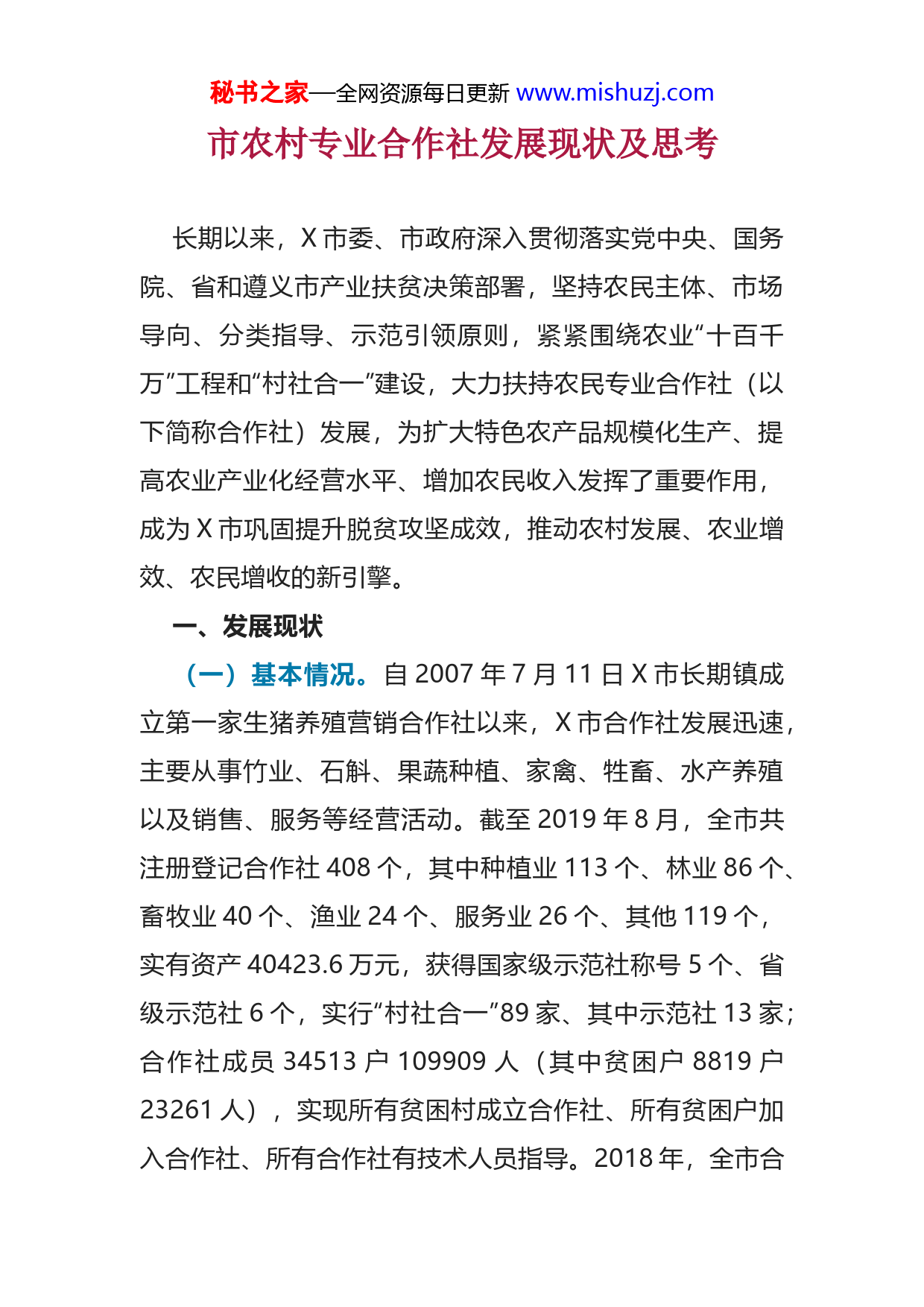 秘书之家—全网资源每日更新www.mishuzj.com市农村专业合作社发展现状及思考长期以来,X市委、市政府深入贯彻落实党中央、国务院、省和遵义市产业扶贫决策部署,坚持农民主体、市场导向、分类指导、示范引领原则,紧紧围绕农业“十百千万”工程和“村社合一”建设,大力扶持农民专业合作社(以下简称合作社)发展,为扩大特色农产品规模化生产、提高农业产业化经营水平、增加农民收入发挥了重要作用,成为X市巩固提升脱贫攻坚成效,推动农村发展、农业增效、农民增收的新引擎。一、发展现状(一)基本情况。自2007年7月11日X市长期镇成立第一家生猪养殖营销合作社以来,X市合作社发展迅速,主要从事竹业、石斛、果蔬种植、家禽、牲畜、水产养殖以及销售、服务等经营活动。截至2019年8月,全市共注册登记合作社408个,其中种植业113个、林业86个、畜牧业40个、渔业24个、服务业26个、其他119个,实有资产40423.6万元,获得国家级示范社称号5个、省级示范社6个,实行“村社合一”89家、其中示范社13家;合作社成员34513户109909人(其中贫困户8819户23261人),实现所有贫困村成立合作社、所有贫困户加入合作社、所有合作社有技术人员指导。2018年,全市合秘书之家—全网资源每日更新www.mishuzj.com作社总收入11841万元,实现盈余1283万元。2019年8月,总收入15460.1万元。其中,合作社自销6588.26万元、企业订单收购收入8476.84万元、其他收入395万元。(二)主要做法及成效。一是加强组织领导,筑牢保障体系。强化组织领导,成立了由市政府牵头的综合领导机构,建立了联席会议制度,把发展合作社作为巩固提升脱贫成效和做好农业农村工作的重要内容,明确专人具体负责合作社工作,印发了《X市发展农民专业合作社助推脱贫攻坚三年行动方案(2017—2019年)》《X市“村社共建”示范点建设实施方案》等文件,形成党政主要领导亲自抓、分管领导具体抓、各职能部门齐抓共管的工作格局,为合作社的发展提供了有力的组织保障。强化宣传培训,由市委组织部、市委宣传部、农业农村局、供销社等部门牵头,组织全市镇村两级干部进行业务培训3400余人次,逐级开展大范围、长时间、多形式的优惠政策宣传动员,极大地调动了群众建社、入社的积极性,仅2018年全市新增合作社100余家,实现所有行政村和贫困户全覆盖。强化管理服务。市(县)、乡镇两级派出157名农技干部,结合“万名农业专家服务‘三农’行动”等活动,推行“点单式”志愿者服务机制,开展“科技助农”、农业污染普查、动物疫病防控、农业安全生产等志愿服务,帮助合作社解决技术应用、成果转化等难点问题,做到对所有贫困村、贫困秘书之家—全网资源每日更新www.mishuzj.com户,重点农业企业、合作社、家庭农场、种养大户,乡镇农技干部、村干部,重点农业产业区域和基地的农户服务“四个全覆盖”。二是厚植优势产业,聚力品牌建设。打好农业“特色牌”。以农业供给侧结构性改革为主线,按照“地域相邻、产业相近、优势互补、合作共赢”的原则,大力推进农业“十百千万”工程(十万亩金钗石斛、百万亩丰产竹林、千万羽乌骨鸡、三万亩生态水产),发展金钗石斛8.63万亩、商品竹林100万亩、年出栏以乌骨鸡为主的家禽1000万羽以上、生态水产养殖2万亩,打造了“信天石斛”“竹叶鱼”“林下乌骨鸡”等一批极具X特色的品牌产品,做大了全市工业的“第一原料车间”。打好工业“升级牌”。整合X市商务局、供销社、国投公司等下属商贸平台,签约盛森、红X、信天石斛等14家X经开区企业,与贵州绿通公司、贵州水投集团旗下渔业公司签订战略协议,构建合作社多层次产销对接渠道,实现“赤货出山”效益最大化。打好旅游“金招牌”。坚持“全域旅游·全景X”理念,以全域旅游井喷增长为契机,全力打好合作社“旅游牌”,打造了转石奇观、望云峰等12个农旅一体化观光园区,开发了望云峰玻璃栈道等旅游体验项目,带动全市7万余人走上旅游路、吃上旅游饭、发上旅游财。三是健全利益联结,助力增收致富。创新利益联结。充分发挥合作社上联龙头企业、下带千家万户的优势,建立“龙头企业+合作社+农秘书之家—全网资源每日更新www.mishuzj.com户”模式,创新“五统一分”经营模式(统一种苗、饲料、技术、标准、销售,分红利),把一家一户分散经营转向适度规模经营,有效增强农产品抵御市场和自然风险的能力极大带动农业主导产业快速发展。进一步健全完善“127”利益联结机制,实现贫困人口种养业利益联结全覆盖,助推农户增收致富。目前,X市金钗石斛产业覆盖贫困人口4050户12604人,人均年收入7000元以上;乌骨鸡产业覆盖贫困人口4560户,带动人均增收400余元;生态鱼产业覆盖贫困户660户2100余人,带动人均增收350元。延长利益链条。用足用活贫困户在产业链、利益链、价值链中的受益环节和份额,深入推进资源变资金、林区变车间、竹农变工人的林业“三变”改革,按照竹农65%、村集体25%、公司10%股权架构,组建竹产业合作社66家,投入林权抵押贷款资金1.48亿元,年支付入股分红和土地流转资金3221万元,对21.3万亩流转竹原料进行集约化经营;全市2万余贫困户每年仅靠出售竹原料和竹笋就户均增收3200元以上,实现脱贫致富。强化产销对接。目前,全市38家规模较大的合作社共流转土地6.64万亩,注册商标10个,与红X