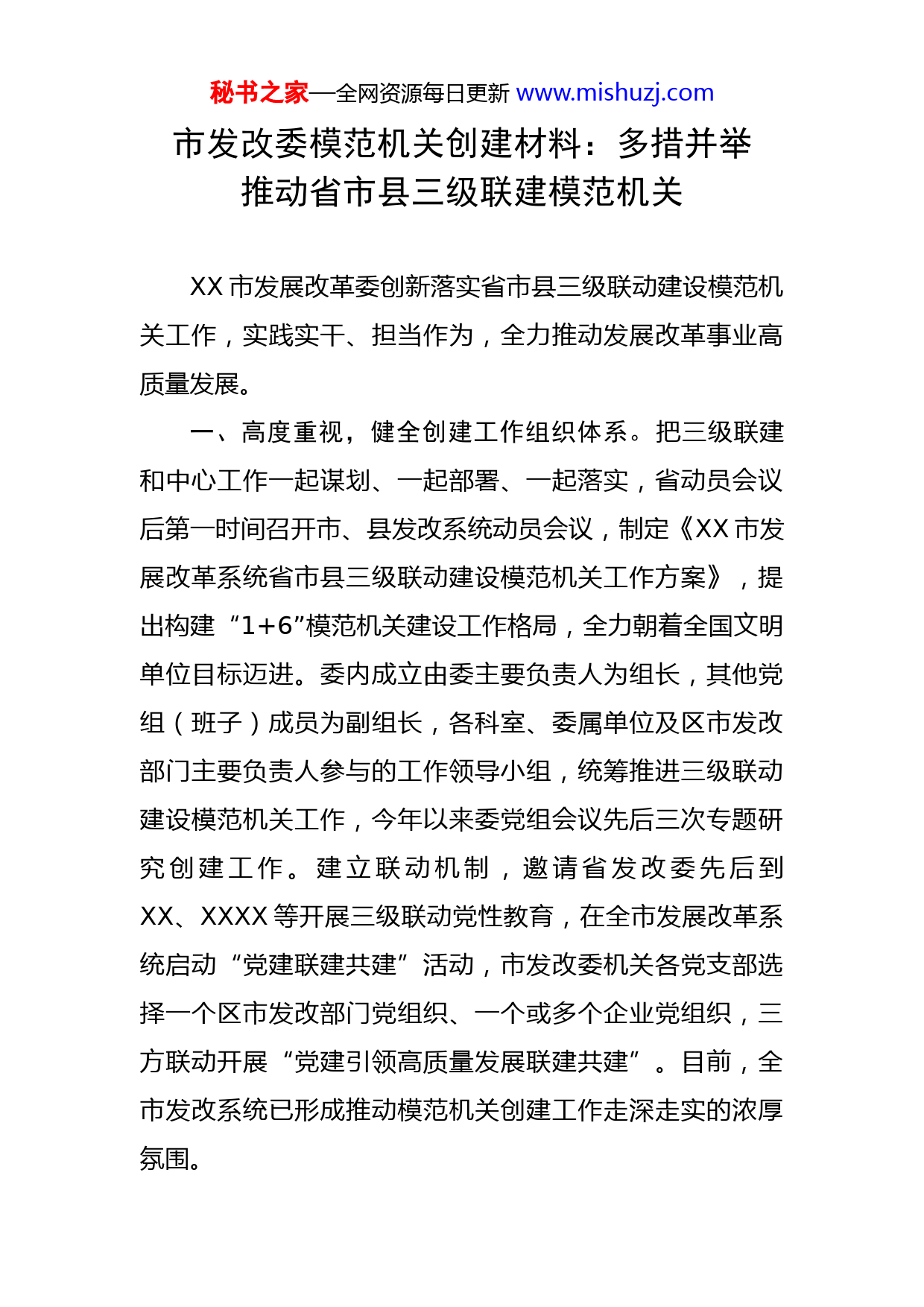 秘书之家—全网资源每日更新www.mishuzj.com市发改委模范机关创建材料:多措并举推动省市县三级联建模范机关XX市发展改革委创新落实省市县三级联动建设模范机关工作,实践实干、担当作为,全力推动发展改革事业高质量发展。一、高度重视,健全创建工作组织体系。把三级联建和中心工作一起谋划、一起部署、一起落实,省动员会议后第一时间召开市、县发改系统动员会议,制定《XX市发展改革系统省市县三级联动建设模范机关工作方案》,提出构建“1+6”模范机关建设工作格局,全力朝着全国文明单位目标迈进。委内成立由委主要负责人为组长,其他党组(班子)成员为副组长,各科室、委属单位及区市发改部门主要负责人参与的工作领导小组,统筹推进三级联动建设模范机关工作,今年以来委党组会议先后三次专题研究创建工作。建立联动机制,邀请省发改委先后到XX、XXXX等开展三级联动党性教育,在全市发展改革系统启动“党建联建共建”活动,市发改委机关各党支部选择一个区市发改部门党组织、一个或多个企业党组织,三方联动开展“党建引领高质量发展联建共建”。目前,全市发改系统已形成推动模范机关创建工作走深走实的浓厚氛围。秘书之家—全网资源每日更新www.mishuzj.com二、党建引领,建设作风优良政治机关。坚持政治机关定位,全面落实从严治党责任,持续开展党建、意识形态、党风廉政建设“三个一”专题教育,实施“书记谈话、主任问计”“主任进科室”等制度,营造风清气正政治生态。倡树“严真细实快”作风,深入开展“能力作风建设年”和“大培训、大练兵、大比武、大竞赛”活动,今年以来举行15场“发改大讲堂”“每周夜校”活动,对市、县发改系统400多名干部开展专业化能力培训。优化10个攻坚突破团队,推行“争分榜”“揭榜挂帅”“发改榜样”评选、“亮点引航工程”等机制,激发干部干事创业热情,2人被市委评为干部执行力先锋标兵。在市发改系统的带动下,各区市也都形成独特创建风格,XX区的“为党旗添彩、为发展建功、为群众造福”,XX区的“吹哨报到”,XX市的“四个模范”等都取得较好成效。三、服务发展,提升模范机关创建实效。随着三级联创活动的持续开展,模范机关创建与中心工作开始深度融合、形成合力,实现“软件”“硬件”质量双提升,有力促进了经济社会发展。围绕政策供给,对接省“稳中求进”高质量发展政策清单,结合XX实际制定“暖心30条”“推动服务业恢复发展”“稳经济促发展”等政策措施,形成了良好的政策联动效应。围绕绿色低碳发展,省、市、县三级合力谋划“双碳”发展路径,丁字湾双碳秘书之家—全网资源每日更新www.mishuzj.com智谷、核风光储一体化等快速起势,省发改委为万华蓬莱低碳新材料产业园等16个项目批复节能审查,XX成为全省唯一连续16年完成能耗下降任务的市。在重点项目方面,XX有186个进入省级重点项目盘子,总投资、年度计划投资均居全省首位。上半年,XX地区生产总值增长4.5%,居全省首位。四、三级联动,推动县域经济高质量发展。借势省、市、县三级联创,积极谋划县域发展,推动联创成果在基层落地、见效。制定出台《振兴县(区)域经济三年行动方案》,开展“对接区市、振兴县域”活动,支持区市推进一批实实在在事项。支持区市主动融入黄河流域生态保护和高质量发展、胶东经济圈一体化发展战略,XXX区、XX—XX一体化发展先行区成功获批,XX综试区建设纵深推进。强化对基层服务,对82户企业开展服务企业专员制度,联合省“四进”工作组持续开展送政策到一线活动。省市县三级联动建设模范机关实惠了基层,最大受益者是县域。XX市发展改革系统将深入贯彻落实省发展改革委三级联动建设模范机关系统培训会议精神,系统推进、上下联动,进一步强化党建引领联动、中心工作联动、能力作风联动、清廉建设联动、文明创建联动、服务基层联动,以党建带创建、创建带队建,努力打造一支具有大开大合思秘书之家—全网资源每日更新www.mishuzj.com维、文武兼备素质、超脱自我境界的“发改铁军”,建设让党中央放心、让人民群众满意的模范机关。