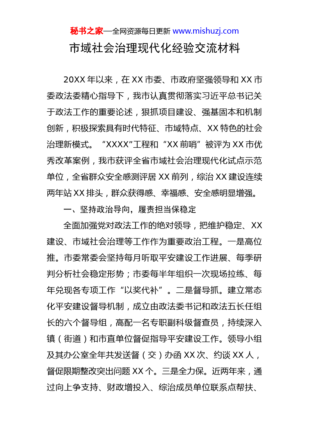 秘书之家—全网资源每日更新www.mishuzj.com市域社会治理现代化经验交流材料20XX年以来,在XX市委、市政府坚强领导和XX市委政法委精心指导下,我市认真贯彻落实习近平总书记关于政法工作的重要论述,狠抓项目建设、强基固本和机制创新,积极探索具有时代特征、市域特点、XX特色的社会治理新模式。“XXXX”工程和“XX前哨”被评为XX市优秀改革案例,我市获评全省市域社会治理现代化试点示范单位,全省群众安全感测评居XX前列,综治XX建设连续两年站XX排头,群众获得感、幸福感、安全感明显增强。一、坚持政治导向,履责担当保稳定全面加强党对政法工作的绝对领导,把维护稳定、XX建设、市域社会治理等工作作为重要政治工程。一是高位推。市委常委会坚持每月听取平安建设工作进展、每季研判分析社会稳定形势;市委每半年组织一次现场拉练、每年兑现各专项工作“以奖代补”。二是督导抓。建立常态化平安建设督导机制,成立由政法委书记和政法五长任组长的六个督导组,高配一名专职副科级督查员,持续深入镇(街道)和市直单位督促指导平安建设工作。领导小组及其办公室全年共发送督(交)办函XX次、约谈XX人,督促限期整改突出问题XX个。三是全力保。近两年来,通过向上争支持、财政增投入、综治成员单位联系点帮扶、秘书之家—全网资源每日更新www.mishuzj.com鼓励企业捐赠等形式,筹措综治经费近XXXX万元,建设了XXX个镇、村综治中心,完成了政法智能化、“雪亮工程”“关爱之家”等系列建设项目,实现了XX小区矛盾纠纷调解室全覆盖。二、坚持强基导向,笃实前行护平安以“XXXX”工程为载体,大抓基层、常抓基础。一是推行“三个一亮点工程”。各镇村、各行业主管部门紧扣治安现状、自然环境和中心工作,相继高标建设了“平安智慧园区”“垸子夜话”“小喇叭大平安”等“一镇一特”;总结推广了“四力二里半”“五品XX”“八民XX”等“一村一品”;联合打造了平安XX大道、好达平安寄递等“一业一新”。二是建设“五大功能性中心”。投入XX万元高标准建设政法应急指挥中心,联网“雪亮工程”ABC类探头XXXX余路,确保与市级平台规范对接,建设数和上线率暂居XX第一;筹措XXX余万元建成铁路护路联防指挥中心,安装护路专用视频监控XX个,应急喇叭XX个,实现与涉铁镇村并网运行;打造“XXX”县域矛盾纠纷联调联处中心,构建跨域矛盾纠纷联动处置机制;整合资源筹建全市矛盾纠纷调处中心,确保行业性、专业性调解组织整体进驻,实现人民调解、行政调解、司法调解一站式服务;打造城区巡防中心,进一步强化街面屯警,提高见警率、处事率。三是开展“十大平安细胞创建”。结合秘书之家—全网资源每日更新www.mishuzj.com党建引领打造了一批平安智慧小区;聚合景点景区打造了一批平安道路;汇合一校一警、专职联防队和护校队,创建了一批平安校园等。20XX年全市共创建、申报、命名“平安细胞”XXX个,形成特色鲜明的“XX之治”。三、坚持问题导向,创新治理优服务聚焦交通压力大、警力不足、服务居民不便捷等社会治理短板,统筹资源,聚力一线,全力推进“平安前哨”。一是建强高效指挥部。高规格成立以市委书记任指挥长的“平安前哨”指挥部,与市委平安办暨市域办合署办公、实体化运行。二是打造集约“综合体”。建立阵地哨、固定哨、流动哨、志愿哨、智能哨,赋予平安哨兵举报违法线索、调解矛盾纠纷、排除安全隐患等六大职责,将政法综治队伍布置在一线、工作延伸到一线、带动广大市民投身平安创建一线。三是创新“三前”工作法。整合一居一民警、一村一辅警和社会义警,实现警力下沉、警地联动、警情快处,推动警务前移;整合一村一法律顾问、一居一法律明白人及村居“五老”人员,发挥法律宣传、法律咨询、法律帮助等作用,推进法务前延;优选基本政法服务和部分便民服务下沉到哨点,实现社管案件“网上办、就近办、马上办”,推行政法服务前置。“平安前哨”试点以来,共发放宣传资料X万余份、受理各类政法综治业务XXXX余件、劝导交通违法行为XXXX余秘书之家—全网资源每日更新www.mishuzj.com起、调解矛盾纠纷XXX余件,辖区警情同比下降XX%、交通事故同比下降XX%、交通亡人事故同比下降XX%。一年来,我市平安建设虽然取得了一些成绩,但与上级要求和兄弟县市相比,还存在诸多不足。下一步,我们将认真贯彻落实此次会议精神,竭力在基层基础上下真功、在市域社会治理上抓创新、在矛盾多元化解上求突破,全力打造XX特色的“平安模式”“治理样板”,努力建设更高质量更高水平的平安XX。