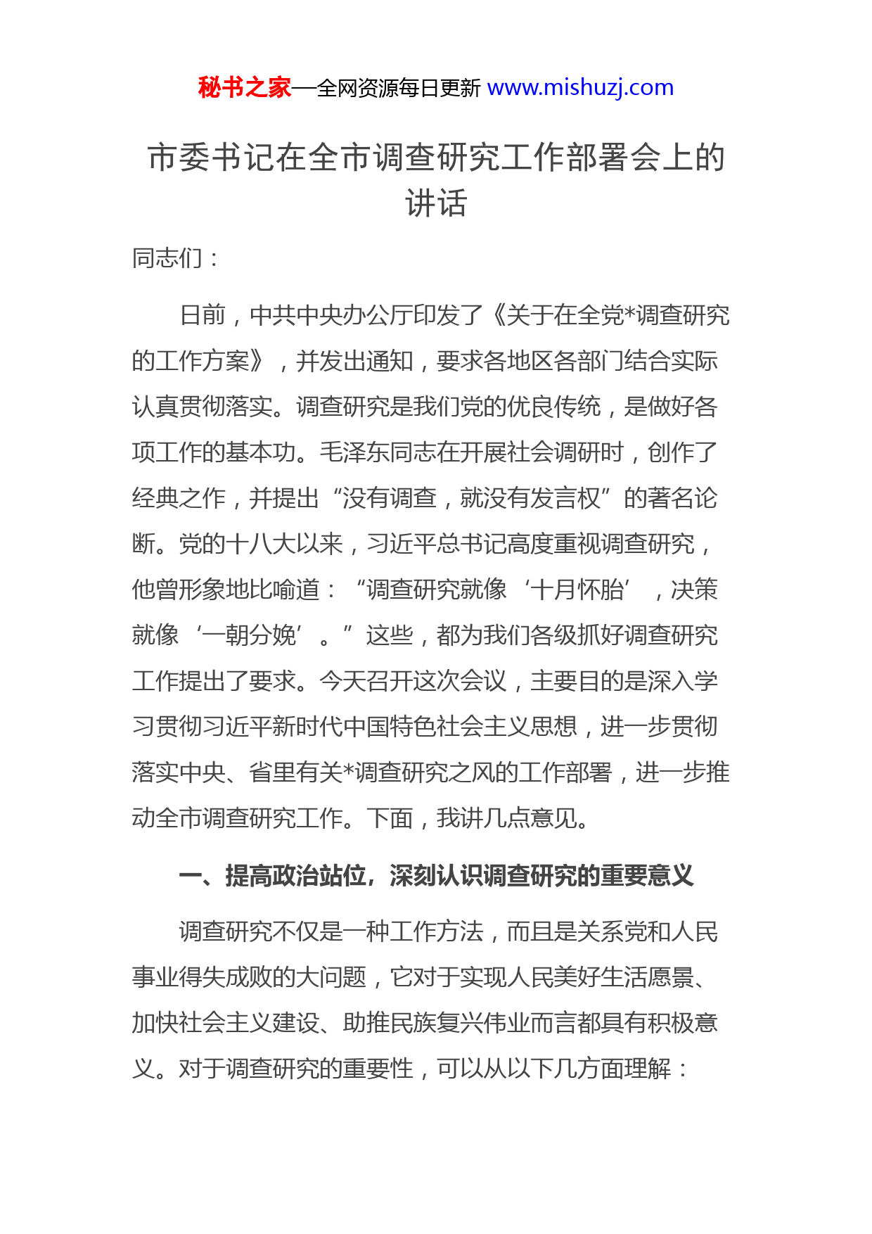秘书之家—全网资源每日更新www.mishuzj.com市委书记在全市调查研究工作部署会上的讲话同志们:日前,中共中央办公厅印发了《关于在全党调查研究的工作方案》,并发出通知,要求各地区各部门结合实际认真贯彻落实。调查研究是我们党的优良传统,是做好各项工作的基本功。毛泽东同志在开展社会调研时,创作了经典之作,并提出“没有调查,就没有发言权”的著名论断。党的十八大以来,习近平总书记高度重视调查研究,他曾形象地比喻道:“调查研究就像‘十月怀胎’,决策就像‘一朝分娩’。”这些,都为我们各级抓好调查研究工作提出了要求。今天召开这次会议,主要目的是深入学习贯彻习近平新时代中国特色社会主义思想,进一步贯彻落实中央、省里有关调查研究之风的工作部署,进一步推动全市调查研究工作。下面,我讲几点意见。一、提高政治站位,深刻认识调查研究的重要意义调查研究不仅是一种工作方法,而且是关系党和人民事业得失成败的大问题,它对于实现人民美好生活愿景、加快社会主义建设、助推民族复兴伟业而言都具有积极意义。对于调查研究的重要性,可以从以下几方面理解:秘书之家—全网资源每日更新www.mishuzj.com(一)开展调查研究,是讲政治、讲大局的根本要求。党的十八大以来,以习近平同志为核心的党中央,高度重视调查研究工作。习近平总书记在一系列讲话和文章中,深入阐释了调查研究的意义、内涵、要求、方法等,形成了系统的调查研究思想,并且身体力行、亲力亲为,为全党做出了表率。中央政治局出台的八项规定,及党的二十大召开后不久,二十届中央政治局审议通过新修订的贯彻落实中央八项规定实施细则,都把“改进调查研究”摆在第一位。近年来开展的党的群众路线教育实践活动、“三严三实”专题教育、“两学一做”学习教育、“不忘初心、牢记使命”主题教育、党史学习教育等专项教育中,都把调查研究作为改进工作作风的重要手段予以重点强调。上级对调查研究的要求还有很多,从以上列举的内容可以看出,调查研究已经提到了事关政治和大局的重要地位。但从近期调度情况看,大部分单位、部门还只是学习传达了有关文会精神,还未正式研究、启动部署开展调查研究工作。这种情况的存在,既有当前任务压头、机构调整涉及到人员调整的客观原因,更有相关单位、部门负责人重视程度不高、统筹安排不到位的主观原因。现在已经到了月下旬,一季度马上就要结束了。各级一定要增强政治敏锐性和政治自觉性,提高政治站位和政治觉悟,从拥秘书之家—全网资源每日更新www.mishuzj.com护“两个确立”的高度,坚决贯彻落实中央、省委省政府和市委市政府关于调查研究的决策部署和工作要求,认真开展调查研究,更好地服务中心工作。(二)开展调查研究,是推进事业改革发展的迫切要求。调查是解决问题的基础,在调查研究的基础上提出解决问题的方法,是我们谋划工作、科学决策的重要手段。19年底,习近平同志在县乡调研中了解到整个乡人口少,梯田面积大,粮食产量低,立即对县里提出要求,“乡是新成立的一个乡,大家要全力支持,要派最强的干部去当书记和乡长”,并对乡的发展指明方向:“第一,乡身处大山之中,造林自不必说,还要种一些经济作物,比如种茶、种果、栽竹子等;第二,这里水资源很丰富,应该勘察一下,看能不能建水库搞水力发电。”乡按照习近平同志的指示修建了水库水电站,既发电又吸收部分劳动力,还把变成了一个旅游景点。党的二十大报告强调:“我们要增强问题意识,聚焦实践遇到的新问题、改革发展稳定存在的深层次问题、人民群众急难愁盼问题、国际变局中的重大问题、党的建设面临的突出问题,不断提出真正解决问题的新理念新思路新办法。”新的征程不可能是一片坦途,必然存在各种可以预料和难以预料的风险挑战,必然会面临许多复杂的新秘书之家—全网资源每日更新www.mishuzj.com情况新矛盾新问题,这就需要我们不断进行调查研究,找到破解矛盾问题的治本之策。比如,如何加快构建新发展格局,着力推动高质量发展?如何实施科教兴国战略,强化现代化建设人才支撑?如何发展全过程人民民主,保障人民当家作主?如此等等,都需要领导干部在党的创新理论指导下,深入实际调查研究,去不断破解发展中难题,为适应新形势、解决新问题提供支撑。(三)开展调查研究,是解决我市当前突出问题的现实需要。近年来,我市发展进入新时代,面临着各种新的问题和挑战:经济回升向好的基础还不稳固,结构性矛盾尚未得到有效解决;各种资源优势尚未得到充分发挥,城市综合竞争力和辐射带动能力还不够强;城乡二元结构矛盾依然突出,农民增收、乡村振兴的难度增大;安全生产、环境保护、食品药品安全等领域还存在薄弱环节;公共服务、教育、医疗、住房等群众关心关切的问题还没有得到妥善解决;政府职能转变还不到位,一些机关工作人员法治意识、服务意识、担当意识不够强,等等。以上问题,更需我们切实提高调查研究能力,厚植人民情怀,在调研中长才干、促发展、作贡献。二、规范工作程序,不断提高调查研究质量和成效秘书之家—全网资源每日更新www.mishuzj.com一直以来,全市各级各部门的调查研究工作紧紧围绕主责主业,立足市情、单位实际,紧盯重点开展破题攻关,较好