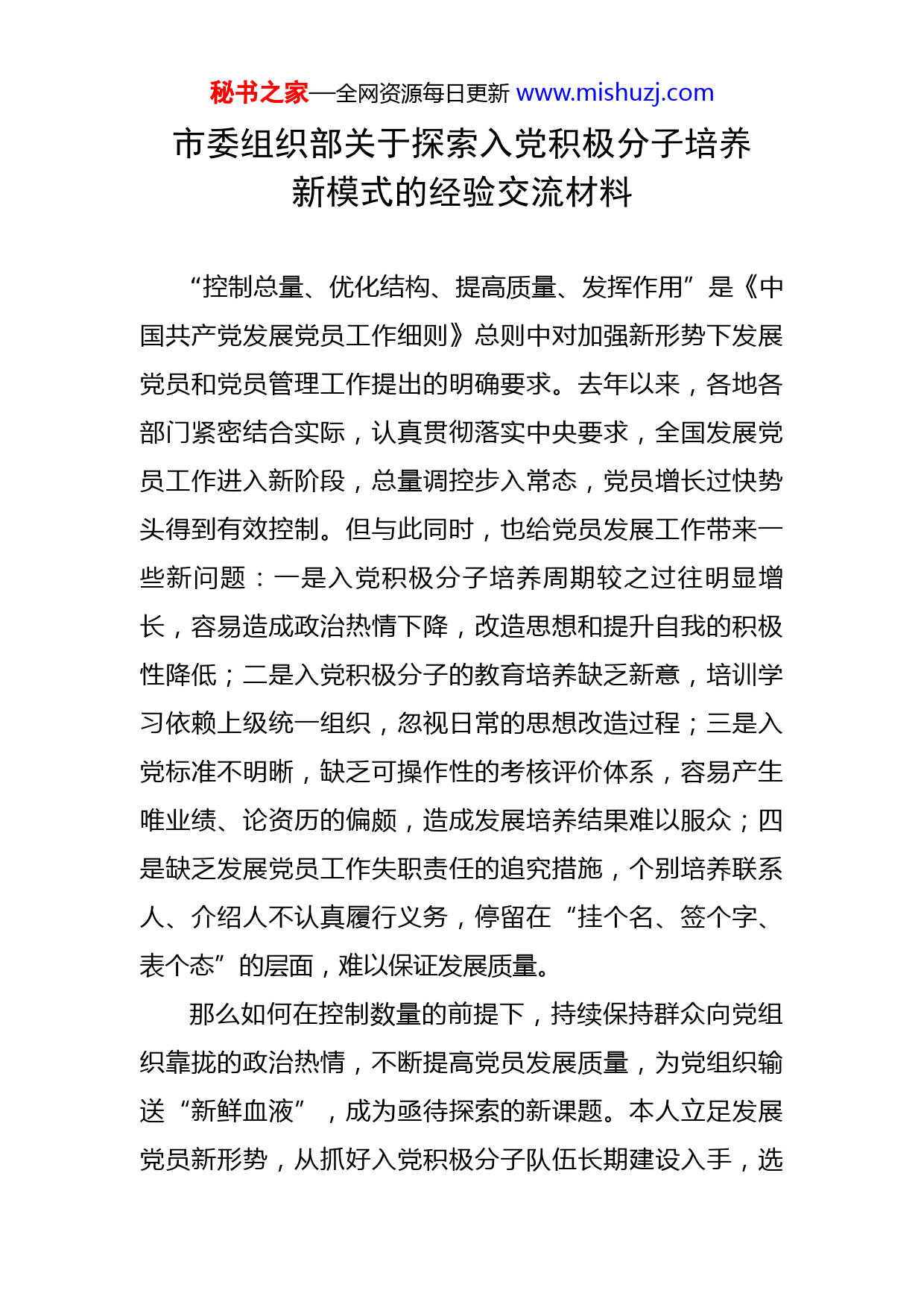 秘书之家—全网资源每日更新www.mishuzj.com市委组织部关于探索入党积极分子培养新模式的经验交流材料“控制总量、优化结构、提高质量、发挥作用”是《中国共产党发展党员工作细则》总则中对加强新形势下发展党员和党员管理工作提出的明确要求。去年以来,各地各部门紧密结合实际,认真贯彻落实中央要求,全国发展党员工作进入新阶段,总量调控步入常态,党员增长过快势头得到有效控制。但与此同时,也给党员发展工作带来一些新问题:一是入党积极分子培养周期较之过往明显增长,容易造成政治热情下降,改造思想和提升自我的积极性降低;二是入党积极分子的教育培养缺乏新意,培训学习依赖上级统一组织,忽视日常的思想改造过程;三是入党标准不明晰,缺乏可操作性的考核评价体系,容易产生唯业绩、论资历的偏颇,造成发展培养结果难以服众;四是缺乏发展党员工作失职责任的追究措施,个别培养联系人、介绍人不认真履行义务,停留在“挂个名、签个字、表个态”的层面,难以保证发展质量。那么如何在控制数量的前提下,持续保持群众向党组织靠拢的政治热情,不断提高党员发展质量,为党组织输送“新鲜血液”,成为亟待探索的新课题。本人立足发展党员新形势,从抓好入党积极分子队伍长期建设入手,选秘书之家—全网资源每日更新www.mishuzj.com取个别基层党支部为试点,对新时期党员培养教育工作新模式进行了初步探索,取得了一定的效果。一、以提高入党积极分子思想政治素质为重点,积极探索学习教育新模式思想建设是党的建设的根本,思想上入党是入党积极分子培养的主要目标之一。基层党支部应坚持以思想政治理论教育为主导,紧扣时代主题,始终坚持把理想信念教育放在首位。(一)多渠道开展学习培训。针对年轻党员干部知识面广、思想活跃的特点,基层党支部在开展思想教育时,应坚持以党章党规和习近平总书记系列重要讲话为基本内容,不断创新和丰富学习的内容、载体,增强思想教育的时代性和吸引力。例如,根据学习内容、主题的不同,分别采取专题辅导、讲座、知识竞赛、演讲比赛等方式,帮助积极分子加深对党史、党规和基本理论的认识;充分利用公众号、微信群等新媒体平台,对时事热点问题进行分析,解读党的路线、方针、政策,帮助入党积极分子在思想上行动上同以习近平同志为核心的党中央保持高度一致。(二)建立思想汇报汇总点评制度。基层党支部不仅要定期与入党积极分子谈话,还要对其思想汇报给予足够的重视,可建立思想汇报汇总点评制度,推动思想汇报工秘书之家—全网资源每日更新www.mishuzj.com作规范化。入党积极分子培养联系人除要仔细阅读、做好思想汇报的信息记录之外,还要进行点评,并及时向入党积极分子反馈。基层党支部应定期要求入党积极分子培养联系人汇报入党积极分子的思想动态以及培养情况,将责任压到实处。(三)搭建思想政治教育实践平台。基层党组织通过积极搭建不同平台,能使入党积极分子如实表达自己的思想,以便及时了解掌握入党积极分子的思想动态,并做好实时引导。一是党支部建设平台。邀请入党积极分子直接参与支部的活动和部分组织工作,如参与策划组织入党宣誓、主题党日活动等,使他们更直接地了解和熟悉党内生活,并在党内生活的环境熏陶中加深对党的了解,增强党性观念,推动其向党组织靠拢。二是党课平台。通过半年一次指定或自定义主题党课,调动入党积极分子的积极性,不仅为其提供自我展示平台,更重要的是让入党积极分子通过深层次参与,深刻理解党的基本知识和党员的职责使命,不断改造其世界观、价值观和人生观。三是党员互助平台。多种方式结合,搭建入党积极分子与优秀共产党员的互助交流平台。例如,为入党积极分子精心挑选培养联系人,通过密切沟通交流,让培养联系人成为其良师益友和领路人;设置党员示范岗,邀请入党积极分子观摩学习;为入党积极分子树立榜样,以座谈会、讲座等形式秘书之家—全网资源每日更新www.mishuzj.com进行交流,用优秀党员的先进事迹感染、鼓舞入党积极分子,促使他们坚定入党信念。二、以提升入党积极分子综合素质为基础,积极探索全方位培养新模式对入党积极分子的素质要求,不仅看其政治方向、政治立场和思想道德品质,还要看其能、勤、绩、廉等各方面表现。基层党支部在实际工作中,应注重抓好“三个结合”,全面提升入党积极分子综合素质。(一)坚持理论与实践相结合。一方面,引导入党积极分子沉下心学习理论,将入党积极分子纳入支部、党小组日常政治学习中,组织系统学习《中国共产党章程》和党的基本知识,提高入党积极分子的理论水平;另一方面,引导入党积极分子沉下身参与实践,通过组织参观爱国主义教育基地、反腐倡廉教育基地,参与青年志愿者、社会公益等活动,加强社会实践锻炼,通过理论和实践相结合,进一步锤炼入党积极分子的党性修养。(二)坚持品德与能力相结合。一方面,引导入党积极分子向身边的先进典型学习,学习老党员们的优秀品质,继承和发扬党员队伍的优良传统;另一方面,激励入党积极分子在日常工作中发挥先锋作用,推动他们刻苦钻研专业知识和技能,进一步提升入党积极分子的业务能力和服务水平。秘书之家—全网资源每日更新www.mishuzj.com(三)坚持整