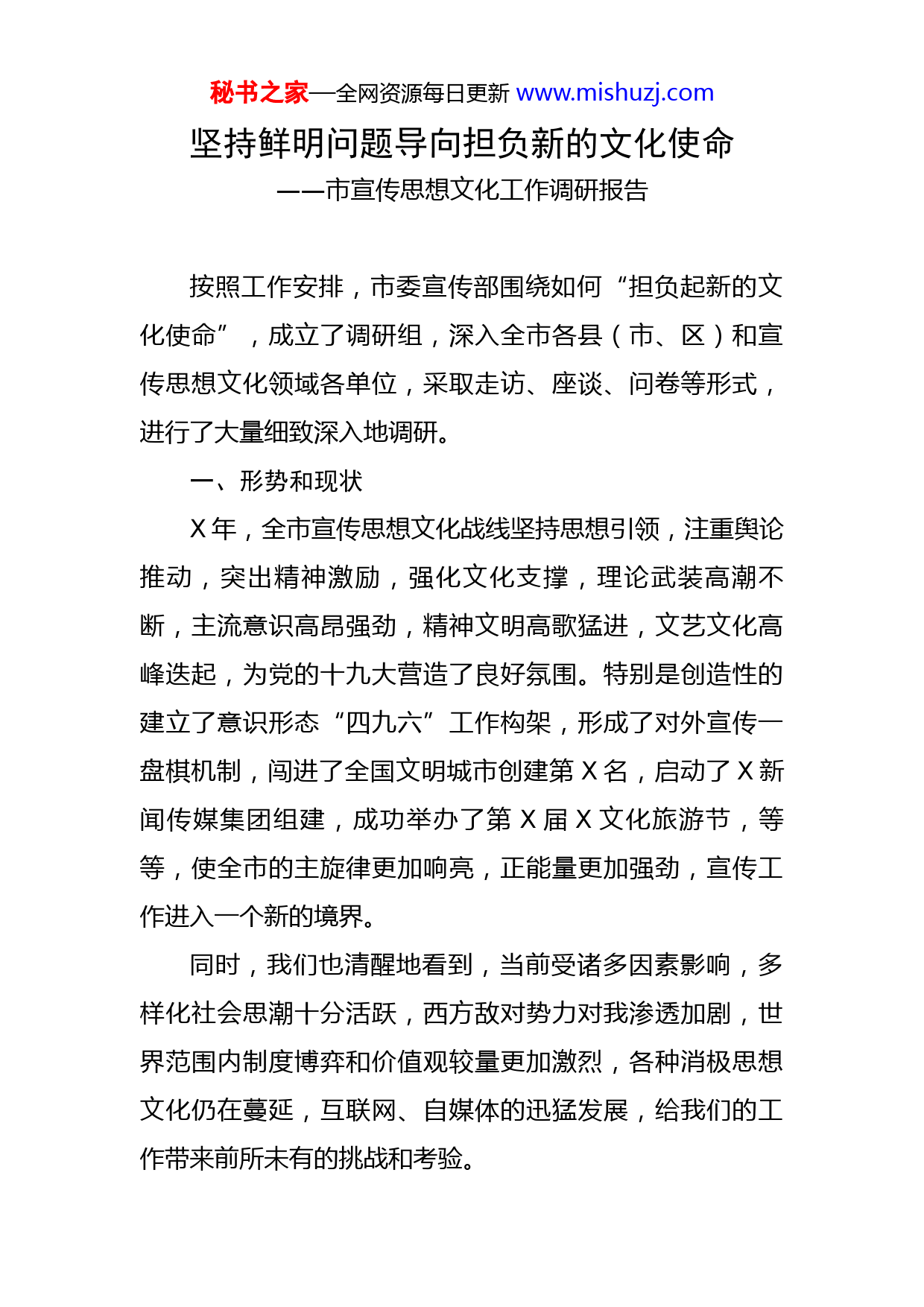 秘书之家—全网资源每日更新www.mishuzj.com坚持鲜明问题导向担负新的文化使命——市宣传思想文化工作调研报告按照工作安排,市委宣传部围绕如何“担负起新的文化使命”,成立了调研组,深入全市各县(市、区)和宣传思想文化领域各单位,采取走访、座谈、问卷等形式,进行了大量细致深入地调研。一、形势和现状X年,全市宣传思想文化战线坚持思想引领,注重舆论推动,突出精神激励,强化文化支撑,理论武装高潮不断,主流意识高昂强劲,精神文明高歌猛进,文艺文化高峰迭起,为党的十九大营造了良好氛围。特别是创造性的建立了意识形态“四九六”工作构架,形成了对外宣传一盘棋机制,闯进了全国文明城市创建第X名,启动了X新闻传媒集团组建,成功举办了第X届X文化旅游节,等等,使全市的主旋律更加响亮,正能量更加强劲,宣传工作进入一个新的境界。同时,我们也清醒地看到,当前受诸多因素影响,多样化社会思潮十分活跃,西方敌对势力对我渗透加剧,世界范围内制度博弈和价值观较量更加激烈,各种消极思想文化仍在蔓延,互联网、自媒体的迅猛发展,给我们的工作带来前所未有的挑战和考验。秘书之家—全网资源每日更新www.mishuzj.com对此,我们必须自觉担负起新的文化使命,自觉以习近平新时代中国特色社会主义思想为指引,在实践创造中进行文化创造,在历史进步中实现文化进步,以坚定的文化自信促进社会主义文化繁荣兴盛,大力提升X软实力,为在谱写新时代中国特色社会主义X篇章中做出应有贡献。二、问题与难点对照这些新形势、新要求、新部署,全市宣传思想文化工作还存在一些新难点、新问题不容忽视。(一)理论武装引向深入还不到位。一是思想认识不到位。少数领导干部认为工作就是最好的学习,存在以业务代替理论学习、以干代学现象;有的领导干部以工作忙为借口,抱怨没有时间学习,工作和学习矛盾较突出;一些机关干部虽然对加强理论学习都有正确的认识,但却存在口头上重视、行动上轻视的现象,理论“学习无用论”还有一定市场。二是理论宣讲不到位。理论宣讲“上下一般粗”的现象比较普遍,理论阐释多,联系实际少,尤其是联系基层干部群众思想实际、工作实际和接受能力少,符合群众需要、感兴趣的东西少。三是制度机制不到位。部门各管一段,存在着党委中心组与基层党组织学习两张皮现象,还没有把理论学习列入个人考核机制,市直、县直机关、各乡镇、中心组学习制度不够完善,情况掌握较秘书之家—全网资源每日更新www.mishuzj.com少,仅限于年终考核时查看了解一些学习情况。四是学以致用不到位。理论联系实际的意识不强,理论学习仅限于表面了解、字面理解,缺乏深入思考、融会贯通。理论研究脱离实际的“空说空论”较多,能够把理论和实际紧密结合起来回答现实问题的优秀理论成果较少。(二)意识形态工作主导权还没有牢牢把握。一是对意识形态工作极端重要性认识不足。尤其是在普通党员干部中,认识模糊、有局限,对意识形态工作重视不够,在基层表现更为严重,意识形态工作开展难度大,平时工作安排部署多,但检查落实少。二是意识形态研判有时流于形式。有关部门对意识形态工作存在思想固化,认识偏差,重视不够,认为意识形态工作主要是宣传部门的事情,工作中还存有与己无关、高高挂起的心态,对研判工作有时还存在被动应付的现象。三是农村意识形态阵地占领不牢。少数农村党员信仰缺失、信念动摇、信心不足,农村干部自身马列主义素养不足,部分同志不敢与群众讲理想、讲信念、讲道理,随着农民群众求知、求健、求乐、求美的要求越来越高,部分群众文化娱乐生活相对贫乏,导致一些宗教乃至邪教趁机争夺人心、争夺群众、争夺阵地。四是网上意识形态斗争日趋复杂。网民对于社会领域、民生领域问题的关注度明显提高,对于政府职能部门的工作和表现有着更为严苛的要求,尤其是对于本地发秘书之家—全网资源每日更新www.mishuzj.com生的重要舆情、媒体关切、突发事件等更加关注,迫切需要回应。然而,我们在这些方面做的与公众的期盼仍然还有差距。(三)舆论宣传效果还不理想。一是对内宣传创新不够。采访报道没有很好地坚持走基层、转作风、改文风,一线工作往往是蜻蜓点水,浅尝辄止,新闻稿件缺乏吸引力、感染力和影响力,对于全市重大题材的新闻宣传,电视报道的连续性、系统性不足;平面媒体有影响、有深度的稿子不多,给人留下印象深刻的栏目不多。二是对外宣传品牌不硬。传统媒体与新兴媒体融合度不高,存在“传不上去、传不下去、传不出去”的问题。特别是随着传统媒体和新媒体的加速融合,全媒体时代的外宣报道渠道和平台明显增加,近年来全媒体外宣报道的数量增加了,但质量高的新闻产品却不多。三是网络宣传运用不够。对微信、微博等新媒体的运用和管控缺乏科学有效的手段,特别是在新媒体的运营中,专业人员缺乏,技术力量不足,导致新媒体运营存在诸多问题。(四)核心价值观培育还没有真正落细落小落实。一是创建机制运行不畅。精神文明建设涵盖各领域各行业,涉及各部门各单位,需要全市上下齐心同创,合力共建。但一些部门单位对待精神文明建设工作,依然是“说起来重要、干起来次要、忙起来不要”,横向到边、纵向到秘书之家—全网资源每日