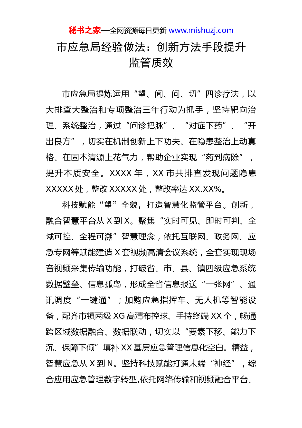 秘书之家—全网资源每日更新www.mishuzj.com市应急局经验做法:创新方法手段提升监管质效市应急局提炼运用“望、闻、问、切”四诊疗法,以大排查大整治和专项整治三年行动为抓手,坚持靶向治理、系统整治,通过“问诊把脉”、“对症下药”、“开出良方”,切实在机制创新上下功夫、在隐患整治上动真格、在固本清源上花气力,帮助企业实现“药到病除”,提升本质安全。XXXX年,XX市共排查发现问题隐患XXXXX处,整改XXXXX处,整改率达XX.XX%。科技赋能“望”全貌,打造智慧化监管平台。创新,融合智慧平台从X到X。聚焦“实时可见、即时可判、全域可控、全程可溯”智慧理念,依托互联网、政务网、应急专网等赋能建造X套视频高清会议系统,全套实现现场音视频采集传输功能,打破省、市、县、镇四级应急系统数据壁垒、信息孤岛,形成全省信息报送“一张网”、通讯调度“一键通”;加购应急指挥车、无人机等智能设备,配齐市镇两级XG高清布控球、手持终端XX个,畅通跨区域数据融合、数据联动,切实以“要素下移、能力下沉、保障下倾”填补XX基层应急管理信息化空白。精益,智慧应急从X到N。坚持科技赋能打通末端“神经”,综合应用应急管理数字转型,依托网络传输和视频融合平台、秘书之家—全网资源每日更新www.mishuzj.com综合安防管理等平台再现立体化、精细化安全生产实景图像,接入XX家工贸重点企业视频监控,带班值守领导每逢双日对企业夜间作业进行实时盯防,通过平台一键录屏功能将现场作业人员违规操作记录登记备案。运行至今,已发现不安全行为XX处,辅助立案处罚X起,切实解决了安全生产“夜长莫及”问题。目前,正在积极拓展其他领域实时视频接入,着力以“千里眼”助智慧应急实现从“X”到“N”的科技腾飞。倾听建议“闻”需求,探索服务型监管模式。当好“顾问”,跑腿代办不歇脚。聚焦疫情难点、企业堵点,组建专业化“帮代办”队伍,集中为XX余家企业、XX项依申请事项提供网办咨询、帮代办和提前预约服务,依据项目开工、许可到期时间等,为重点企业开通“绿色通道”,提供定制化审批、平台代申请服务,减少重复递交材料XX%以上、压缩时限达XX%以上,真正实现许可办理“面对面”到“肩并肩”的转变。当好“参谋”,开源节流破难题。秉承“乡镇吹哨、部门报到”代言人理念,发扬“有求必应,无事不扰”店小二精神,选派市镇两级XX名应急干部组建服务企业专员队伍,包保XX家危化、工贸等重点企业,摸实底、察实情,聚焦“六个一”服务机制,为企业“量体裁衣”,实行“点对点、面对面”全流程服务。截至目前,已全部完成建一个安全管理微信秘书之家—全网资源每日更新www.mishuzj.com群、当一天一线产业工人、讲一堂安全生产教育课、搞一次事故隐患排查,XX人已开展一次安全生产座谈会,X人举办一次观摩学习活动,切实实现从“企业找部门”到“部门找企业”、从“室内坐政”到“上门行政”的根本性转变。畅通渠道“问”一线,打通多维度监管通道。“优”机制,提高监管效率。适应监管形式、创新监管模式、优化监管手段,首创工贸领域“红橙黄蓝”四色分级分类管理模式,以镇区街道摸排底数为蓝本,健全完善“一企一档”和监管信息“一张表”,绘制工贸领域安全风险空间分布图,建立安全生产分级管控数据库,按照企业不同风险等级,对XXX家评分企业实行差异化、精准化动态监管。截止目前,已明确红区企业XX家、橙色XXX家、黄色XXX家、蓝色XXX家。“扩”手段,凝聚监管合力。按照“扩面、重奖”原则,先后制发《关于推行安全生产有奖举报“吹哨人”制度的实施意见》《关于做好有奖举报宣传工作的通知》等系列文件,深入推进“吹哨人”制度落实,通过XXXXX电话举报、网络举报、信函举报、走访举报等多元方式鼓励引导群众职工积极参与、踊跃举报身边隐患。全面实行安全生产有奖举报公告牌制度,在全市重点企业显眼位置张贴有奖举报公告牌,明确举报电话、举报上限金额,切实以举报渠道送“货”上门助力一线职秘书之家—全网资源每日更新www.mishuzj.com工有效发挥“吹哨人”监督作用。XXXX,共有XXX余家企业兑现了隐患举报奖励,奖励人数XXX人次,奖励金额XX余万元。未雨绸缪“切”症结,强化预防式监管实效。夯整治基础,筑牢“四梁八柱”。坚持“治未病”理念,推动治理模式由部门单一监管向“政府购买服务、企业落实整改、部门监督管理”综合监管模式倾斜,突出运用“专家+服务”诊断手段,聘请XXXX人次省市专家组成专业队伍,深入企业生产车间、仓库运输现场及重大危险源等场所进行“地毯式”详细检查,建立健全风险隐患“定标、对标、达标”闭环管理机制,拓展排查整治生产经营单位XXXX家,发现问题隐患XXXX处,切实用服务赢得尊重、带动整改。聚宣教合力,激活“一池春水”。以打造“XX应急管理”融媒体矩阵为切入点,深入推进微信公众号、抖音、今日头条等新媒体平台宣传推广,综合运用“云直播”“云课堂”等形式,邀请专家开播授课X次。强化“以教赋能、以考促干、以赛敦行”方式运用,善用安全课堂、安全“五进”、安全学校等多元化形式,累计培训X.X余万人,打造“五进”示范点XX处,组织XXXX余人次开展“安全宣传咨询日”、“安全之星”评选、“金海杯”知识竞赛、“八抓XX项”