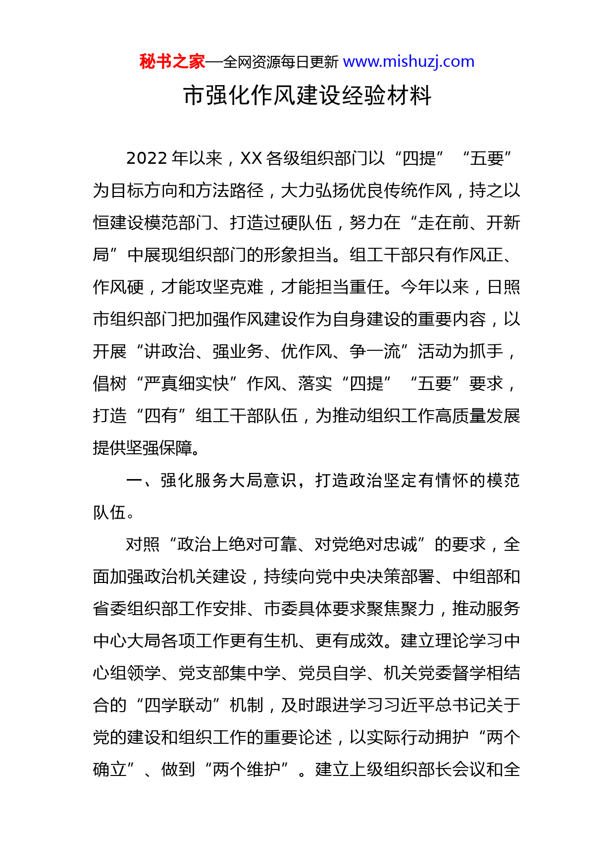 秘书之家—全网资源每日更新www.mishuzj.com市强化作风建设经验材料2022年以来,XX各级组织部门以“四提”“五要”为目标方向和方法路径,大力弘扬优良传统作风,持之以恒建设模范部门、打造过硬队伍,努力在“走在前、开新局”中展现组织部门的形象担当。组工干部只有作风正、作风硬,才能攻坚克难,才能担当重任。今年以来,日照市组织部门把加强作风建设作为自身建设的重要内容,以开展“讲政治、强业务、优作风、争一流”活动为抓手,倡树“严真细实快”作风、落实“四提”“五要”要求,打造“四有”组工干部队伍,为推动组织工作高质量发展提供坚强保障。一、强化服务大局意识,打造政治坚定有情怀的模范队伍。对照“政治上绝对可靠、对党绝对忠诚”的要求,全面加强政治机关建设,持续向党中央决策部署、中组部和省委组织部工作安排、市委具体要求聚焦聚力,推动服务中心大局各项工作更有生机、更有成效。建立理论学习中心组领学、党支部集中学、党员自学、机关党委督学相结合的“四学联动”机制,及时跟进学习习近平总书记关于党的建设和组织工作的重要论述,以实际行动拥护“两个确立”、做到“两个维护”。建立上级组织部长会议和全秘书之家—全网资源每日更新www.mishuzj.com市重要会议精神落实清单制度,及时梳理相关部署要求,实行清单化管理、项目化推进,确保任务落地落实。围绕全市产业发展等重点任务,部署开展干部能力提升工程、十强产业链高质量发展系列专题培训等工作,出台《组织部门助推产业强链方案》等文件,不断提高组织工作服务大局的贡献度。二、培养求解优解思维,打造创新求进有担当的活力队伍。坚持把改革创新作为组织工作的不竭动力和重要方法,树立一流标准,突出问题导向,以求解优解思维推动问题解决、带动工作提升。设立改革创先争优“勇胜榜”,组织各科室(中心)提报创新课题,将日照组织工作创新奖评选扩大到市直部门单位和市属国有企业,营造创新引领发展、塑造优势的浓厚氛围。开展寻标对标活动,各科室(中心)分别在国内和省内选定1个学赶对象,制定对标计划,推动每项工作在现有基础上有明显提升、在全省力争最好位次。建立重点工作会商机制,定期对重点难点问题进行系统梳理,部领导带领业务科室逐项研究解决,锤炼本领能力、促进工作提升。三、发扬科研攻关精神,打造学习实践有本领的专业队伍。倡树“努力就是能力、敬业才能专业、干成才是真秘书之家—全网资源每日更新www.mishuzj.com行”的理念,引导组工干部把工作当成学问来研究,甘于坐冷板凳、下苦功夫,持续提升专业精神、专业能力。开展“党内法规学习年”“专家讲、青年说、大家谈、现场观”等学习活动,倡导“每天多学一小时”,引导组工干部争做“政策通”“活字典”。强化实践锻炼,选派机关干部参与上下挂职、“第一书记”等任务,推动部机关内部制度化轮岗交流,激发干部队伍活力。健全制度机制,搭建OA办公平台督查系统,完善“11710”督查工作机制,建立备案、审批事项“马上就办、限时办结”制度,全面提升组织工作落实效率。四、落实从严从实要求,打造务实清廉有底气的过硬队伍。以部风部史学习教育为重点,持续深化部机关文化建设,推动组工干部以更加求真务实的姿态做好组织工作,以更加严肃严格的要求树立良好形象。大兴“基层调研、开门服务”之风,完善部领导联区县、科室联乡镇等制度,建立考察识别干部常态化调研、基层组织建设蹲点调研、人才会客厅等机制,推动组工干部多到服务对象群体中去,深入掌握情况,广泛听取意见,有针对性地改进提升工作。倡树“严是真严、爱是真爱”理念,严格落实全面从严治党各项要求,制定出台《从严治部“六必须、六不得”》,完善重点岗位监督措施,常态化开展廉政警示秘书之家—全网资源每日更新www.mishuzj.com教育,坚守组工干部清正廉洁本色;加强对组工干部的关心关爱,建立“清风传家”集中谈心谈话等制度,打造适应新时代组织工作高质量发展需要的骨干队伍。