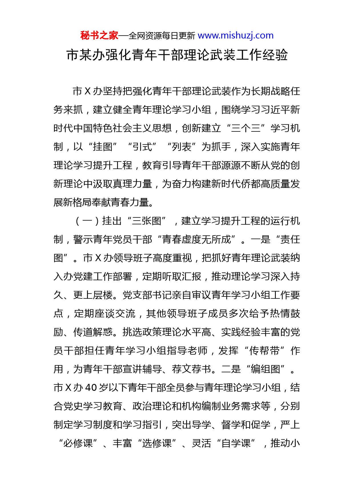 秘书之家—全网资源每日更新www.mishuzj.com市某办强化青年干部理论武装工作经验市X办坚持把强化青年干部理论武装作为长期战略任务来抓,建立健全青年理论学习小组,围绕学习习近平新时代中国特色社会主义思想,创新建立“三个三”学习机制,以“挂图”“引式”“列表”为抓手,深入实施青年理论学习提升工程,教育引导青年干部源源不断从党的创新理论中汲取真理力量,为奋力构建新时代侨都高质量发展新格局奉献青春力量。(一)挂出“三张图”,建立学习提升工程的运行机制,警示青年党员干部“青春虚度无所成”。一是“责任图”。市X办领导班子高度重视,把抓好青年理论武装纳入办党建工作部署,定期听取汇报,推动理论学习深入持久、更上层楼。党支部书记亲自审议青年学习小组工作要点,定期座谈交流,其他领导班子成员多次给予热情鼓励、传道解惑。挑选政策理论水平高、实践经验丰富的党员干部担任青年学习小组指导老师,发挥“传帮带”作用,为青年干部宣讲辅导、荐文荐书。二是“编组图”。市X办40岁以下青年干部全员参与青年理论学习小组,结合党史学习教育、政治理论和机构编制业务需求等,分别制定学习制度和学习指引,突出导学、督学和促学,严上“必修课”、丰富“选修课”、灵活“自学课”,推动小秘书之家—全网资源每日更新www.mishuzj.com组学习情况台账化管理,形成了“覆盖全面、牵动有力、活跃鲜明”的学习体系。三是“路线图”。突出青年干部主体地位,鼓励在青年学习小组当“主角”,充分调动学习党的创新理论的积极性主动性和创造性。制定《市X办青年理论学习提升工程实施方案》,明确学习重点和方法措施,强化评选结果使用,让爱学习、学习好的年轻干部成长得更快更好。(二)引入“三式学”,丰富学习提升工程的方式方法,力促青年党员干部“腹有诗书气自华”。一是分享式学习。借助“编干编讲”平台,每月安排1名业务骨干讲授业务知识、分享工作经验,每期由办领导或者实践经验丰富的业务骨干点评,做到一讲一评,确保全员讲、全员听、全员受教育。定期开展小规模、互动式、接地气的理论学习交流活动,已开展青年理论学习小组学习5期,引导青年党员干部用初心砥砺信仰、用理论坚定信念、用实践增强信心,促使“比学赶超”的学习氛围蔚然成风。二是沉浸式学习。充分利用各县(市、区)得天独厚的红色资源,组织青年党员干部就近就便、线上线下开展沉浸式学习。在纪念五四运动100周年之际,组织青年干部到新会梁启超故居纪念馆感受“少年强则国强,少年独立则国独立”的进取精神。为提升党性教育实效,组织到“党史小屋”、陈少白故居、“青青读书会”旧址等红色教育基秘书之家—全网资源每日更新www.mishuzj.com地开展主题党日活动;用好用活“粤学党史·粤爱党——打卡X红”小程序,进入“云场馆”开展“云学习”,身临其境般感受革命前辈的爱国爱民情怀,激励党员干部传承红色基因,发扬革命传统。三是互动式学习。每月开展组内研学,定期讨论小组成员的研学报告,汇报读书情况,交流思想感悟,及时发现解决问题;每季度开展组外联学,与市委老干部局、市委党史研究室等单位青年党员干部开展联合调研、培训交流等活动。不定期开展“微调研”,组织青年干部开展涉及教育、医疗、基层治理等社会热点调研,形成“微调研”报告。(三)列明“三份表”,做好学习提升工程的激励保障,激励青年党员干部“知行相资以为用”。一是“保障表”。制定《青年理论学习小组读书活动安排表》,列明“必读书目”和“选读书目”。拉出各类提升培训、各类读书活动、学习沙龙、青年理论宣讲等活动。同时,在党建工作中预留理论学习、党性锻炼和机关政治文化建设等专项经费,为开展活动创造条件、提供保障。二是“成果表”。实施青年理论学习提升工程,引导青年干部在机构编制工作主战场、改革攻坚第一线、落实“六大工程”最前沿勇挑重担,积极参与疫情防控、乡村振兴、文明城市创建等实践活动,经受实践锻炼考验,推动青年干部深化、消化、转化理论学习成果。三是“考评表”。探索建秘书之家—全网资源每日更新www.mishuzj.com立科学有效的述学评学考学机制,通过组织学习竞赛、评选学习成果等方式,发挥组织优势,把青年学习小组工作与年轻干部成长锻炼结合起来,把学习情况纳入党员评议、公务员平时考核的内容,对学习表现突出的年轻干部予以通报表扬,在评先评优中予以优先考虑,激励青年党员干部在干中学、在学中干。