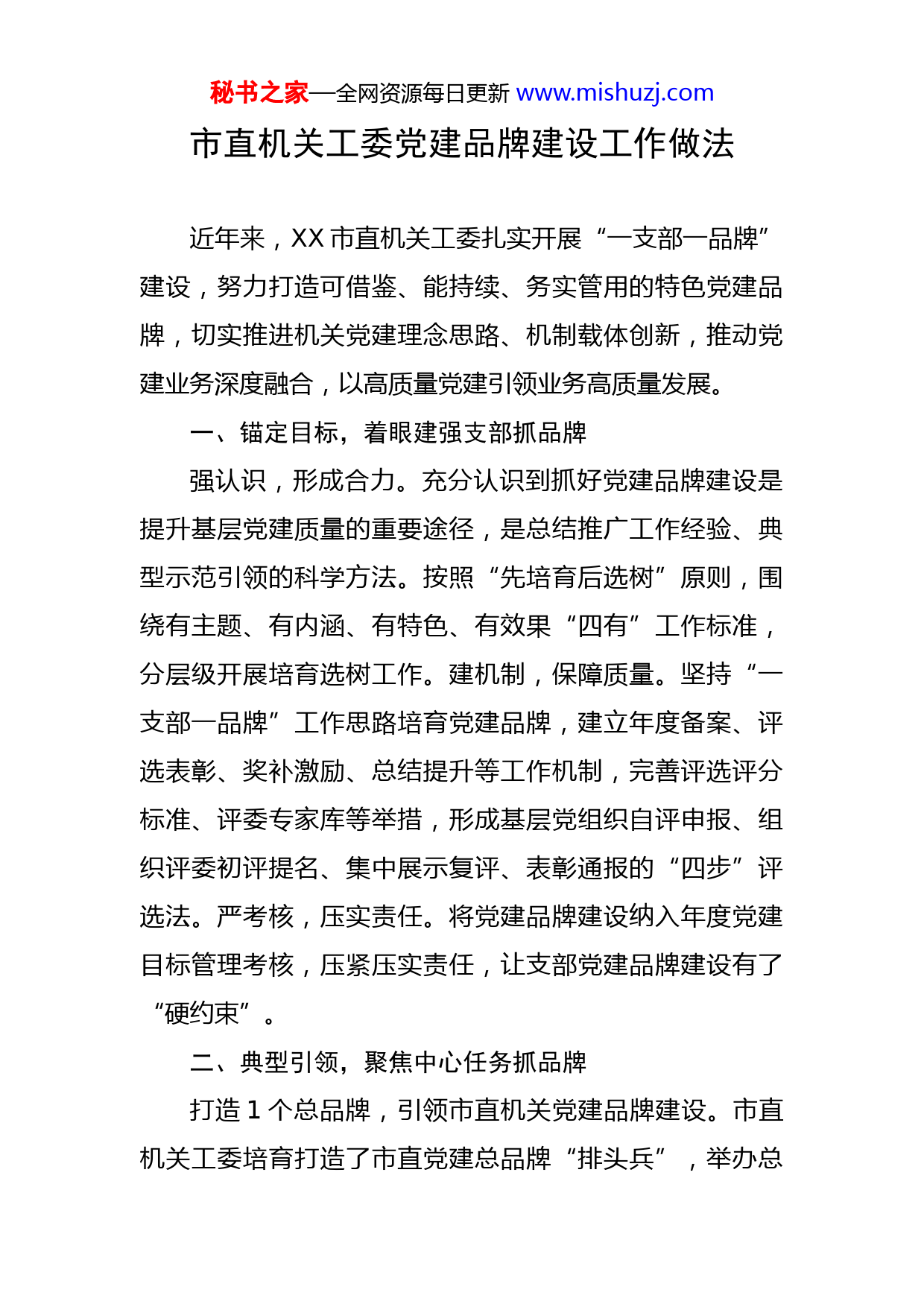 秘书之家—全网资源每日更新www.mishuzj.com市直机关工委党建品牌建设工作做法近年来,XX市直机关工委扎实开展“一支部一品牌”建设,努力打造可借鉴、能持续、务实管用的特色党建品牌,切实推进机关党建理念思路、机制载体创新,推动党建业务深度融合,以高质量党建引领业务高质量发展。一、锚定目标,着眼建强支部抓品牌强认识,形成合力。充分认识到抓好党建品牌建设是提升基层党建质量的重要途径,是总结推广工作经验、典型示范引领的科学方法。按照“先培育后选树”原则,围绕有主题、有内涵、有特色、有效果“四有”工作标准,分层级开展培育选树工作。建机制,保障质量。坚持“一支部一品牌”工作思路培育党建品牌,建立年度备案、评选表彰、奖补激励、总结提升等工作机制,完善评选评分标准、评委专家库等举措,形成基层党组织自评申报、组织评委初评提名、集中展示复评、表彰通报的“四步”评选法。严考核,压实责任。将党建品牌建设纳入年度党建目标管理考核,压紧压实责任,让支部党建品牌建设有了“硬约束”。二、典型引领,聚焦中心任务抓品牌打造1个总品牌,引领市直机关党建品牌建设。市直机关工委培育打造了市直党建总品牌“排头兵”,举办总秘书之家—全网资源每日更新www.mishuzj.com品牌发布会,展现市直机关党建工作特点,示范引领品牌建设;围绕“双争一创一建设”核心内容,打造党员教育活动联系点等系列工作阵地,丰富品牌内涵,推进深度融合。依托3个载体,培育学习教育平台。面向党务干部创立“打造新高地、争当排头兵”局长报告厅,分享党建引领业务创优案例;面向青年党员建立“宛陵初心学堂”,厚植党员身份意识,砥砺为民初心;面向专职党务工作者打造“宛陵初心微宣讲团”,力促专职党务干部争做明白人、内行人、贴心人。做实N个支部品牌,实践党建品牌创建路径。去年制发《关于全面推进“一支部一品牌”建设工作的通知》,提出3年全覆盖目标。目前已有330个党支部备案,占70%,评选了优秀党建品牌46个,涵盖执纪执法、为民服务、机关办公、文化宣传、群团建设等多个领域,品牌培育呈现“特色化、多元化、融合化”的良好态势。三、注重实践,坚持实际效果抓品牌扩大品牌参与,搭建平台评选品牌。持续做实党建品牌评选工作,由原来两年评选1次调整为每年1次,完善评选机制办法,邀请基层党务干部全过程参与,开展年度“十佳党建品牌”评选,隆重举办“十佳党建品牌”评选决赛。增加品牌份量,评先评优注重品牌。将党建品牌建设纳入示范党支部评比等评先评优活动中,营造先进工作秘书之家—全网资源每日更新www.mishuzj.com必有党建品牌,表彰先进必讲党建品牌的良好氛围。展示品牌形象,专题报道宣传品牌。推动党员活动室悬挂党建品牌标识,展示品牌内涵,增强组织生活品牌氛围。连续两年在网站、微信公众号等开辟专栏,宣传报道优秀党建品牌40余个,集中展现党建创新创优成果。