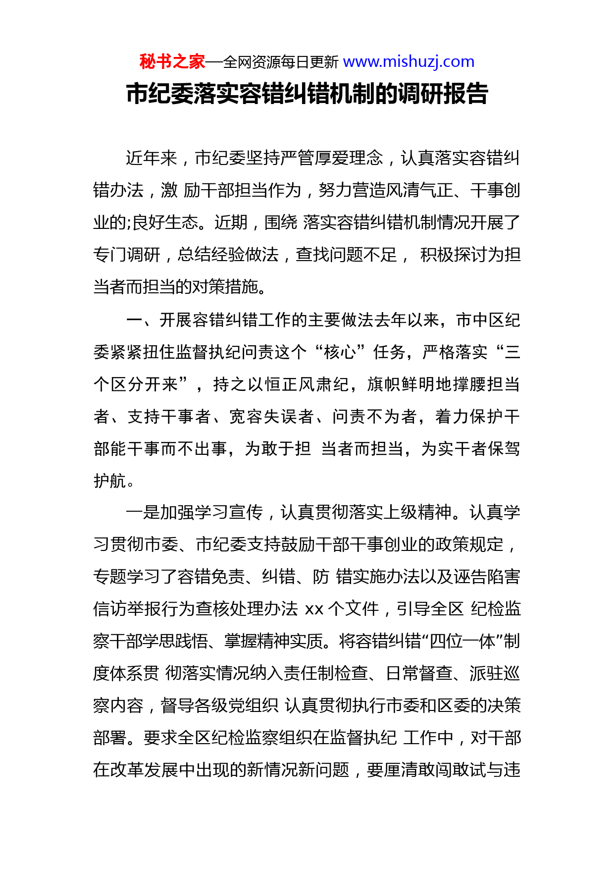 秘书之家—全网资源每日更新www.mishuzj.com市纪委落实容错纠错机制的调研报告近年来,市纪委坚持严管厚爱理念,认真落实容错纠错办法,激励干部担当作为,努力营造风清气正、干事创业的;良好生态。近期,围绕落实容错纠错机制情况开展了专门调研,总结经验做法,查找问题不足,积极探讨为担当者而担当的对策措施。一、开展容错纠错工作的主要做法去年以来,市中区纪委紧紧扭住监督执纪问责这个“核心”任务,严格落实“三个区分开来”,持之以恒正风肃纪,旗帜鲜明地撑腰担当者、支持干事者、宽容失误者、问责不为者,着力保护干部能干事而不出事,为敢于担当者而担当,为实干者保驾护航。一是加强学习宣传,认真贯彻落实上级精神。认真学习贯彻市委、市纪委支持鼓励干部干事创业的政策规定,专题学习了容错免责、纠错、防错实施办法以及诬告陷害信访举报行为查核处理办法xx个文件,引导全区纪检监“”察干部学思践悟、掌握精神实质。将容错纠错四位一体制度体系贯彻落实情况纳入责任制检查、日常督查、派驻巡察内容,督导各级党组织认真贯彻执行市委和区委的决策部署。要求全区纪检监察组织在监督执纪工作中,对干部在改革发展中出现的新情况新问题,要厘清敢闯敢试与违秘书之家—全网资源每日更新www.mishuzj.com规违纪的界限,把先行先试中出现的失误与我行我素的违规违纪区分开来,把推动发展的无意过失与谋取私利的违规违纪区分开来,为敢于改革创新、勇于担当实干的干部营造良好环境。二是注重教育预防,促党员干部不犯或少犯错误。充分发挥教育的导“”“向、约束和激励作用,标红线、明底”“”线、筑防线,教育引导党员干部知敬畏、存戒惧、守底“”线,强化不想腐的自觉。深入学习宣传党纪条规,编印“”了《党章党规学习手册》,采用市中清风微信公众号等新媒体宣传方式“”和量身定制学习模式,使党员干部熟知党纪条规的规定,真正了解敢闯敢干、敢于用权与懒做滥为、违纪违规的明确界限。升级打造了市中区廉政教育基地,召开了全区领导干部警示教育大会,组织了预防职务犯罪警示教育宣讲活动,组织全区党员干部观看了《永不停歇的征程》《江林案警示录》等教育片,开展了区直机关廉政教育月活动。深入街道社区、扶贫领域、重点项目指挥部,组织预防职务犯罪上门送教xx余场,以发生在身边的典型案例为素材,以案示警、以案明纪,从源头上保护好一线干部。三是坚持抓早抓小,让小错小过者改过自新。牢固树“立严管厚爱不腻”“”爱理念,运用四种形态特别是第一种形态,抓早抓小,抓常抓严,对苗头性、倾向性问题,以秘书之家—全网资源每日更新www.mishuzj.com及过去看似习以为常的轻微问题,利用谈话提醒、约谈批评、函询诫勉等方式,早发现、早提醒、早处置,做到小过即问、“”小错即纠,防止问题由小拖大,最大程度的保护干部。对那些犯有小错小过的干部绝不是一纸处分了之,而是通过谈心谈话、回访教育等方式,帮助分析情况、找出原因、“”打开心结,给予问题干部改过自新的机会,让在未来发展中走的更稳更远。例如,,某局副局长因履职不到位受到问责后,端正态度、知耻后勇,在组织部门征求意见中给予充分肯定,影响期满后重新得到重用。今年以来,因工作作风不实、履职不力、失职失责等,批评教育、约谈诫勉xx人次,组织处理、党纪轻处分xx人次,前两种形态占比xx%,实现了全面从严、挺纪在前的实践效果。四是严格审查把关,为敢于担当者撑腰壮胆。对信访举报、明查暗访、集中检查、区委巡察等发现的问题线索,特别是对身处重点工作、重大项目一线以及民生领域党员“干部的问题线索,深入进行调查核实,认真落实三个区分”开来要求,全面分析原因和性质,客观看待和正确处理,把握好惩处和保护的关系,严格对照容错免责四种情形,对符合免责条件的落实好容错纠错机制,宽容干部在改革创新、担当实干中的失误。同时,坚持好干部标准,在选人用人、评先树优等方面,加强廉洁勤政情况的审查监督,秘书之家—全网资源每日更新www.mishuzj.com“”“严格规范廉政意见回复程序,坚决防止带病提拔带病表”彰,调动干部干事创业积极性。今年以来,对拟提拔重“”用、拟推荐两代表一委员、拟评优树先等人选回复廉政意见xx余人次,真正使那些想干事、能干事的干部选出来、用起来,让那些投机取巧、走歪门邪道的刷下去。“五是从严监督问责,使不为乱为者受到惩处。树立强化正风肃纪、营造风清气正良好生态就是对担当实干者最”大支持的理念,做实监督执纪问责职责,发挥好纪检监察“”机关在服务保障品质市中建设中的职能作用,为重点工作推进助力护航。例如,在拆违拆临工作中,出台了《关于在推进区拆违拆临工作中加强监督执纪问责工作的意见》和工作方案,深入一线现场督导;在环保督查期间,成立追责问责工作组,24小时值班备勤;在扶贫攻坚领域,组织专门督查组,挨家挨户走访摸排情况。同时,充分发挥再监督、再检查、再督促职能作用,强化对项目建设、扶贫攻坚、扫黑除恶、环保生态治理等重点工作的监督检查,严肃纠治重大决策部署落实不到位、形式主义官僚主义、失职失责等问题,严厉问责追究有关责任。今年以来,共实施问责xx起,问责党组织xx个,问责党员
