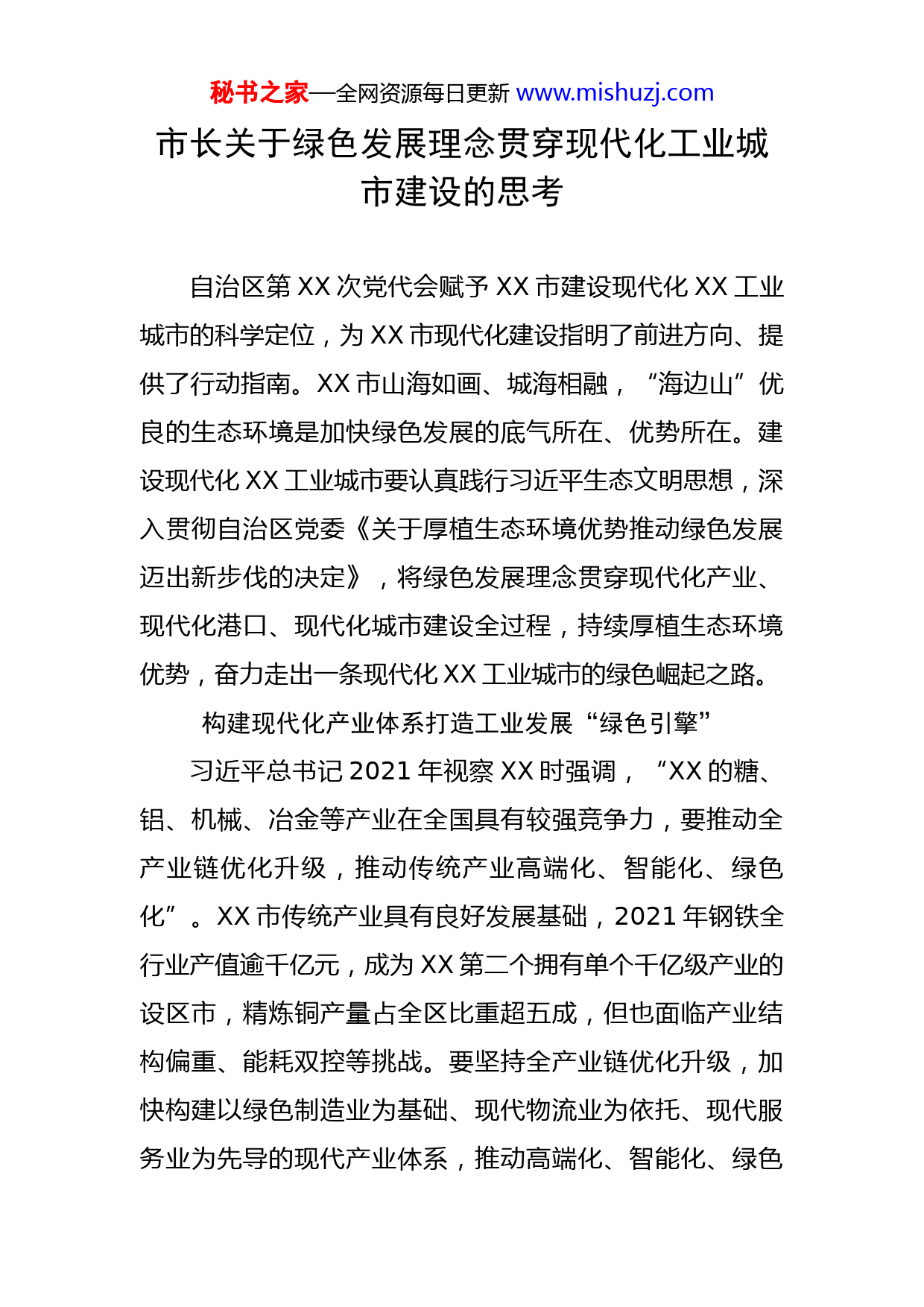 秘书之家—全网资源每日更新www.mishuzj.com市长关于绿色发展理念贯穿现代化工业城市建设的思考自治区第XX次党代会赋予XX市建设现代化XX工业城市的科学定位,为XX市现代化建设指明了前进方向、提供了行动指南。XX市山海如画、城海相融,“海边山”优良的生态环境是加快绿色发展的底气所在、优势所在。建设现代化XX工业城市要认真践行习近平生态文明思想,深入贯彻自治区党委《关于厚植生态环境优势推动绿色发展迈出新步伐的决定》,将绿色发展理念贯穿现代化产业、现代化港口、现代化城市建设全过程,持续厚植生态环境优势,奋力走出一条现代化XX工业城市的绿色崛起之路。构建现代化产业体系打造工业发展“绿色引擎”习近平总书记2021年视察XX时强调,“XX的糖、铝、机械、冶金等产业在全国具有较强竞争力,要推动全产业链优化升级,推动传统产业高端化、智能化、绿色化”。XX市传统产业具有良好发展基础,2021年钢铁全行业产值逾千亿元,成为XX第二个拥有单个千亿级产业的设区市,精炼铜产量占全区比重超五成,但也面临产业结构偏重、能耗双控等挑战。要坚持全产业链优化升级,加快构建以绿色制造业为基础、现代物流业为依托、现代服务业为先导的现代产业体系,推动高端化、智能化、绿色秘书之家—全网资源每日更新www.mishuzj.com化发展,让“绿”的底色更靓、“新”的特色更显、“金”的成色更足。全产业链打造“绿色制造”。制造业是XX工业的基石,但目前XX市高耗能产业比重仍偏大。推动产业链优化升级是促进现代产业体系建设发展的必由之路。要坚持产业结构低碳化、生产过程清洁化、能源利用高效化,新引进项目必须争取以最先进的工艺、最高端的设备、最小的能耗和排放实现最大的产值和效益,打造好钢铁、有色金属、绿色新材料、粮油食品加工等四个千亿级支柱产业和电子信息、能源、装备制造、生物医药、县域轻工业等五个百亿级特色优势产业。加大技改升级投入,延链降耗提产值,推进全流程超低排放,建好盛隆钢材生产基地等三个千亿级绿色智能钢铁基地。促进现代服务业与先进制造业融合,以平台经济推动产业由散到聚、以聚促变,使优势产业加快由生产基地向总部基地升级。持续集聚更多延链补链强链项目,让XX产业这片“热带雨林”,“乔木”参天、“灌木”茁壮、“草木”葱茏。全要素集成“园区平台”。XX市现有园区产业集聚度、功能配套度和绿色显示度不高,大而不强、多而不专、专而不精。要坚持“万亩千亿、集约高效”,全面提高园区发展能级。加快XX经开区等园区循环经济发展和数字化改造,打造一批绿色园区、智慧工厂,构建统一集秘书之家—全网资源每日更新www.mishuzj.com约、云网融合的园区管网及数字信息基础设施,加快规上工业企业数智化改造全覆盖。高水平建设国际医学开放试验区等重大开放平台,参与国际绿色医疗合作,引进集聚更多行业头部企业、灯塔项目、隐形冠军,打造国际医学合作新高地。全生命周期优化“营商环境”。好的营商环境犹如一根扁担挑两头,一头挑着城市的发展,一头挑着企业的未来。要围绕企业生长全周期服务,建设资本、技术、人才和物流“四个要素市场”,打造企业生存沃土环境;持续深化“放管服”改革,打造企业办事不求人的高效政务服务环境;大力营造“有为才会有位”的干事创业氛围,构建亲清政商关系,打造风清气正的政治生态;恪守法治底线、诚信原则、公正标尺,打造公平公正公开的法治环境,让良好的营商环境成为XX的亮丽名片。打造现代化港口码头畅通城市发展“血脉经络”绿色是建设现代化XX工业城市的鲜明底色,交通是流淌在城市里的灵动风景。要以建设现代化港口为龙头,构建绿色、安全、高效的现代综合交通运输体系,使港、船、路、人、货、车各畅其流,让城市在畅通流动中吐故纳新、清新美丽。让港口绿色智慧。港口是建设现代化XX工业城市的立市之基、兴市之本。振兴港口、发展运输业,要把握好定秘书之家—全网资源每日更新www.mishuzj.com位,增强适配性,坚持绿色发展、生态优先。推动港口绿色转型升级,促进绿色港口与智慧港口融合发展,提升生产调度自动化水平,提高“海铁联运”等多式联运效率和水平,推进绿色物流配送等发展;持续加强港口粉尘污染治理,大力建设港口岸电、充(换)电、加气(LNG)等一批清洁能源装备设施。加快企沙南港区整体建设,推动建设XX万吨级码头及航道等一批重大港航项目,提升XX门户港核心竞争力。积极引进世界级航运集团、物流企业、供应链企业,加快建设集大宗散货码头、集装箱码头、渔港码头、旅游码头于一体的西南地区全业态现代化港口,让“黄金岸线”释放“黄金效益”。让交通绿色畅达。加快绿色发展,交通要当好“先行官”。将绿色交通理念贯穿XX交通规划、设计、建设、运营全过程,加快防东铁路、国门大道等一批通边达海交通项目建设,加强对沿线风景和滨海资源的保护,推广使用公路节能照明、橡胶沥青节能技术等新工艺、新材料,让公路因“绿”更美。加快县县通“双高速”、通铁路,建设市域“半小时交通圈”,构建新能源智慧城市公共交通体系,让市民出行更便捷、更绿色。畅通交通“微循环”,以自然风景长廊、生态富民走廊为脉络,织密慢行绿道网,推