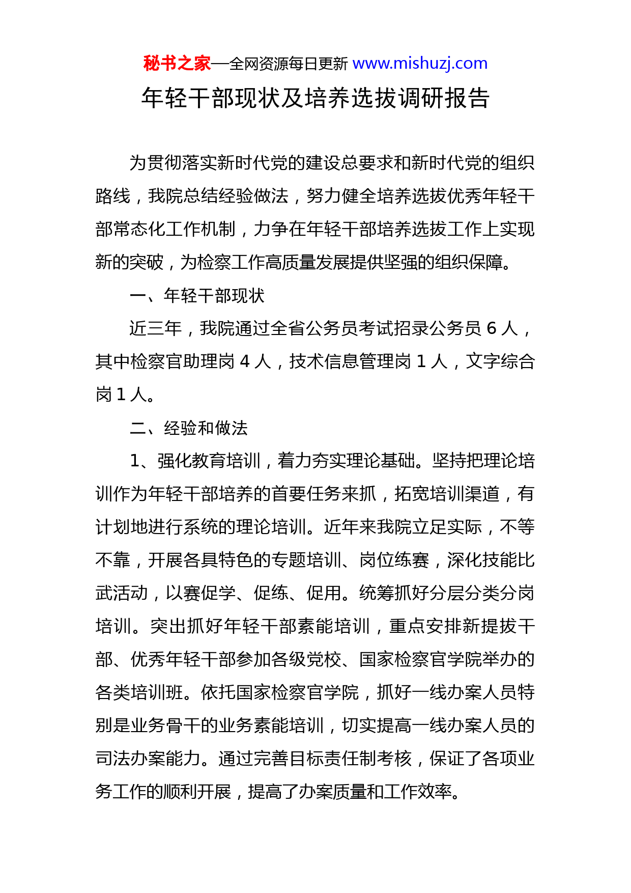 秘书之家—全网资源每日更新www.mishuzj.com年轻干部现状及培养选拔调研报告为贯彻落实新时代党的建设总要求和新时代党的组织路线,我院总结经验做法,努力健全培养选拔优秀年轻干部常态化工作机制,力争在年轻干部培养选拔工作上实现新的突破,为检察工作高质量发展提供坚强的组织保障。一、年轻干部现状近三年,我院通过全省公务员考试招录公务员6人,其中检察官助理岗4人,技术信息管理岗1人,文字综合岗1人。二、经验和做法1、强化教育培训,着力夯实理论基础。坚持把理论培训作为年轻干部培养的首要任务来抓,拓宽培训渠道,有计划地进行系统的理论培训。近年来我院立足实际,不等不靠,开展各具特色的专题培训、岗位练赛,深化技能比武活动,以赛促学、促练、促用。统筹抓好分层分类分岗培训。突出抓好年轻干部素能培训,重点安排新提拔干部、优秀年轻干部参加各级党校、国家检察官学院举办的各类培训班。依托国家检察官学院,抓好一线办案人员特别是业务骨干的业务素能培训,切实提高一线办案人员的司法办案能力。通过完善目标责任制考核,保证了各项业务工作的顺利开展,提高了办案质量和工作效率。秘书之家—全网资源每日更新www.mishuzj.com2、突出实践锻炼,着力提高综合能力。近年来,我院推行渗透式培训模式。完善政治轮训制度,注重将思想政治教育、价值观培育等融入各种培训,综合运用专家讲座、现场体验、学员论坛等方式,增强思想政治教育的感染力吸引力。认真落实“领导干部上讲台”、“检察官教检察官”制度,教育培训中各业务条线要安排业务骨干开展授课,重点围绕政策解读、理论阐释、实务操作等开展培训。加强一专多能“全科”检察官建设,择优选取有基础、有潜力的年轻干部到先进检察院跟班见学。1月份我院择优选取了一名检察官和一名检察官助理到江岸区检察院跟班见学。充分利用网络培训开放、灵活的优势,牢固树立“互联网+”理念,健全“网络+培训”机制,增强运用互联网、大数据、云计算等现代信息技术开展培训的能力。三、存在的突出问题1、经费短缺,工资福利待遇偏低,难以吸引外来人才。由于工资待遇偏低等原因,难以留住优秀人才,此种情况导致基层一线办案骨干不足,制约了检察业务工作进一步发展。2、学历较高但经历比较单一。由于公务员录用“每进必考”,我院年轻干部均受过高等教育,但同时,我院录用的公务员大多为无工作经历,短期内难以担当大任,这秘书之家—全网资源每日更新www.mishuzj.com直接影响到了工作安排和人员调配。3、思维活跃但容易出现浮躁心态。年轻干部年富力强,有朝气激情,善于打破常规,推陈出新,有思路,有办法,使干部队伍充满了生机和活力。但也会有一些年轻干部存在心浮气躁心态,因没有及时得到提拔,工作激情减退,甚至自暴自弃,随波逐流。四、加强优秀年轻干部培养选拔的办法举措1、转变思想观念,树立年轻干部用人导向。凝聚思想共识,营造有利于年轻干部成长进步的工作环境和良好氛围。进一步强化思想认识,真正从内心深处打破论资排辈、求全责备等陈腐观念的束缚,努力形成对年轻干部负责就是对党的事业负责、支持年轻干部成长就是支持事业长远发展的共识。2、加强教育培训,提高年轻干部理论素养。教育是年轻干部成才的基础,在年轻干部的培训选拔上,要坚持教育培训先行,对年轻干部进行全面、系统、深入的理论培训,才能不断提高其政治素质和能力素质。一是强化党性修养和作风养成。把职业精神作为教育培训的重要内容,认真组织学习检察官职业道德基本准则、职业行为基本规范,通过教育熏陶、模范引领,深化以武铁检察精神和愿景为重要内容的职业道德和职业纪律教育,引导年轻干部牢固树立忠诚、为民、担当、公正、廉洁的职业理念,养秘书之家—全网资源每日更新www.mishuzj.com成崇尚法治、恪守良知、理性公允的职业品格。针对队伍建设在不同时期出现的不同重点和难点,发现倾向性苗头,及时采取措施,实施针对性教育。确保年轻干部时刻保持清醒的头脑,坚定正确的政治方向,经受得住各种风浪的考验。二是加强理论业务培训。根据新时期年轻干部的特点和培养方向,制定具体的培养计划,采取举办专题培训、参加上级调训、组织在线学习等形式,全面提高年轻干部的政治理论素养,打牢理想信念的根基。充分利用各种培训资源,拓宽培训渠道,按照缺什么补什么的原则,有计划有步骤地组织开展各方面知识培训,不断提高年轻干部的大局观和综合业务素质。3、从严监督管理,保证年轻干部健康成长。一是大胆选拔优秀的年轻干部担任领导职务,让他们在实践中不断成长进步,抓好年轻干部队伍的滚动发展。二是建立中层干部储备机制,加强对中层干部的教育、管理和培养,有意识的把年轻中层干部放到压力大、竞争强的岗位上进行锻炼,使之尽快成长为检察机关的中坚力量。三是建立年轻干部管理数据库。详细记载年轻干部的基本情况、主要简历、奖惩情况、培训情况、考核情况和民主测评推荐情况,掌握年轻干部的成长轨迹,通过建档立制,有效完善全程监督,作为培养、管理和选用的依据之一,防止带“病”提拔、带“病”上岗。秘书之家—全网资源每日更新www.mishuzj.com4、以从优待检为保障,健全年轻