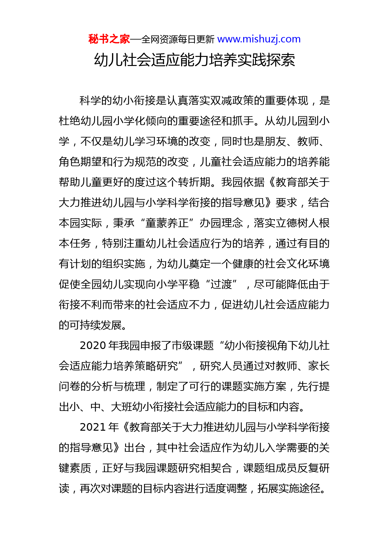 秘书之家—全网资源每日更新www.mishuzj.com幼儿社会适应能力培养实践探索科学的幼小衔接是认真落实双减政策的重要体现,是杜绝幼儿园小学化倾向的重要途径和抓手。从幼儿园到小学,不仅是幼儿学习环境的改变,同时也是朋友、教师、角色期望和行为规范的改变,儿童社会适应能力的培养能帮助儿童更好的度过这个转折期。我园依据《教育部关于大力推进幼儿园与小学科学衔接的指导意见》要求,结合本园实际,秉承“童蒙养正”办园理念,落实立德树人根本任务,特别注重幼儿社会适应行为的培养,通过有目的有计划的组织实施,为幼儿奠定一个健康的社会文化环境促使全园幼儿实现向小学平稳“过渡”,尽可能降低由于衔接不利而带来的社会适应不力,促进幼儿社会适应能力的可持续发展。2020年我园申报了市级课题“幼小衔接视角下幼儿社会适应能力培养策略研究”,研究人员通过对教师、家长问卷的分析与梳理,制定了可行的课题实施方案,先行提出小、中、大班幼小衔接社会适应能力的目标和内容。2021年《教育部关于大力推进幼儿园与小学科学衔接的指导意见》出台,其中社会适应作为幼儿入学需要的关键素质,正好与我园课题研究相契合,课题组成员反复研读,再次对课题的目标内容进行适度调整,拓展实施途径。秘书之家—全网资源每日更新www.mishuzj.com在研究过程中课题组挖掘出“巧用儿童绘本资源,进行社会准备和社会适应能力培养”的有效途径。我们以选择适宜图画书阅读为切入点,以主题活动为依托,从一日生活各环节对幼儿的社会适应能力培养渗透,通过构建阅读活动课程,落实科学衔接。一、依据发展目标,确立核心主题依据《指导意见》“社会准备”中四条发展目标,课题组分年级、分阶段多次讨论确定每学期主题。比如在中班下学期确定了“分享”“责任”“节制”“自信”四个核心主题,在每一项主题下确定重点的社会技能:如“分享”→分享、加入;“自信”→自我奖赏、大胆地说等,在广泛借鉴他人经验的基础上梳理出小、中、大班幼儿40项社会技能,为下一步选择素材明晰了方向。二、围绕社会技能,选择阅读素材我们围绕40项社会技能,多方寻找相关图画书资源,再由课题组严格筛选,每个主题下用4-5本图画书作为内容支撑,如中班下学期“节制”主题下,我们匹配了《肚子里有个火车站》《怎么才能不吃掉我的朋友》《我的大喊大叫的一天》《世界上最大的房子》4本图书,主题活动前教师对每一本图画书进行集体解读,梳理核心要素,制定主题目标与网络。3、参照教育建议,科学设计活动秘书之家—全网资源每日更新www.mishuzj.com《指导意见》的教育建议具体明确、可操作性强,涉及到幼儿一日活动的方方面面,列举了不少指导幼儿的具体方法,如“丰富幼儿分工合作的经验”这条建议中提供了针对幼儿分工合作进行指导的策略,一是指导幼儿先倾听同伴的建议,二是当不一致时要各自说明理由,三是通过协商达成一致意见。这些建议给我们建构阅读活动课程有许多启示:首先创建了阅读活动组织模式,即图画书赏析、角色体验、活动实践;其次针对每一本图画书梳理不同环节的指导策略,为我园教师提供了教育指南。如:秘书之家—全网资源每日更新www.mishuzj.com秘书之家—全网资源每日更新www.mishuzj.com通过每月一主题,在游戏化活动中对幼儿进行有目的、有计划地培养,并且将社会适应培养渗透在幼儿一日生活在多元立体的图画书主题活动中,让幼儿感悟真善美,促进了幼儿良好的社会性品质的养成。此外,我们还通过向家长推送专家讲座、“共话衔接”线上支招等途径,争取理念同步、衔接同行,解决了家长的焦虑,有效减缓了衔接的坡度。今年3月起,我园将课题经验在各班推广。近两年的时间我园发挥团队协作的作用,不断探索尝试,以图画书为切入点,通过故事再现现实生活,为幼儿提供了生动的载体,深入挖掘社会性发展核心经验,延伸出多个领域、多种形式的社会活动,让幼儿获得丰富的社会认知,内化于心,外化于行,帮助幼儿养成积极的生活态度,获得正确的待人处事方法,为幼儿顺利实现幼小无缝衔接起到积极的推动作用。