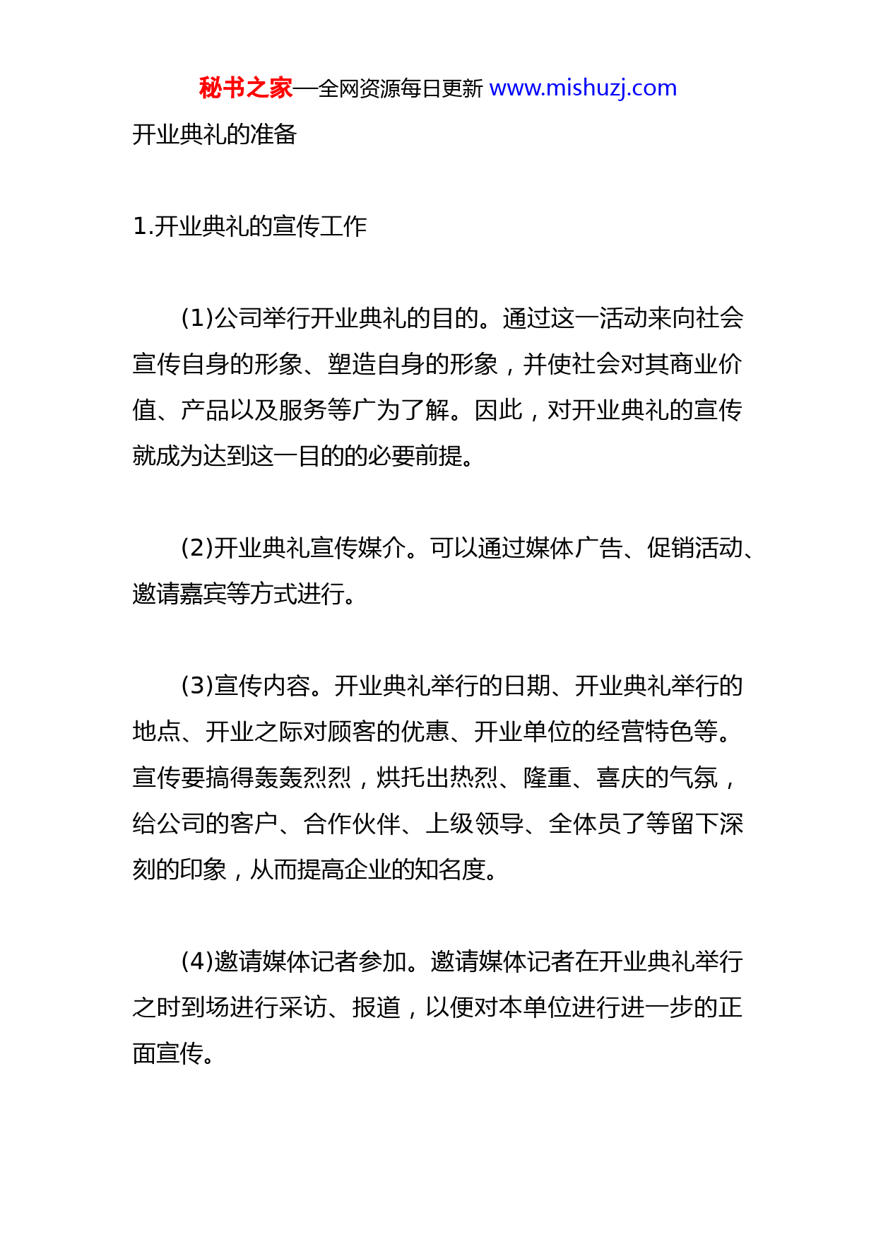 秘书之家—全网资源每日更新www.mishuzj.com开业典礼的准备1.开业典礼的宣传工作(1)公司举行开业典礼的目的。通过这一活动来向社会宣传自身的形象、塑造自身的形象,并使社会对其商业价值、产品以及服务等广为了解。因此,对开业典礼的宣传就成为达到这一目的的必要前提。(2)开业典礼宣传媒介。可以通过媒体广告、促销活动、邀请嘉宾等方式进行。(3)宣传内容。开业典礼举行的日期、开业典礼举行的地点、开业之际对顾客的优惠、开业单位的经营特色等。宣传要搞得轰轰烈烈,烘托出热烈、隆重、喜庆的气氛,给公司的客户、合作伙伴、上级领导、全体员了等留下深刻的印象,从而提高企业的知名度。(4)邀请媒体记者参加。邀请媒体记者在开业典礼举行之时到场进行采访、报道,以便对本单位进行进一步的正面宣传。秘书之家—全网资源每日更新www.mishuzj.com2,准备典礼的开幕词开业典礼前,要对典礼的开幕词进行草拟。开幕词的内容:(1)对来宾表示感谢。(2)介绍公司成立的目的、过程。(3)经营的范围以及公司以后的发展规划和安排等。由本单位的主要负责人致开幕词,目的是宣布典礼的开始、介绍公司的情况和感谢来宾的光临。开幕词的语言要突出庆典的“庆”。3.拟写典礼议程典礼的议程就是庆典上项目的程序。典礼议程主要有下列内容:(1)主持人宣布典礼开始。秘书之家—全网资源每日更新www.mishuzj.com(2)全体起立,奏乐。(3)宣读重要嘉宾名单。(4)领导致辞贺词,来宾致贺词。由上级领导和来宾代表致贺词,主要表达对开业单位的祝贺,并寄予厚望。贺词由谁来致词要事先定好,以免当众推来推去。对外来的贺电、贺信,不必一一宣读,但对其署名的单位或个人应予以公布。(5)本公司经理致辞。主要内容是向来宾及祝贺单位表示感谢,并简要介绍本公司的经营特色和经营目标等。(6)邀请嘉宾揭幕剪彩。由本公司负责人和一位上级领导或嘉宾代表揭去盖在秘书之家—全网资源每日更新www.mishuzj.com牌匾上的红布,宣告企业的正式成立。参加典礼的全体人员应该鼓掌祝贺,在非限制燃放鞭炮的地区还可燃放鞭炮庆贺。4.发放请柬邀请来宾开业典礼影响的大小,往往取决于来宾身份的高低与其数量的多少。在力所能及的条件下,要力争多邀请一些来宾参加开业典礼。地方领导、上级主管部门与地方职能管理部门的领导,合作单位与同行单位的领导、社会团体的负责人、社会贤达、媒体人员,都是邀请时应予优先考虑的重点。为慎重起见,用以邀请来宾的请柬应认真书写并应装入精美的信封,由专人提前送达对方手小,以使对方早作安排。发放请柬的时间要提前一周,便于被邀请者及早安排和准备。5.场地布置开业典礼大多是在开业的现场举行,其场地可以是正门之外的广场,也可以是正门之内的大厅。按照惯例,举行开业典礼时,宾主一律站立,一般不布置主席台或座椅秘书之家—全网资源每日更新www.mishuzj.com为显示隆重,可在来宾尤其是贵宾站立之处铺设红色地毯并在场地四周悬挂横幅、标语、气球、彩带、宫灯。此外还应当在醒目之外摆放来宾赠送的花篮、牌匾。来宾的签到簿、本单位的宣传材料、待客的饮料等,亦须提前备好对于音响、照明设备,以及开业典礼举行之时所需使用的用具、设备、必须事先认真进行检查、调试,以防在使用时出现差错。—6.准备物品开业典礼中需要准备的物品主要有两项:(1)场地用物品和馈赠礼品。场地用物品主要包括:场地四周悬挂横幅标语、气球、彩带、宫灯、来宾的签到簿本单位的宣传材料、待客的饮料、音响、照明设备等。(2)馈赠礼品。向来宾赠送的礼品,旨先,要具有宣传性,可以选用本公司的产品,也可以礼品及其外包装上印有本公司的企业标志、广告用语、产品图案、开业日期等主要是独特的,有宣传本公司效用的纪念物品。其次,要具有一定的纪念意义,使礼品接受者感到光荣和自豪,从而对其珍惜。秘书之家—全网资源每日更新www.mishuzj.com其三要独特,赠送的礼品应当与众不同,具有本单位的鲜明特色,使人一目了然,或令人过目不忘。7.安排接待开业典礼确定举行时,就应该成立对此时全权负责的筹备组。筹备组成员通常应当由各方面的有关人士组成,他们应当是能办事、会办事、办实事的人。接待小组的具体工作主要是:来宾的迎送、来宾的引导、来宾的陪同和来宾的招待。