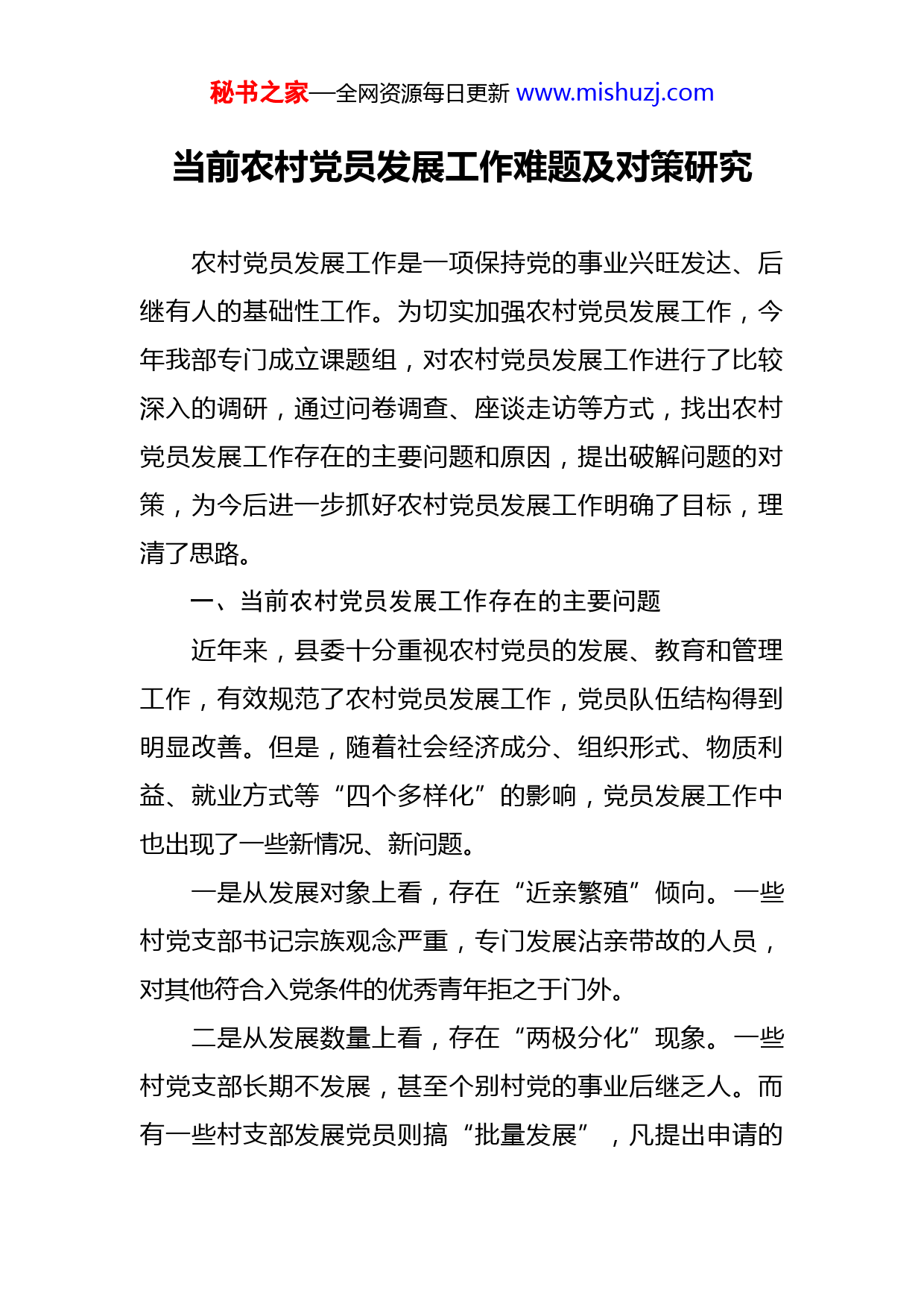 秘书之家—全网资源每日更新www.mishuzj.com当前农村党员发展工作难题及对策研究农村党员发展工作是一项保持党的事业兴旺发达、后继有人的基础性工作。为切实加强农村党员发展工作,今年我部专门成立课题组,对农村党员发展工作进行了比较深入的调研,通过问卷调查、座谈走访等方式,找出农村党员发展工作存在的主要问题和原因,提出破解问题的对策,为今后进一步抓好农村党员发展工作明确了目标,理清了思路。一、当前农村党员发展工作存在的主要问题近年来,县委十分重视农村党员的发展、教育和管理工作,有效规范了农村党员发展工作,党员队伍结构得到明显改善。但是,随着社会经济成分、组织形式、物质利益、就业方式等“四个多样化”的影响,党员发展工作中也出现了一些新情况、新问题。一是从发展对象上看,存在“近亲繁殖”倾向。一些村党支部书记宗族观念严重,专门发展沾亲带故的人员,对其他符合入党条件的优秀青年拒之于门外。二是从发展数量上看,存在“两极分化”现象。一些村党支部长期不发展,甚至个别村党的事业后继乏人。而有一些村支部发展党员则搞“批量发展”,凡提出申请的秘书之家—全网资源每日更新www.mishuzj.com照单全收,一年就发展新党员十几名。三是从发展质量上看,存在“良莠不齐”状况。一些村支部发展党员时不讲标准或坚持标准不严,谁对自己有利就发展谁,谁给好处就发展谁,甚至把一些违反计划生育政策、参与赌博、搞迷信等不符合条件的人员也发展为党员,严重降低了党员质量。四是从发展程序上看,存在“暗箱操作”情况。有的村党支部发展程序上走“跳棋”,规定程序没有走到,有的对预备党员到期不研究转正,有的甚至搞“瞒天过海”入党,通过伪造会议记录、入党材料的方式发展党员,在党员群众中造成了极坏影响。二、农村党员发展工作存在问题的主要原因主要原因有以下四方面:(一)乡镇党委认识不到位,党员发展工作“缺管”。一是思想不够重视。一些乡镇党委没有认识到农村党员发展工作的深远意义,平时把主要精力都放在计划生育、经济发展等政绩工程,没有把党员发展工作摆上重要议事日程二是业务指导不到位。一些乡镇党委组织员业务素质不高责任心不强,平时对村级党组织党员发展工作指导不够。一些驻村联片干部只想把计划生育、新农村建设等重点工作抓好,对党员发展工作不闻不问。三是责任追究难落实虽然县委每年都跟乡镇签订党建工作责任书,各乡镇也结秘书之家—全网资源每日更新www.mishuzj.com合实际跟各村党支部、驻村联片干部签订责任书,但对达不到工作目标要求的责任对象,在责任落实和追究上没有落到实处。(二)党组织负责人素质不高,党员发展工作“偏轨”。一是文化素质偏低,业务掌握不熟练,导致发展程序不到位。支部书记由于文化素质偏低原因,不熟悉发展党员的基本程序,不知道如何发展党员,造成党员发展时程序不到位或填写不规范等问题常有发生。二是思想境界不高,民主意识不强,导致人为降低党员质量。一些村党支部书记对党员发展心怀疑虑,害怕“培养了苗子,失去了位子”,不主动、也不愿意去发展党员,个别支部书记宁愿被乡镇党委免职,也不愿培养发展不属于“自己人”的入党积极分子入党。(三)农村青年流动频繁,发展对象难选“苗子”。特别是山区农村受地域、交通等条件限制,经济社会发展相对比较落后,农村绝大多数有文化、有能力的青壮年纷纷外出务工、经商,留在家中的大多是年龄偏高、文化偏低、能力偏弱的人员,综合素质相对较差,使得发展党员时好“苗子”难选。同时,外出青年务工地点不固定、流动频繁等原因,给党组织的考察培养增加了难度,加上本人又不主动向党组织汇报思想和行踪,使得入党积极分子培养工作难上加难。秘书之家—全网资源每日更新www.mishuzj.com(四)党员先进性不强,优秀青年入党愿望“降低”。近年来,一些村党支部放松对党员的党性教育,忽略党员作用的发挥,使一些党员的先进意识淡化、组织观念弱化、服务意识淡薄,把自己混同于普通群众,个别党员甚至出现了“拉山头”、“搞派性”等不良行为,降低了党员在群众中的威信,一些优秀青年对入党缺乏真正意愿。三、做好农村党员发展工作的对策和措施从根本上解决农村党员发展工作存在的问题,必须建立一套竞争有序、决策民主、程序公开、责任明确的农村党员发展工作机制,真正把最优秀的农村青年吸收到党员队伍中来,不断提高党员的整体素质,更好地发挥他们在农村小康建设中的先锋模范作用。(一)完善责任机制,着力强化党员发展工作制度保障。一要建立县、乡(镇)、村三级共同负责制。做到县委领导包乡镇、乡镇党委班子成员包村,村支委联系一至二名入党积极分子,通过建立党员发展定期督查、定期汇报、定期研判等制度,及时发现并解决党员发展中出现的问题从而形成一级抓一级,层层抓落实的党员发展工作网络。二要健全党员发展工作责任追究制。要把做好党员发展工作,列入乡镇党委班子及成员特别是党委书记、分管组织的党委副书记和党委委员的目标责任制中,并作为政绩考核、评优评先的依据。乡镇要将党员发展工作责任落秘书之家—全网资源每日更新www.mishuzj.com实到驻村联片干部和村党支部书记