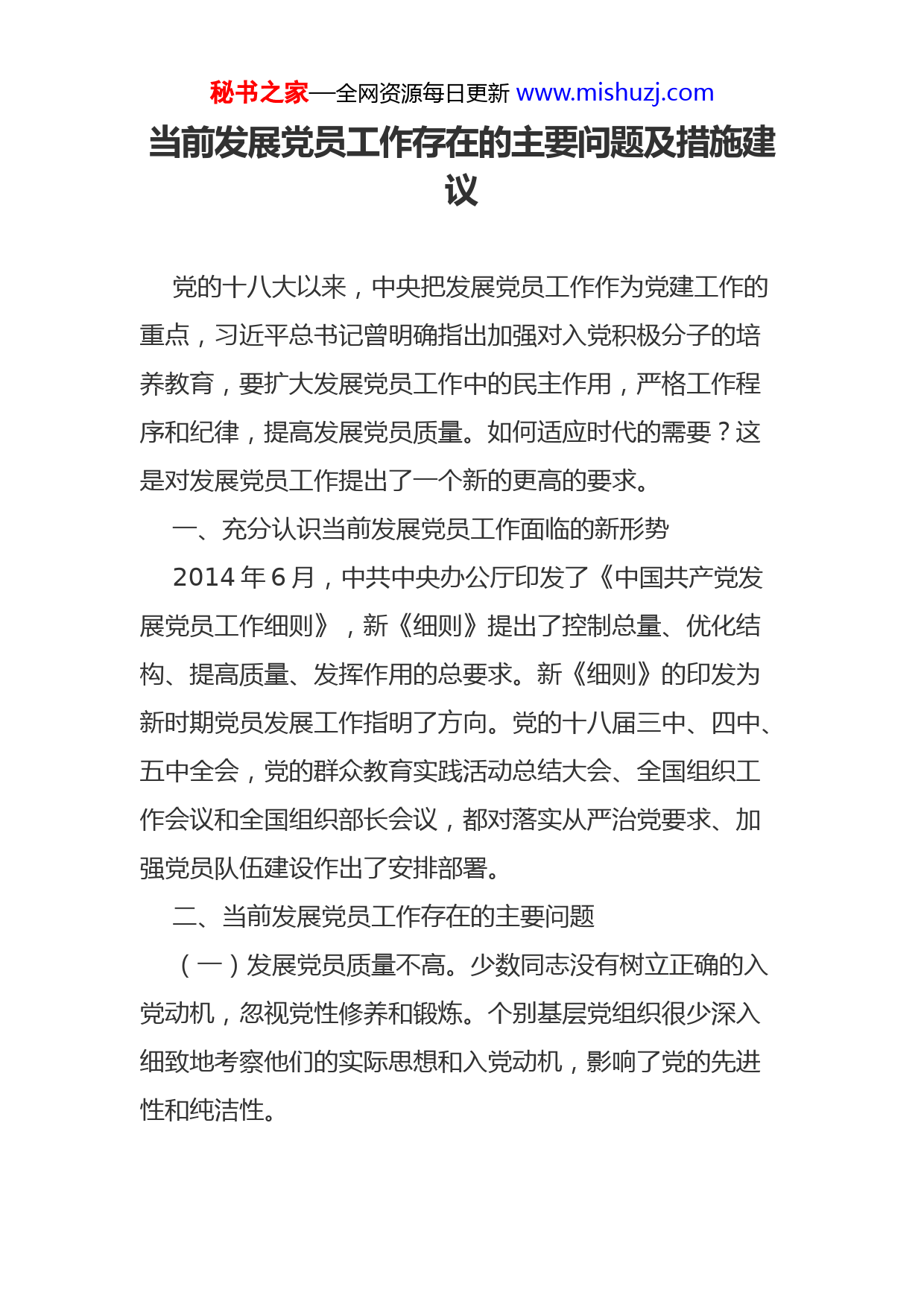 秘书之家—全网资源每日更新www.mishuzj.com当前发展党员工作存在的主要问题及措施建议党的十八大以来,中央把发展党员工作作为党建工作的重点,习近平总书记曾明确指出加强对入党积极分子的培养教育,要扩大发展党员工作中的民主作用,严格工作程序和纪律,提高发展党员质量。如何适应时代的需要?这是对发展党员工作提出了一个新的更高的要求。一、充分认识当前发展党员工作面临的新形势2014年6月,中共中央办公厅印发了《中国共产党发展党员工作细则》,新《细则》提出了控制总量、优化结构、提高质量、发挥作用的总要求。新《细则》的印发为新时期党员发展工作指明了方向。党的十八届三中、四中、五中全会,党的群众教育实践活动总结大会、全国组织工作会议和全国组织部长会议,都对落实从严治党要求、加强党员队伍建设作出了安排部署。二、当前发展党员工作存在的主要问题(一)发展党员质量不高。少数同志没有树立正确的入党动机,忽视党性修养和锻炼。个别基层党组织很少深入细致地考察他们的实际思想和入党动机,影响了党的先进性和纯洁性。秘书之家—全网资源每日更新www.mishuzj.com(二)发展党员程序不规范。个别基层党组织对确定的入党积极分子,未及时建立12371党建信息平台的“电子档案”;发展对象的教育考察不够细致;发展党员程序执行不够严格。(三)党籍材料填写不全。《入党志愿书》填写不及时不规范,材料表述不准确,材料要素不齐全。三、问题原因分析(一)从责任落实情况来看,个别党组织对发展党员和党员管理工作责任不明确,管理不严格。(二)从队伍建设情况来看,基层党务工作者队伍存在“青黄”不接、素质参差不齐等问题。他们对新形势下加强发展党员和党员管理的重要性认识不足,对党内的法规制度和党员发展程序不熟悉。同时很少有机会参加系统的学习培训。(三)从党组织工作力度来看,个别基层党组织对发展党员工作重视不够、措施不力,致使发展党员质量不高,党员先锋模范作用发挥不明显。基础较为薄弱的党支部,对《入党志愿书》、政审材料、入党申请书、思想汇报等有关资料保管不力,该存入本人档案的没有存入,该上报审查的没有上报。四、对当前发展党员工作的措施建议秘书之家—全网资源每日更新www.mishuzj.com(一)深化思想认识。基层党委和基层党支部两级党组织责任人要充分认识发展党员工作是落实从严治党的新要求,提高对发展党员工作重要性的认识,切实贯彻实施《细则》的具体措施,把《细则》新规定新要求不折不扣的落实。在发展党员工作中,明确任务、突出重点,健全机制、务求实效,增强做好新形势下发展党员工作的责任感和紧迫感。(二)加强队伍建设。首先是重点加强基层组工人员、党支部书记、党务工作者的党建知识培训,通过集中培训、以会代训、现场观摩推进等方式加强对党务队伍的培训,帮助基层党务干部吃透《细则》精神实质和操作程序,提高党务干部思想素质和业务能力。其次是强化主业意识。在坚持基层党建工作主业的基础上,将发展党员工作作为重中之重,通过年制定计划、过程跟踪考察、年底考核奖惩等方式,进一步强化主业意识,确保发展党员工作的正常开展。(三)突出“五严”内容。一是严格标准。在发展党员工作中特别是把政治标准放在首位。从历史地、全面地、辩证地看发展对象的综合素质、一贯表现,着重看发展对象是否具有良好的思想作风和道德品行,思想觉悟和政治素质是否符合入党条件,动机是否端正,在各项工作中是否能起模范带头作用。防止秘书之家—全网资源每日更新www.mishuzj.com降低标准或曲解标准,片面地以工作业绩、能人标准或工龄资历代替党员标准。二是严控总量。要正确处理党员数量和质量的关系,优化结构、提高质量是当前发展党员工作的重点。基层党组织对每年的党员发展计划应结合本单位党员结构进行制定,不简单地分指标、卡比例,着力解决发展女党员、35岁以下党员、党员年龄偏大和大专及以上学历比例偏低等问题。三是严把源头。切实把思想教育贯穿发展党员工作全过程,坚持理论学习与集中学习、自我教育与组织培养、教育引导与实践锻炼的有机统一,加强对入党积极分子的培养教育,开展党的基本理论和形势任务的教育,引导他们加深对党的了解,增进对党的感情,提高思想觉悟。建立入党积极分子动态调整机制,每年进行一次综合分析,根据考察情况,对不符合标准条件的要及时调整。四是严格程序。发展党员工作程序是党章和《细则》明确规定的,在入党积极分子、发展对象的推荐确定、培养教育、政治审查,预备党员的接收审批、教育和考察、转正等每一个环节,都要严格程序、严格把关。可以通过“四全程”制度保证程序规范。即:全程公开是对每个发展程序、每个环节、每个步骤的工作过程及结果,向党员群众公开,接受监督;全程审核是基层党委对确定的入党积极分子、发展对象、接收预备党员和预备党员转正各个秘书之家—全网资源每日更新www.mishuzj.com环节都要派组织员全程参加,并对发展党员全过程的相关材料严格审核把关;全程纪实是对发展党员的每个环节、每个步骤、每个内容都要由相关责任人逐项记录并签字确认,做到事实清、情况明、有据可查;全程问责是按照“