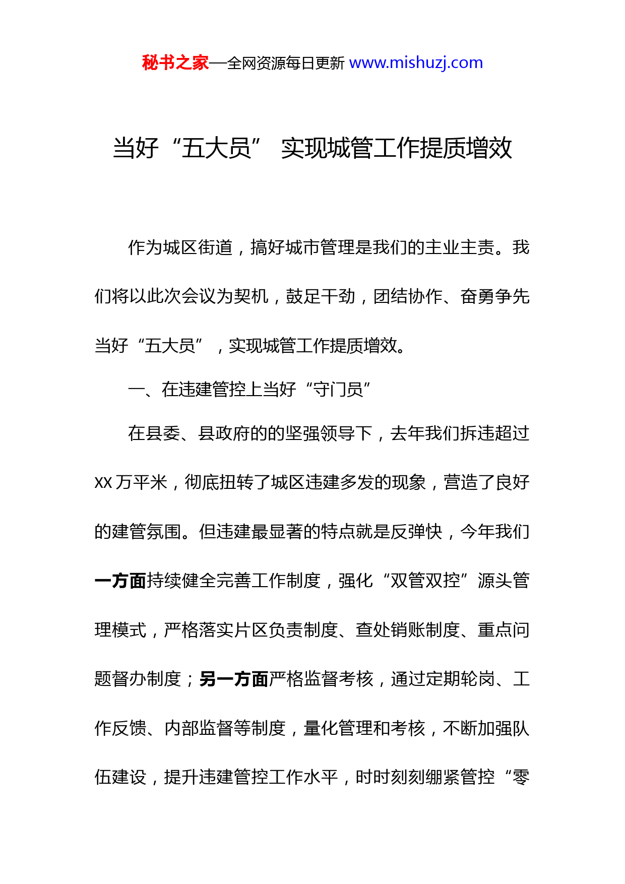 秘书之家—全网资源每日更新www.mishuzj.com当好“五大员”实现城管工作提质增效作为城区街道,搞好城市管理是我们的主业主责。我们将以此次会议为契机,鼓足干劲,团结协作、奋勇争先当好“五大员”,实现城管工作提质增效。一、在违建管控上当好“守门员”在县委、县政府的的坚强领导下,去年我们拆违超过XX万平米,彻底扭转了城区违建多发的现象,营造了良好的建管氛围。但违建最显著的特点就是反弹快,今年我们一方面持续健全完善工作制度,强化“双管双控”源头管理模式,严格落实片区负责制度、查处销账制度、重点问题督办制度;另一方面严格监督考核,通过定期轮岗、工作反馈、内部监督等制度,量化管理和考核,不断加强队伍建设,提升违建管控工作水平,时时刻刻绷紧管控“零秘书之家—全网资源每日更新www.mishuzj.com容忍、不姑息”这条弦,力争实现“违建零增长”,为我县城市建设与发展保驾护航。二、在小街小巷改造上当好“建设员”街道生活仍然有大量群众生活在背街小巷中,小巷的出行、排水、照明等,与群众的生活息息相关,也是城区群众反映民生的重点。在已完成城区XX条巷道整治的基础上,今年,我们重点改造xx、xx等XX条巷道,通过硬化道路、建设疏通排水设施,清理广告、粉刷墙面等措施,美化善群众居住环境,增加群众获得感。目前正在征求群众意见和调查摸底,预计X月份开工建设,XX月底完成整治。三、在老旧小区改造上当好“业务员”街道是老旧小区整治改造和长效管理工作的责任主体,去年,街道投资XXX余万元,改造X个老旧小区,得到了群众的一致认可。今年,街道将加大投入,完成X个老旧小区的改造。在改造工作上,我们将充分征求群众意见,确保秘书之家—全网资源每日更新www.mishuzj.com在改造中彻底解决小区绿化、停车等遗留难题,让群众舒心,也为下一步物业服务站的入驻做好准备。目前,我们正安排人员走访群众,进行调研,为改造设计方案做准备计划X月启动改造,XX月底全面完成。四、在社区物业站建设上当好“指导员”针对城区还有大量的小区属于无物业小区的现状,街道将奋力承担属地责任,推动小区物业管理水平提升。目前,城区范围的x个社区全部成立社区物业站,并逐步接管部分无物业小区。街道将按照人大问政物业的相关精神,虚心向县职能部门学习,积极借鉴先进经验,指导社区物业站尽快摸索出一条入驻无物业小区的有效路径,尽快实现无物业小区入驻的全覆盖。五、在环境综合整治上当好“服务员”由于街道位于城区的特殊性,在省级卫生城市创成后,根据县政府的部署,本着“专业人干专业事”的理念,街秘书之家—全网资源每日更新www.mishuzj.com道将辖区的所有保洁统一移交城管局负责。在农村垃圾体系提档升级、两网协同等工作上,我们将及时做好信息反馈及乱堆乱放清理等工作,全力支持配合城管局。同时,我们毫不放松属地管理责任,围绕“XXX”专项行动,着重做好农村面源污染、黑臭水体、废旧塑料收集加工、燃煤锅炉等整治,不断强化对群众的宣传教育,提升群众的文明水平,筑牢农村垃圾体系提档升级基础。表态完毕!