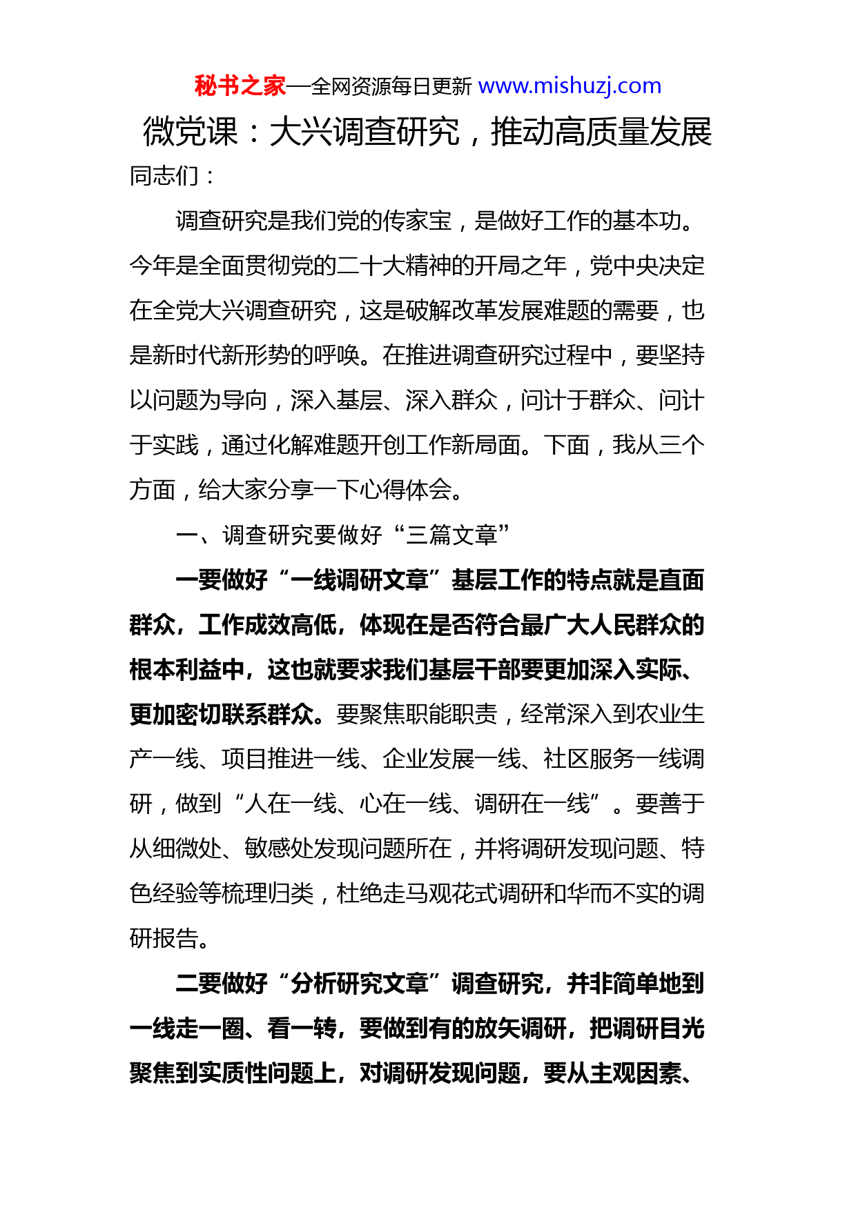 秘书之家—全网资源每日更新www.mishuzj.com微党课:大兴调查研究,推动高质量发展同志们:调查研究是我们党的传家宝,是做好工作的基本功。今年是全面贯彻党的二十大精神的开局之年,党中央决定在全党大兴调查研究,这是破解改革发展难题的需要,也是新时代新形势的呼唤。在推进调查研究过程中,要坚持以问题为导向,深入基层、深入群众,问计于群众、问计于实践,通过化解难题开创工作新局面。下面,我从三个方面,给大家分享一下心得体会。一、调查研究要做好“三篇文章”一要做好“一线调研文章”基层工作的特点就是直面群众,工作成效高低,体现在是否符合最广大人民群众的根本利益中,这也就要求我们基层干部要更加深入实际、更加密切联系群众。要聚焦职能职责,经常深入到农业生产一线、项目推进一线、企业发展一线、社区服务一线调研,做到“人在一线、心在一线、调研在一线”。要善于从细微处、敏感处发现问题所在,并将调研发现问题、特色经验等梳理归类,杜绝走马观花式调研和华而不实的调研报告。二要做好“分析研究文章”调查研究,并非简单地到一线走一圈、看一转,要做到有的放矢调研,把调研目光聚焦到实质性问题上,对调研发现问题,要从主观因素、秘书之家—全网资源每日更新www.mishuzj.com客观原因等方面深入分析。厘清宏观政策和工作实际之间的矛盾所在,研判人与事之间的协调匹配程度,剖析工作全链条各环节之间的衔接联系,力求把问题找实、把差距核准、把短板揪出。三要做好“解决问题文章”调查研究的核心,在于发现问题、解决问题,可以说,一次调研成功与否,与解决问题成效高低是成正比的。从目前情况来看,大部分干部具有发现问题的“慧眼”,但解决问题的能力还比较欠缺,一线调研有时候变成了“摆问题”“踢皮球”,解决问题的方法手段、胆识魄力亟待提升。因此,我们务必要把强业务提升素质作为解决问题的基础保障,把抓机遇求创新作为解决问题的生命力,把认可度满意度作为解决问题的衡量标准,方能达到调查研究的目的近日,中共中央办公厅印发《关于在全党大兴调查研究的工作方案》。党中央决定,在全党大兴调查研究。调查研究是我们党的传家宝,是党员干部谋事之基、成事之道、决策之要,也是做好工作的基本功。要牢固树立实事求是、务实担当的工作作风,让调查研究真正成为看家本领,让自身成为工作领域的行家里手。二、调查研究要紧盯“三个关键”一是紧盯前期准备这个关键,不打无准备之仗。调查研究不能浅尝辄止,必须深入了解才能有实际效果,只有秘书之家—全网资源每日更新www.mishuzj.com前期做好充分准备,明确调研主题、工作方向及目标意义,紧盯工作重点,有针对性地开展调查研究,才能保证工作取得成效。工欲善其事,必先利其器。没有充分的准备是无法开展好后续工作的,调查研究不是走马观花,没有认真谋划部署调查研究不可能会有好的成果,更不可能在工作推动上产生积极正面的良好效果。调研准备应该紧盯群众的“急难愁盼”问题,把好“脉”,才能开出好“药方”。二是紧盯群众路线这个关键,不搞走形式之举。为人民服务的前提是搞清楚人民需要什么,调查研究就是要让群众做“发言人”,党员干部做“记录员”“研究员”,记清楚群众需要解决什么问题,认真研究怎么解决好这些问题。不认真倾听群众的意见建议和所思所想,那也就背离了调查研究的初衷,也就达不到最终的目的。“坐在办公室碰到的都是问题,深入基层看到的全是办法。”李强总理的这句话充分说明了调查研究的重要性,只要深入基层,搞好调查研究,就能找到解决问题的办法。调查研究应力戒形式主义,找准“病”,才能“对症下药”。三是紧盯落地见效这个关键,不做无下文之事。工作一分部署,九分落实,调查研究的目的在于将发现的问题一一解决。作为党员干部,抓落实是体现工作担当及践行群众路线的具体举措,万不能出现调查研究风风火火,问秘书之家—全网资源每日更新www.mishuzj.com题解决拖拖拉拉的情况。在发现问题,提出解决方案之后,工作重心就应当放在解决问题上。“调查就像‘十月怀胎’,解决问题就像‘一朝分娩’。调查就是解决问题。”毛泽东同志用生动的比喻说明了解决问题的重要性,若没有“一朝分娩”,那么“十月怀胎”也就失去了意义,若问题没有得到解决,那么前面的调查研究也就成了无用之功。调查研究应把解决问题作为关键,抓对“药”,才能“药到病除”。三、调查研究要坚持“三个到位”一要身入广听到位。要警惕“坐在办公室全是问题”的形式主义,摒弃“办公室里听汇报,会议桌上讲方法”的官僚主义。要放下架子、扑下身子、眼睛向下、脚步向下、沉到一线,既要“身入”基层,更要“心到”基层。要深入基层、走进群众当中听真话、察实情,既要听顺耳话,更要听逆耳言。要坚持多层次、多角度、多渠道了解情况,掌握第一手资料,为解决问题打下基础,真正做到问需于民、问计于民。二要心到细看。要发扬“下去调研全是办法”的群众路线。要深入基层、深入群众中,到生产工作一线、问题凸显一线、矛盾集中一线、项目建设一线进行实地走访查看,不仅要看“窗口门面”,还要看“犄角旮旯”,不能带着观点下基层、带着框子搞调研、