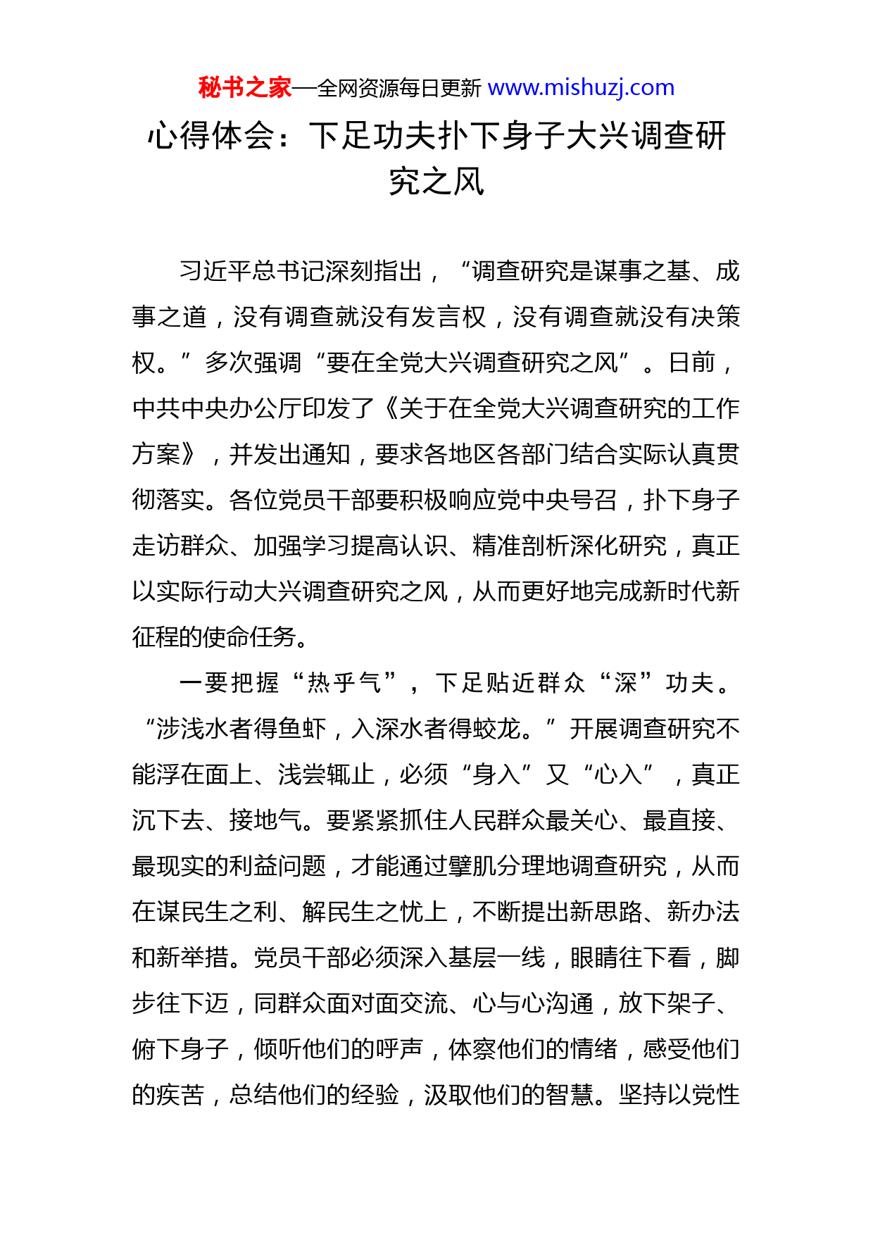 秘书之家—全网资源每日更新www.mishuzj.com心得体会:下足功夫扑下身子大兴调查研究之风习近平总书记深刻指出,“调查研究是谋事之基、成事之道,没有调查就没有发言权,没有调查就没有决策权。”多次强调“要在全党大兴调查研究之风”。日前,中共中央办公厅印发了《关于在全党大兴调查研究的工作方案》,并发出通知,要求各地区各部门结合实际认真贯彻落实。各位党员干部要积极响应党中央号召,扑下身子走访群众、加强学习提高认识、精准剖析深化研究,真正以实际行动大兴调查研究之风,从而更好地完成新时代新征程的使命任务。一要把握“热乎气”,下足贴近群众“深”功夫。“涉浅水者得鱼虾,入深水者得蛟龙。”开展调查研究不能浮在面上、浅尝辄止,必须“身入”又“心入”,真正沉下去、接地气。要紧紧抓住人民群众最关心、最直接、最现实的利益问题,才能通过擘肌分理地调查研究,从而在谋民生之利、解民生之忧上,不断提出新思路、新办法和新举措。党员干部必须深入基层一线,眼睛往下看,脚步往下迈,同群众面对面交流、心与心沟通,放下架子、俯下身子,倾听他们的呼声,体察他们的情绪,感受他们的疾苦,总结他们的经验,汲取他们的智慧。坚持以党性秘书之家—全网资源每日更新www.mishuzj.com立身做事,把说老实话、办老实事、做老实人作为调查研究的重要内容,要善于独立思考,坚持求真务实,在工作实际中,练就出过硬的政治能力,在思想上、政治上、行动上同党中央保持高度一致,才能更好地坚持问政于民、问需于民、问计于民,加强调查研究,畅通民意渠道,把人民的智慧集中起来、运用起来,更好地为党分忧、为国尽责、为民服务,以实际行动践行初心使命。二要注重“高站位”,下足理论武装“真”功夫。“思想有多远,我们才能走多远。”调研调研,既要“调”更要“研”,我们想要抓好调查研究,就要抓好关键方法和关键步骤。没有理论指导,就会导致调查研究的“调子”定得不准、“点子”用得不对,“步子”走的不稳,最终也就很难形成科学可行的调查研究成果。因此,广大党员干部要提高思想认识,加强理论武装,增强做好调查研究的思想自觉、政治自觉、行动自觉,详细制订方案,明确调研的项目课题、方式方法和工作要求。深入学习领会习近平总书记关于调查研究的重要论述,继承和发扬老一辈革命家深入基层调查研究的优良作风,积极主动向先进典型学习,砥砺敢于担当、主动作为的党性和作风,吃透有关政策规定以及调研课题的历史背景及研究状况,从而更好推动各项工作科学决策、创新发展。三要聚焦“小切口”,下足抽丝剥茧“细”功夫。秘书之家—全网资源每日更新www.mishuzj.com“莫看江面平如镜,要看水底万丈深。”调查研究的目的是把事情的真相和全貌调查清楚,把问题的本质和规律把握准确,把解决问题的思路和对策研究透彻,这就必须多层次、多方位、多渠道了解情况。在调研过程中,在调查研究的过程中,广大干部要能做到“见渺小之物必细察其纹理”,从群众的家长里短、衣食住行、生活环境的细微之处发现问题、了解实情;面对大是大非敢于亮剑、面对矛盾敢于迎难而上、面对危机敢于挺身而出、面对失误敢于承担责任、面对歪风邪气敢于坚决斗争,敢担当、敢作为,善于“在困难面前逞英雄”,起而行之、挑起重担;勇于“逢山开路、遇水架桥”,不断开拓、努力进取,练就担当作为的硬脊梁、铁肩膀、真本事,事不避难、义不逃责,苦干实干、不懈奋斗,真正把使命放在心上、把责任扛在肩上。四要持续“转作风”,下足严规守矩“实”功夫。“清正廉洁是共产党人安身立命之本,是不能丢弃的政治底色。”党员干部要知敬畏守底线,常修为政之德、常思贪欲之害、常怀律己之心,筑牢廉政思想防线、自觉抵制歪风邪气,保持清正廉洁。始终做到公正用权、依法用权、为民用权、廉洁用权,保持共产党人的高尚品格和廉洁操守;守住底线,守住做人、处事、用权、交友的底线,守住党和人民交给自己的政治责任。把世界观、人生秘书之家—全网资源每日更新www.mishuzj.com观、价值观的总开关拧紧了,把思想觉悟、精神境界提高,严守纪律规矩,永葆共产党人政治本色,坚持以人民为中心的发展思想,始终把人民放在心中最高位置,做一个一心为公、一身正气、一尘不染的人,努力为实现中国式现代化不懈奋斗。