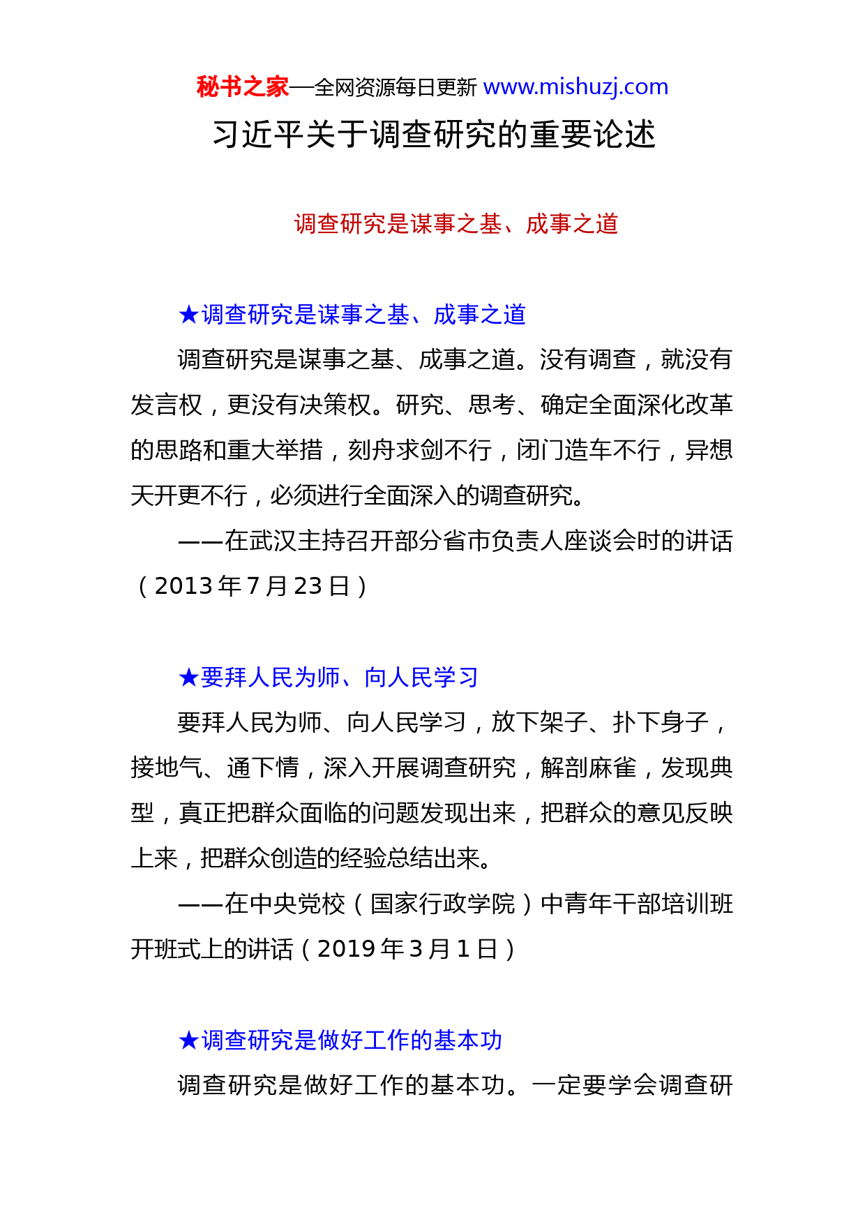 秘书之家—全网资源每日更新www.mishuzj.com习近平关于调查研究的重要论述调查研究是谋事之基、成事之道★调查研究是谋事之基、成事之道调查研究是谋事之基、成事之道。没有调查,就没有发言权,更没有决策权。研究、思考、确定全面深化改革的思路和重大举措,刻舟求剑不行,闭门造车不行,异想天开更不行,必须进行全面深入的调查研究。——在武汉主持召开部分省市负责人座谈会时的讲话(2013年7月23日)★要拜人民为师、向人民学习要拜人民为师、向人民学习,放下架子、扑下身子,接地气、通下情,深入开展调查研究,解剖麻雀,发现典型,真正把群众面临的问题发现出来,把群众的意见反映上来,把群众创造的经验总结出来。——在中央党校(国家行政学院)中青年干部培训班开班式上的讲话(2019年3月1日)★调查研究是做好工作的基本功调查研究是做好工作的基本功。一定要学会调查研秘书之家—全网资源每日更新www.mishuzj.com究,在调查研究中提高工作本领。调查研究要经常化。要坚持到群众中去、到实践中去,倾听基层干部群众所想所急所盼,了解和掌握真实情况,不能走马观花、蜻蜓点水,一得自矜、以偏概全。——在中央党校(国家行政学院)中青年干部培训班开班式上的讲话(2020年10月10日)号脉都号不清楚,那治什么病?★号脉都号不清楚,那治什么病?哲学社会科学包括文化文艺不接地气不行,要解释现实的社会问题,开什么处方治什么病,首先要把是什么病搞清楚。要把好脉,中国身体怎么样,如果有病是什么病,用什么药来治,对这心里要透亮透亮的。号脉都号不清楚,那治什么病?——在参加全国政协十三届二次会议文化艺术界、社会科学界委员联组会时的讲话(2019年3月4日)★实事求是是我们党的思想路线的重要内容长期以来,我们党在出台重要方针政策、作出重大决策部署前,都要求有关部门深入基层调查研究,了解和掌握第一手材料。实事求是是我们党的思想路线的重要内秘书之家—全网资源每日更新www.mishuzj.com容,早在延安时期,毛泽东同志就强调“共产党员应是实事求是的模范”,“只有实事求是,才能完成确定的任务”,认为调查研究的方法“第一是眼睛向下,不要只是昂首望天”,“第二是开调查会”。——在基层代表座谈会上的讲话(2020年9月17日)★过去常用的“蹲点调研”、“解剖麻雀”的调研方式依然是管用的现在通信很发达,通过打打电话、发发微信、看看材料也能了解很多情况,但毕竟隔了一层,没有现场看、当面听、直接问和“七嘴八舌式”的讨论来得真实鲜活。过去常用的“蹲点调研”、“解剖麻雀”的调研方式依然是管用的。我们现在搞的各种试点,成功了再逐步推广,这就是“解剖麻雀”的方法。——在2021年秋季学期中央党校(国家行政学院)中青年干部培训班开班式上的讲话(2021年9月1日)要防止为调研而调研★要防止为调研而调研调查研究要注重实效,使调研的过程成为加深对党的秘书之家—全网资源每日更新www.mishuzj.com创新理论领悟的过程,成为保持同人民群众血肉联系的过程,成为推动事业发展的过程。要防止为调研而调研,防止搞“出发一车子、开会一屋子、发言念稿子”式的调研,防止扎堆调研、“作秀式”调研。——在“不忘初心、牢记使命”主题教育工作会议上的讲话(2019年5月31日)★对调研得来的大量材料和情况,要认真研究分析,由此及彼、由表及里对调研得来的大量材料和情况,要认真研究分析,由此及彼、由表及里。对经过充分研究、比较成熟的调研成果,要及时上升为决策部署,转化为具体措施;对尚未研究透彻的调研成果,要更深入地听取意见,完善后再付诸实施;对已经形成举措、落实落地的,要及时跟踪评估,视情况调整优化。——在中央党校(国家行政学院)中青年干部培训班开班式上的讲话(2020年10月10日)★近的远的都要去,好的差的都要看,干部群众表扬和批评都要听要了解实际,就要掌握调查研究这个基本功。现在,各方面对调查研究是重视的,但还要下更大功夫,关键是秘书之家—全网资源每日更新www.mishuzj.com把调查研究做深做实,避免浮在表面、流于形式。要眼睛向下、脚步向下,经常扑下身子、沉到一线,近的远的都要去,好的差的都要看,干部群众表扬和批评都要听,真正把情况摸实摸透。——在2021年秋季学期中央党校(国家行政学院)中青年干部培训班开班式上的讲话(2021年9月1日)★不能搞作秀式调研、盆景式调研、蜻蜓点水式调研既要“身入”基层,更要“心到”基层,听真话、察真情,真研究问题、研究真问题,不能搞作秀式调研、盆景式调研、蜻蜓点水式调研,“无实事求是之意,有哗众取宠之心”是不行的!这就是严重的形式主义、官僚主义!要在深入分析思考上下功夫,去粗取精、去伪存真,由此及彼、由表及里,找到事物的本质和规律,找到解决问题的办法。——在2021年秋季学期中央党校(国家行政学院)中青年干部培训班开班式上的讲话(2021年9月1日)