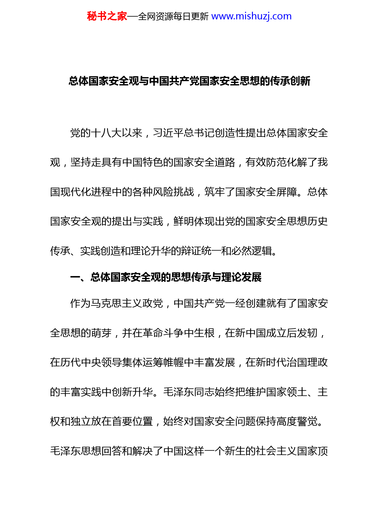 秘书之家—全网资源每日更新www.mishuzj.com总体国家安全观与中国共产党国家安全思想的传承创新党的十八大以来,习近平总书记创造性提出总体国家安全观,坚持走具有中国特色的国家安全道路,有效防范化解了我国现代化进程中的各种风险挑战,筑牢了国家安全屏障。总体国家安全观的提出与实践,鲜明体现出党的国家安全思想历史传承、实践创造和理论升华的辩证统一和必然逻辑。一、总体国家安全观的思想传承与理论发展作为马克思主义政党,中国共产党一经创建就有了国家安全思想的萌芽,并在革命斗争中生根,在新中国成立后发轫,在历代中央领导集体运筹帷幄中丰富发展,在新时代治国理政的丰富实践中创新升华。毛泽东同志始终把维护国家领土、主权和独立放在首要位置,始终对国家安全问题保持高度警觉。毛泽东思想回答和解决了中国这样一个新生的社会主义国家顶秘书之家—全网资源每日更新www.mishuzj.com住外部超级大国威胁、有效维护国家安全的系列重大挑战,牢固奠定了中国共产党国家安全战略思想的基石。邓小平理论揭示了在和平与发展的时代主题下,如何在建设有中国特色社会主义道路上维护国家安全,实现了中国共产党国家安全战略思想演变的一次重大转折。“三个代表”重要思想回答了在政治多极化和经济全球化背景下有效维护国家安全的问题,是党的国家安全战略思想的一次重大创新。科学发展观回答了大发展大变革大调整时期维护国家生存和发展利益问题,丰富和完善了党的国家安全战略思想。进入新时代,中国国家安全的内涵和外延比历史上任何时期都要丰富,时空领域比历史上任何时候都要宽广,内外因素比历史上任何时候都要复杂。习近平总书记要求要准确把握国家安全形势的新变化新特点新趋势,坚持总体国家安全观,走秘书之家—全网资源每日更新www.mishuzj.com出一条中国特色的国家安全道路,并作出了系列部署和战略安排。习近平总书记关于国家安全的论述和实践,科学回答了在国家由大向强阶段如何有效应对内外挑战,如何积极引导和塑造有利的发展环境,跨过和平发展门槛、实现中华民族伟大复兴的重大时代课题,实现了党的国家安全战略思想创新发展的历史性转变,将其推进到了一个新高度新境界。在党的国家安全战略思想不断与时俱进的发展过程中,在总体国家安全观的演进发展和丰富实践中,其不变的灵魂和基调,是始终保持了实践性与科学性、全面性与系统性、和平性与防御性、战略性与战术性、引导性和塑造性的高度辩证统一。在此基础上形成的总体国家安全观,是经过丰富实践检验并被证明是有效的、全面系统的、坚持社会主义性质宗旨的、有旺盛生命力和战斗力的国家安全科学理论体系。秘书之家—全网资源每日更新www.mishuzj.com二、总体国家安全观的实践脉络与创新国家安全问题始终具有鲜明的时代烙印,国家在不同阶段面临着具有不同特点的挑战和威胁,必然要求通过不断的实践创造予以应对。毛泽东同志清醒判断来自各方面的威胁,通过建立人民民主专政的国家制度、大力加强国家安全能力、综合运用政治军事和外交手段、倡导和平共处五项原则、努力促进反美反苏国际统一战线等,让新中国巍然屹立世界东方。邓小平根据对时代条件的科学分析,将党和国家工作重心转移到经济建设上来,确立了国家安全中的国家利益导向,强调要通过改革开放杀出一条血路来。江泽民同志作出了国家间竞争已转变为综合国力竞争、要注重增强国家战略能力等重要判断,强化了对国家安全事务统筹管理的力度。胡锦涛同志提出科学发展观,进一步拓展了国家安全的内涵,把发展作为党执政兴国秘书之家—全网资源每日更新www.mishuzj.com的第一要务,努力为国家安全奠定坚实基础。进入新时代,中国的和平发展面临外部风险和挑战急剧上升,非传统安全问题大量出现并与传统安全问题交杂,围绕领土领海领空的斗争更加复杂艰巨。习近平总书记在深刻全面总结党治国理政经验基础上,首次提出总体国家安全观,首次设立国家安全委员会,通过《国家安全法》完整界定国家安全的范畴,强调“国家政权、主权、统一和领土完整、人民福祉、经济社会可持续发展和国家其他重大利益相对处于没有危险和不受内外威胁的状况,以及保障持续安全状态的能力”,从法律上确定了总体安全观的准确内涵。按照总体安全观要求,围绕维护新时代国家安全的道路、体制、经济、强军、底线思维和引导塑造等,进行了丰富而卓有成效的维护国家安全工作实践。秘书之家—全网资源每日更新www.mishuzj.com可以通过一组数字来说明党的国家安全战略实践创新的历程。在十四大之前,党的历次代表大会多使用安全概念,并未明确使用“国家安全”。十四大报告首次使用国家安全概念,十五大和十六大报告在三处使用国家安全概念,十七大报告五次使用国家安全概念,十八大、十九大报告分别六次、十八次使用国家安全概念。这组数字,从一个侧面反映了党对国家安全问题认识和实践的创新历程。从生存之战,到发展安全,再到实现由大向强的历史跨越,党的国家安全思想实现了不同阶段的理论升华。总体国家安全观体现了“四个自信”的时代魅力,是基于对党和国家前途命运的深刻把握而应运而生的,是基于对人民群众