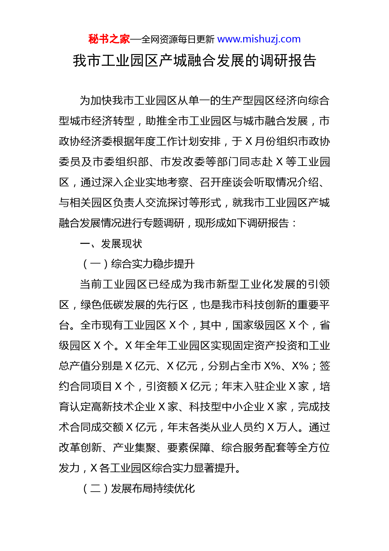 秘书之家—全网资源每日更新www.mishuzj.com我市工业园区产城融合发展的调研报告为加快我市工业园区从单一的生产型园区经济向综合型城市经济转型,助推全市工业园区与城市融合发展,市政协经济委根据年度工作计划安排,于X月份组织市政协委员及市委组织部、市发改委等部门同志赴X等工业园区,通过深入企业实地考察、召开座谈会听取情况介绍、与相关园区负责人交流探讨等形式,就我市工业园区产城融合发展情况进行专题调研,现形成如下调研报告:一、发展现状(一)综合实力稳步提升当前工业园区已经成为我市新型工业化发展的引领区,绿色低碳发展的先行区,也是我市科技创新的重要平台。全市现有工业园区X个,其中,国家级园区X个,省级园区X个。X年全年工业园区实现固定资产投资和工业总产值分别是X亿元、X亿元,分别占全市X%、X%;签约合同项目X个,引资额X亿元;年末入驻企业X家,培育认定高新技术企业X家、科技型中小企业X家,完成技术合同成交额X亿元,年末各类从业人员约X万人。通过改革创新、产业集聚、要素保障、综合服务配套等全方位发力,X各工业园区综合实力显著提升。(二)发展布局持续优化秘书之家—全网资源每日更新www.mishuzj.com依据“一县一区、一区多园”原则,我市以国家级和省级工业园区为主体,合并、托管区位相邻、产业相近的工业园区,明确自身定位,调整优化产业布局,集中力量打造“产业创新与产城融合引领区、高端能化产业核心承载区、煤电化工提档升级区、油气煤盐综合利用示范区、生态经济创新发展试验区”等五大园区板块。结合资源禀赋,每个工业园区规划发展X-X个主导产业,形成以能化产业为龙头,精细化工、装备制造、新材料、生物医药、文化旅游、现代农业、现代服务业、现代物流业为辅的产业集群。通过整合优化,改变现有布局定位散乱多的局面,让工业园区能集约集群发展,显著提升全市工业园区综合竞争力和品牌影响力。(三)基本公共服务不断完善产城融合关键在于基本公共服务的配置与供给。通过满足从业者在生产、生活、休闲、教育、医疗等诸多方面享有与城区市民一样的权利,聚集区域人气,从而达到产业和城市功能相互融合的目标。全市工业园区基础设施投入达X多亿元,公辅设施、公用工程配套建设初步完成,重点强化了园区供排水、中水回用、双电源供电、公共管廊、消防、物流等公用辅助、物流配送的一体化配套。其中,X高新区、X经开区、神木高新区等已具备较完善的基础配套设施,其余工业园区已全部完成入园主干道工程及秘书之家—全网资源每日更新www.mishuzj.com通讯、供水、供电等基础工程。同时,不断推进城市配套服务,完善道路和物流体系,优化公交场站、线路设计,不断提升要素保障水平。二、存在问题(一)体制机制有待进一步理顺全市工业园区管理体制行政化,权限下放不到位,造成工业园区在实际运作项目时各项手续依旧繁琐,行政审批效率低下,权责不匹配,社会治理难度加大。在开发模式、管理水平等方面还存在明显差距,市场化运营水平不高,开放发展水平较低,阻碍了园区更好更快地建设发展。产城互动不强,工业园区以政府投资建设运营,脱离城镇建设而独立存在,部分园区所在镇街党委书记虽然兼任管委会副主任,所发挥作用仅限于协调土地,经济发展与社会管理关系未理顺,产城融合发展活力不足。(二)园区发展统筹不够我市大部分工业园区注重经济发展,忽略了配套设施的建设。工业园区基础设施与城镇衔接不畅,“五个一体化”开发管理体系尚未健全,浪费了有限的土地和产业空间,降低了风险管控能力,弱化了产业聚集的配套和保障功能,使工业园区开发运营成效不高,无法支撑新兴产业和高端产业的发展。部分工业园区由于行政区划设置、土地、户籍、公共服务等方面的限制,在产业布局等方面存秘书之家—全网资源每日更新www.mishuzj.com在同质化竞争,导致在工业园区配套设施存在低水平重复建设问题。工业园区内企业关联度不强,重点产业间的集聚程度不高,产业内部的关联和协同程度不够,缺少生活性服务业和高附加值的生产性服务业,难以用集群形势体现产业竞争力。(三)城市设施配套不足除X高新区、X区产业园区、神木高新区配套设施完善外,其他工业园区在学校、医疗、住房各项综合服务等方面保障不全,无法为家属就业和子女就学提供更好的条件。工业园区内一般消费场所仅能满足日常基本消费(饮食、日常生活用品购买),配套设施仅限于酒店、学校、卫生院等,且数量少,质量不高。其他行政服务方面保障设施也较少,很多便民服务事宜(如银行、金融服务等)不能在工业园区附近就近办理,造成生活不便,工业园区及附近文化、娱乐、休闲设施与场所不完善,娱乐活动方式单一,只能是看电视、上网等,欠缺高层次精神文化消费资源。(四)产城融合度较低全市工业园区职工职住存在失衡性。员工大部分居住在公共服务发达的镇、县、市城区,只有外地员工及少部分低收入群体居住在企业提供的宿舍,这一失配对职住平衡发展极为不利。当前企业小区管理、居住环境、通勤管秘书之家—全网资源每日更新www.mishuzj.com理和园区规划等因素很大程度上影响了员工对园区认同感和归属感,工业园区在人才政策、激励机制、居住环境等方面对高端