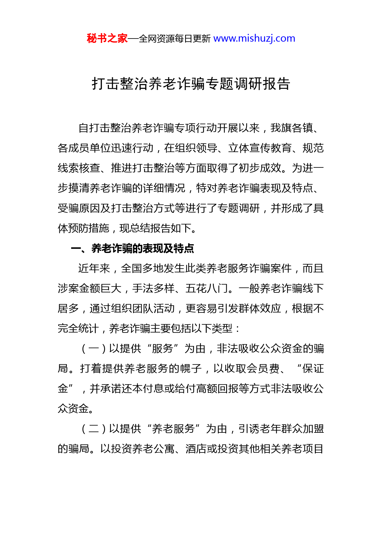 秘书之家—全网资源每日更新www.mishuzj.com打击整治养老诈骗专题调研报告自打击整治养老诈骗专项行动开展以来,我旗各镇、各成员单位迅速行动,在组织领导、立体宣传教育、规范线索核查、推进打击整治等方面取得了初步成效。为进一步摸清养老诈骗的详细情况,特对养老诈骗表现及特点、受骗原因及打击整治方式等进行了专题调研,并形成了具体预防措施,现总结报告如下。一、养老诈骗的表现及特点近年来,全国多地发生此类养老服务诈骗案件,而且涉案金额巨大,手法多样、五花八门。一般养老诈骗线下居多,通过组织团队活动,更容易引发群体效应,根据不完全统计,养老诈骗主要包括以下类型:(一)以提供“服务”为由,非法吸收公众资金的骗局。打着提供养老服务的幌子,以收取会员费、“保证金”,并承诺还本付息或给付高额回报等方式非法吸收公众资金。(二)以提供“养老服务”为由,引诱老年群众加盟的骗局。以投资养老公寓、酒店或投资其他相关养老项目秘书之家—全网资源每日更新www.mishuzj.com为名,承诺给予高额回报、或以提供养老服务为诱饵,引诱老年群众“加盟投资”。(三)以提供“养老产品”为由,引诱购买服务的骗局。打着销售保健、医疗等养老相关产品的幌子,以商品回购、寄存代售、消费返利等方式吸引老年人投入资金。(四)“投资养老”骗局。骗子会先在公园、超市、小区等老人聚集的场所给老人灌输养老投资的概念。接着通过组织旅游、参观、讲座、赠送礼品等手段博取老人的信任。然后告诉老人他们有个“养老服务”的项目,“投资一定金额后,不仅可以享受利息,还能获得北上广、苏杭等宜居大城市的房屋居住权,投资越多,福利越好”。对于老年人而言,这种方式表面看起来一并解决了投资理财和养老享福的问题,但实际上所谓的“养老服务”项目只是个虚无缥缈的东西,骗子只会给予老年人口头承诺或是签订空头合同,利用话术和PS图片进一步诱导老年人,掏空他们的养老钱包。(五)“以房养老”骗局。骗子会以“房本在家无用”等类似话语为借口,诱导老年人将房产抵押给公司,每月还可以获得高额利润,同时也不耽误老年人自住或租住,实际上,骗子会将老年人房产直接以高息抵押给职业放贷人,并将房屋处置权交由其处置。后续,当入局老人秘书之家—全网资源每日更新www.mishuzj.com数量变少时,骗子就会卷钱跑路,留下老人面对贷款公司和职业放贷人的债务催收,乃至被逼卖房还债。(六)“投资返利”骗局。骗子以投资返利或消费返利的方式诱导老年人投资消费,现场发放粮油米面,更有甚者还会承诺免费旅游等额外福利,这种骗局完美利用了老年人的“占小便宜”心理,从本质上看,还是骗子利用言语获得老年人信任后的“空手套白狼”。(七)“养老银行”骗局。有部分公司在注册时将公司名称注册为“某某某养老银行有限公司”,并在线下租用场地,打出“养老银行”的名号吸引老年人前来存款。但实际上,根据我国商业银行法第十一条规定,设立商业银行,应当经国务院银行业监督管理机构审查批准。未经国务院银行业监督管理机构批准,任何单位和个人不得从事吸收公众存款等商业银行业务,任何单位不得在名称中使用“银行”字样。(八)冒充亲朋好友的骗局。诈骗分子通过非正规渠道获取老年人的个人信息及通讯录信息,混淆视听,打着急需用钱的幌子(例如:xxx住院、出车祸、做手术等),抓住人性的软肋,让老年人向其或其提供的账户里转钱。(九)冒充电商物流客服的骗局。诈骗分子冒充某购物平台客服或物流客服,谎称老年人购买的货物存在质量秘书之家—全网资源每日更新www.mishuzj.com问题或包裹丢失,需要给老年人退款赔偿,有些老年人不懂如何操作,诈骗分子便会手把手教其如何操作,甚至让老年人在各大平台进行贷款,将钱转入他们提供的账户。(十)冒充公检法人员的骗局。诈骗分子冒充公检法工作人员,打电话表明身份(我是某某公安局/检察院/法院的工作人员)编造涉嫌银行卡洗钱或以账户异常资金不安全等情况,要求其将名下账户所有钱款转至所谓的“安全账户”。这些手法的特点有两类,一类是以虚假身份取得被害人信任,利用被害人错误认识实施欺骗行为,使得被害人错误处分财产。另一类是利用小恩小惠取得被害人信任,虚构虚假投资项目欺骗被害人处分财产投资。两种手法都是基于非法占有目的,虚构了事实,隐瞒了真相,利用了被害人的错误认识实施的欺诈行为。二、受骗原因分析通过对养老诈骗案例的分析,老年人被骗主要有一下几方面原因:(一)老年人防范意识不足。一些老年人针对养老诈骗防范意识较差,个人信息保护意识严重不足,对新型诈骗手段缺乏了解,难以有效辨别诈骗行为。多数老人们对于投资理财风险知之甚少,犯罪分子打着“以房养老”、“免费义诊”、“免费体检”、代办“养老保险”的宣传政策,宣称投资没有任何风险,老人们便信以为真,有的老人认为“我不使用智能手机,我不会被骗”,认为“免费领取鸡秘书之家—全网资源每日更新www.mishuzj.com蛋、日用品、蔬菜”等登记个人信息没有损失,这种掉以轻心的想法都让犯罪分子有机可乘。(二)老年人防诈骗认知有限。大多数老年人防骗意识薄弱,防骗能力不强,对诈骗手段,特别是花样翻新的新型诈骗缺乏辨别能