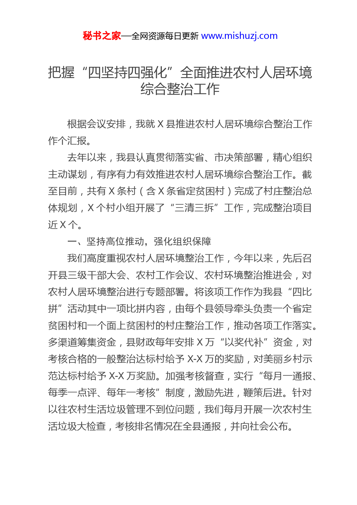 秘书之家—全网资源每日更新www.mishuzj.com把握“四坚持四强化”全面推进农村人居环境综合整治工作根据会议安排,我就X县推进农村人居环境综合整治工作作个汇报。去年以来,我县认真贯彻落实省、市决策部署,精心组织主动谋划,有序有力有效推进农村人居环境综合整治工作。截至目前,共有X条村(含X条省定贫困村)完成了村庄整治总体规划,X个村小组开展了“三清三拆”工作,完成整治项目近X个。一、坚持高位推动,强化组织保障我们高度重视农村人居环境整治工作,今年以来,先后召开县三级干部大会、农村工作会议、农村环境整治推进会,对农村人居环境整治进行专题部署。将该项工作作为我县“四比拼”活动其中一项比拼内容,由每个县领导牵头负责一个省定贫困村和一个面上贫困村的村庄整治工作,推动各项工作落实。多渠道筹集资金,县财政每年安排X万“以奖代补”资金,对考核合格的一般整治达标村给予X-X万的奖励,对美丽乡村示范达标村给予X-X万奖励。加强考核督查,实行“每月一通报、每季一点评、每年一考核”制度,激励先进,鞭策后进。针对以往农村生活垃圾管理不到位问题,我们每月开展一次农村生活垃圾大检查,考核排名情况在全县通报,并向社会公布。秘书之家—全网资源每日更新www.mishuzj.com二、坚持农民主体,强化宣传发动我们十分注重发挥村民在村庄整治中的主体作用,通过加强宣传发动,动员广大群众主动参与,变“要我干”为“我要干”。一是重视激发村民内生动力。注重政策引导,通过召开村民代表大会、干部上门做思想工作等形式,使农村环境整治政策家喻户晓,激发广大村民内生动力。同时,组织村两委干部、理事会成员和部分村民代表到外地考察学习,如到广州增城、梅州蕉岭参观学习,让村民亲身感受外地村庄整治的变化和好处,激发村民整治村庄的热情。二是充分发挥村民理事会的作用。在整治村成立由村干部、老党员、家族带头人、外出乡贤和农村致富能手等人员组成的村民理事会,通过村民理事会做群众工作,号召村民主动参与。目前,全县有X个村小组成立了村民理事会。如顿岗选陂村成立了由外出乡贤、党员、村干部等X人组成的理事会,研究决定整治工程项目,调解矛盾纠纷,做好村民思想工作。对不想参与整治的村民,由理事会成员上门做思想工作,确保了整治工作顺利推进。三是充分发挥党员干部带头作用。在整治工作过程中,村干部、党员、理事会成员带头,在主动搞好自家的“三清三拆”工作的同时,组织村民投工投劳。在村干部、党员、外出乡贤的示范带动下,广大村民积极性空前高涨,主动投工投劳。全县村民参与义务劳动达1万多人次。三、坚持规划引领,强化示范带动秘书之家—全网资源每日更新www.mishuzj.com我们坚持规划先行,引进了经验丰富的XX公司,高起点、高质量编制村庄建设规划。在规划中,注重乡土味道,保留乡村原有特色风貌,形成“一村一韵、一村一景”的格局。同时,注重发动广大村民参与,通过理事会会议研究、邀请外出乡贤商讨、召开村民代表大会酝酿等形式,充分征求村民意见,确保规划操作性强、能够落地。在推进过程中,我们按照“典型引路、示范带动,突出重点、全面推进”的工作思路,在全县选择了基础较好、特色鲜明的XX条行政村作为第一批整治村,以点带面,辐射带动全县各村开展整治工作。目前,各整治村制定了详细工作计划,扎实开展了“三清三拆三建”等活动,取得了初步成效,形成了马市红梨以驻村工作队主导、顿岗周所以村民理事会主导的两种推进模式。XX月X日,我县召开村庄整治工作推进会,组织全县各村到XX村实地参观学习。目前,我县已有XX多个自然村启动了整治工作。四、坚持统筹兼顾,强化整体提升我们注重综合施策、多措并举,整合各方资源、资金,促进农村经济社会的整体提升。重点做到“四个结合”:一是与精准扶贫相结合。把村庄整治作为精准扶贫工作的重要内容,充分发挥帮扶单位和驻村工作队的作用,积极争取上级资金,全县共落实帮扶资金X万元,启动了X户农村危旧房改造。X村在驻村工作队的带领下,整合各部门涉农资金X多万元,组织村民开展了“三清三拆”工作,实施了村主干道扩建、村庄秘书之家—全网资源每日更新www.mishuzj.com绿化亮化、农村污水处理设施等十多个公共设施项目,村容村貌焕然一新。二是与完善农村公共服务相结合。在村庄整治的基础上,完善农村医疗卫生、文化休闲、社会保障等基本公共服务,加快推进农村电网升级改造和村村通自来水、光纤工程,推动农村公共服务下沉到村。在全市率先实行农村生活垃圾市场化运作,每年由财政投入一千多万元,由一家企业全面负责全县农村生活垃圾的清运保洁。目前,全县农村生活垃圾清运保洁覆盖率达100%,所有农村垃圾实现日产日清。今年,我县将加快农村生活垃圾处理体系建设,借鉴外地先进经验,全面推进农村垃圾分类和资源化利用。同时,计划完成一批公共服务基础建设项目。三是与产业发展相结合。根据各村资源禀赋,积极发展“一村一品”特色产业,大力发展休闲观光农业、乡村生态旅游、养生度假和农家乐,形成宜居促宜业的发展局面,实现“环境改善—农民增收—环境持续改善”的良性循环。四是与村风文明建设相结合。在乡村深化社会主义核心价值