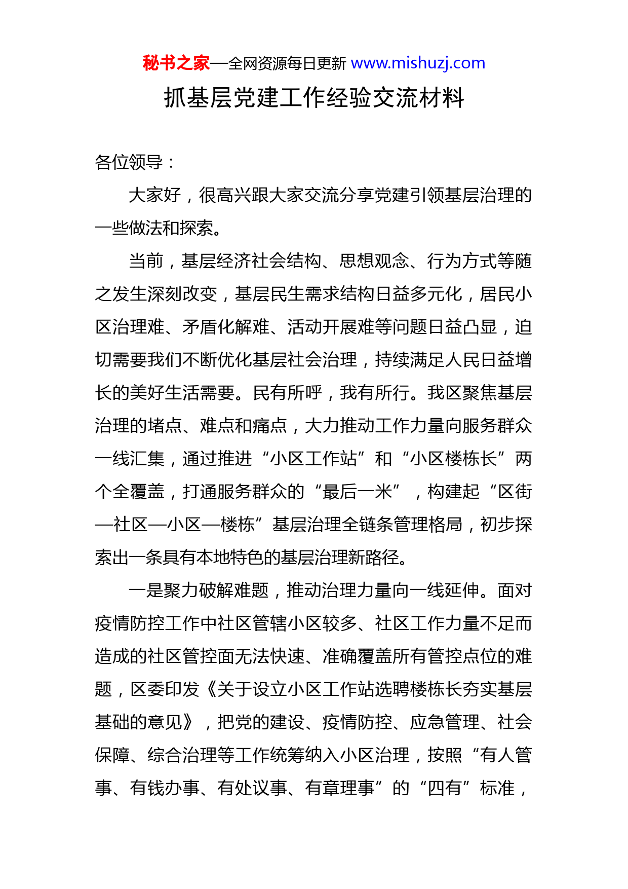 秘书之家—全网资源每日更新www.mishuzj.com抓基层党建工作经验交流材料各位领导:大家好,很高兴跟大家交流分享党建引领基层治理的一些做法和探索。当前,基层经济社会结构、思想观念、行为方式等随之发生深刻改变,基层民生需求结构日益多元化,居民小区治理难、矛盾化解难、活动开展难等问题日益凸显,迫切需要我们不断优化基层社会治理,持续满足人民日益增长的美好生活需要。民有所呼,我有所行。我区聚焦基层治理的堵点、难点和痛点,大力推动工作力量向服务群众一线汇集,通过推进“小区工作站”和“小区楼栋长”两个全覆盖,打通服务群众的“最后一米”,构建起“区街—社区—小区—楼栋”基层治理全链条管理格局,初步探索出一条具有本地特色的基层治理新路径。一是聚力破解难题,推动治理力量向一线延伸。面对疫情防控工作中社区管辖小区较多、社区工作力量不足而造成的社区管控面无法快速、准确覆盖所有管控点位的难题,区委印发《关于设立小区工作站选聘楼栋长夯实基层基础的意见》,把党的建设、疫情防控、应急管理、社会保障、综合治理等工作统筹纳入小区治理,按照“有人管事、有钱办事、有处议事、有章理事”的“四有”标准,秘书之家—全网资源每日更新www.mishuzj.com通过新建、改建、临建的方式,建设466个小区工作站,配备4900余名楼栋长,成立498个小区党组织,派驻101名党建指导员,治理力量在小区全线集结,工作触角在基层蔓延扎根,党的组织和工作在小区全面覆盖。二是聚力服务民生,推动治理能力向高效迈进。作为社区工作的“小分队”,小区工作站和小区楼栋长距离居民群众最近,是社会治理和动员服务群众的“前沿阵地”。全区4900余名楼栋长主动亮出楼长身份、主动了解居民所需、主动回应居民呼声,通过落实“敲门问需送关怀”行动,奔走在小区、楼栋等疫情防控一线,履行“数据员、信息员、宣传员、服务员、调解员、监督员、安全员”的“七员”职责,为社会治理的“末梢神经”高效运转提供有力保障。疫情防控期间,楼栋长累计深入78.9万户(次)群众家庭,敲门问需求,第一时间收集民意、发现问题、反映问题,实现了民情速递。先后有两万余名党员群众到社区报到,组成各类社区志愿服务队,成为基层治理的“生力军”。三是聚力资源衔接,推动治理体系向共治转变。在创新实践中,我们通过建设小区工作站、选聘楼栋长,搭建起基层治理最便捷的“治理基站”,精准链接起了居民自治、物业服务和社区治理的三方资源,形成了小区“生活圈”“服务圈”“管理圈”高度统一、共建共治有效衔接秘书之家—全网资源每日更新www.mishuzj.com的小区治理新格局。比如,有热情、有意愿、有能力参与小区治理居民加入楼栋长队伍,在小区工作站的指导下开展工作,实现了居民自治和社区治理的有效融合;楼栋长定期收集居民关心的烦事难事,由工作站及时反馈物业服务企业,督促提升服务质量,实现了居民自治和物业服务的高效协同;小区党组织及时将热心小区服务、工作吃苦耐劳的楼栋长、志愿者和物业从业者等骨干力量培养发展为党员,推荐进入业委会或社区“两委”,实现了党建引领和居民自治的高度契合。下一步,我们将认真贯彻落实全市组织部长会议精神,重点在党建引领城市社区和农村治理两大领域出实招:一是开展城市党建提质行动。积极探索社区物业党建联建,调整优化网格设置,建立健全小区党组织、楼栋党小组、党员中心户“三位一体”组织链条。大力开展“红色物业”示范创建活动和“三无”小区清零行动,持续发挥小区工作站效能,着力打造一支以小区党组织为核心,楼栋长、志愿者、在职党员为骨干的末梢治理力量。全面建立小区党组织领导下的居委会、业委会、物业服务企业协调运行机制,有效调动各方力量参与基层治理。二是开展农村精细管理行动。以城中村管理提升为突破口,通过“治乱、补短、提升、增收”四措并举,进一步优化城中村人居环境,提升城中村管理精细化水平,疏通城中村治秘书之家—全网资源每日更新www.mishuzj.com理“痛点”“难点”,有效破解全区城中村治理难题,探索建立一套可复制、常态化管理新模式。目标明确,干在当下。我们将坚决贯彻市委部署要求,抓重点,攻难点,创亮点,以时不我待的精神,抓铁留痕的劲头,奋力谱写党建引领基层治理新篇章,为推动现代化城市建设提供坚强有力的组织保障。