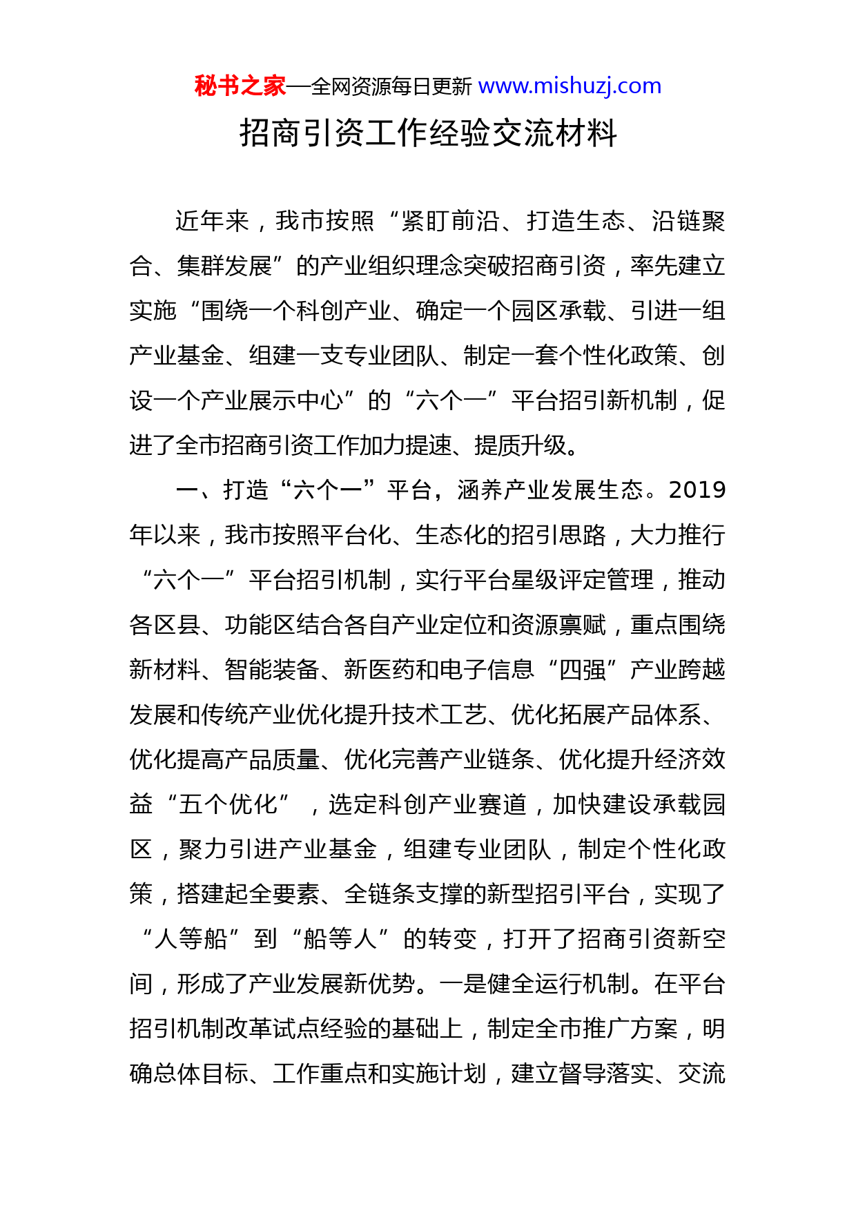 秘书之家—全网资源每日更新www.mishuzj.com招商引资工作经验交流材料近年来,我市按照“紧盯前沿、打造生态、沿链聚合、集群发展”的产业组织理念突破招商引资,率先建立实施“围绕一个科创产业、确定一个园区承载、引进一组产业基金、组建一支专业团队、制定一套个性化政策、创设一个产业展示中心”的“六个一”平台招引新机制,促进了全市招商引资工作加力提速、提质升级。一、打造“六个一”平台,涵养产业发展生态。2019年以来,我市按照平台化、生态化的招引思路,大力推行“六个一”平台招引机制,实行平台星级评定管理,推动各区县、功能区结合各自产业定位和资源禀赋,重点围绕新材料、智能装备、新医药和电子信息“四强”产业跨越发展和传统产业优化提升技术工艺、优化拓展产品体系、优化提高产品质量、优化完善产业链条、优化提升经济效益“五个优化”,选定科创产业赛道,加快建设承载园区,聚力引进产业基金,组建专业团队,制定个性化政策,搭建起全要素、全链条支撑的新型招引平台,实现了“人等船”到“船等人”的转变,打开了招商引资新空间,形成了产业发展新优势。一是健全运行机制。在平台招引机制改革试点经验的基础上,制定全市推广方案,明确总体目标、工作重点和实施计划,建立督导落实、交流秘书之家—全网资源每日更新www.mishuzj.com会商等工作机制,按照成熟一项、运转一项的原则,协调、督导各区县、功能区建立平台和运行机制同步进行,相互交流学习,确保机制顺利实施。二是实施整改提升。在全面推广实施招引机制的基础上,对“六个一”平台涉及的科创产业、承载园区、展示中心、产业基金、专业团队和个性化政策进行再分析、再研判、再定位,集中排查、整改存在的问题,组织开展现场观摩交流,加强调度、督导,全方位实施优化提升行动。三是开展星级管理。对“六个一”招引平台实行星级长效管理,全面开展评级评价并纳入综合考核,实行动态管理。各区县、功能区按照评价标准制定改进措施,弥补短板弱项,促进平台优化升级,持续扩大招引质效,力促招引数量和质量“双提升”。二、依托“六个一”平台,拓展精准招引路径。充分发挥“六个一”平台要素集成的“一体化”招引优势,推动各区县拓展招商渠道和路径,对区域重点产业实现精准招引,变“事倍功半”为“事半功倍”。一是实施资本招商。依托平台产业基金,探索实施基金招商新模式,积极搭建“基金+项目”对接服务平台,充分发挥政府引导基金引领撬动作用,吸引更多社会资本来淄投资发展,实现基金招引项目落地、项目依托基金建设的发展路径。二是实施产业链招商。围绕平台确定的科创产业,借助专业机构秘书之家—全网资源每日更新www.mishuzj.com和高端智库力量,编制产业发展手册,绘制产业链招商图谱,挖掘产业链上下游潜在合作伙伴,强化“链主”企业和“配套”企业的纵向合作,因势利导推进产业招商,精准招引迈出坚实步伐。三是实施“朋友圈”招商。与平台产业龙头企业合作建立专业招商团队,发挥企业市场主体作用,深入挖掘招商线索,灵活利用客户答谢会、订货会、战略合作洽谈会等方式,以项目为牵引,通过“呼朋唤友”实现“招朋引伴”。三、融合“六个一”平台,提升投资服务品质。进一步强化“六个一”平台建设运行和项目落地服务的融合推进,不断优化项目评估、洽谈、审批、建设服务流程,最大程度缩短周期,推动项目早落地、早投产、早达效。一是开展重点项目评估。加强对招引项目的评估评价,改变过去“剜到篮子里就是菜”的盲目招引方式,采用“1+1+N”(投资促进部门+专家智库+相关区县和市直部门、单位)评价模式,围绕项目的高线(经济价值、产业价值、生态价值)和低线(项目投资方实力、信用状况,项目技术先进性和成熟度、项目潜在风险等)进行评估。对重点招商项目实行应评尽评,从源头上保证项目质量,避免“假大空”。二是打造平台服务矩阵。建立护商专员制度,筛选重点招商项目和重点企业,组建市、区县两级护商专员队伍,为项目和企业提供“24小时不打烊、360秘书之家—全网资源每日更新www.mishuzj.com度无死角”服务,全力推动项目签约落地、开工建设、竣工投产,形成招商引资项目和重点企业全生命周期护商服务。三是推动项目加快落地。设立24小时服务热线电话,全面征集项目推进落地过程的各类问题,制定分流交办、联合会商、提级推进三类“问题清单”,全过程跟踪推进解决,加快项目建设步伐,助力项目早投产、早见效,各类诉求事项及时办结率达到100%。