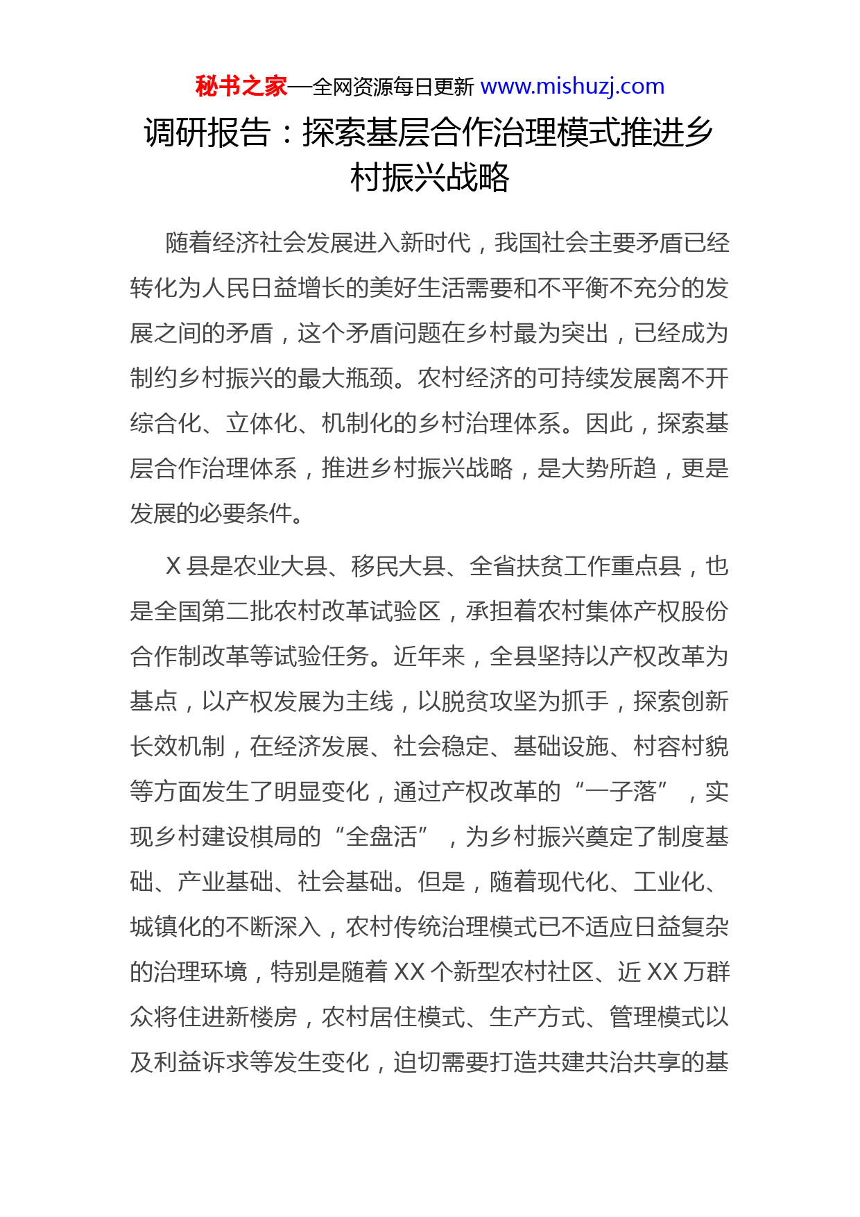 秘书之家—全网资源每日更新www.mishuzj.com调研报告:探索基层合作治理模式推进乡村振兴战略随着经济社会发展进入新时代,我国社会主要矛盾已经转化为人民日益增长的美好生活需要和不平衡不充分的发展之间的矛盾,这个矛盾问题在乡村最为突出,已经成为制约乡村振兴的最大瓶颈。农村经济的可持续发展离不开综合化、立体化、机制化的乡村治理体系。因此,探索基层合作治理体系,推进乡村振兴战略,是大势所趋,更是发展的必要条件。X县是农业大县、移民大县、全省扶贫工作重点县,也是全国第二批农村改革试验区,承担着农村集体产权股份合作制改革等试验任务。近年来,全县坚持以产权改革为基点,以产权发展为主线,以脱贫攻坚为抓手,探索创新长效机制,在经济发展、社会稳定、基础设施、村容村貌等方面发生了明显变化,通过产权改革的“一子落”,实现乡村建设棋局的“全盘活”,为乡村振兴奠定了制度基础、产业基础、社会基础。但是,随着现代化、工业化、城镇化的不断深入,农村传统治理模式已不适应日益复杂的治理环境,特别是随着XX个新型农村社区、近XX万群众将住进新楼房,农村居住模式、生产方式、管理模式以及利益诉求等发生变化,迫切需要打造共建共治共享的基秘书之家—全网资源每日更新www.mishuzj.com层合作治理格局。作为主要负责同志,必须将这一身系群众利益、事关发展大局的民生实事作为当前一项重大的政治任务,切实把推进乡村振兴的基础打好,让现代农村迸发新的活力。围绕这一主题,近期,我深入农村一线,进行了专题调研和深入思考。一、全县基层治理的现状1.基层党支部在基层合作治理中始终扮演着“核心堡垒”。农村基层治理,是社会治理的重点,也是基层党建工作的重点。近年来,XX县在探索基层治理工作中,始终把强化党组织领导核心地位放在首位,以抓党建促脱贫攻坚行动为统领,以“书记项目”为抓手,全面建设过硬党支部,持续整顿软弱涣散党组织,XX个后进班子全面转变同时,选派XX名优秀机关干部到村任职支部书记,为基层党组织注入新鲜血液,选优配强了村级班子,全县农村基层党组织大部分已经成长为政治过硬、素质过硬、能力过硬、发展过硬的坚强战斗堡垒。特别随着农村综合改革和市场经济的深入推进,基层党组织正确处理与新的经济组织、社会组织、群众自治组织之间的关系,确保党组织在基层社会治理中始终处于领导核心地位,发挥了总揽全局协调各方的作用。秘书之家—全网资源每日更新www.mishuzj.com2.新型农村合作组织在村级经济发展中成为“重要力量”。XX县薄弱村多、村级积累少,经营性资产过百万元的村不足XX%,但荒山、荒坡、荒坑及村庄内闲散荒地等村集体资源丰富。近年来,XX县以土地资源和政策资金为要素,按照“因村制宜、厘清产权、分类推进”的思路,探索“土地资源份额化、扶持资金股份化”改革模式,激活内在资源、内部资产,盘活外部资金,创新了合作经营形式,构建了集体经济新架构,实现了农民集体合作共赢截至目前,共有XX个村(居)启动实施了集体产权制度改革,其中完成清产核资XX个、成员界定XX个,XX个村成立了股份经济合作社。新型农村合作组织建立与群众、村集体、经济组织之间利益联接关系,保障了农民的收益权、知情权、参与权、监督权,村级管理运行更加规范有序,促进了农村和谐稳定。同时,村集体所得收益,大部分用于基础设施建设、村庄环境改善等民生事业,美丽乡村建设取得长足进步。3.新型农村社区基层治理模式成为发展的“新鲜课题”。XX县境内山区、老区叠加,贫困人口多,贫困程度深,脱贫难度大。XX县把实施新型农村社区建设作为一切工作的重中之重、脱贫攻坚的首要任务,工程总投资XX亿元,规划建设XX个新型社区,涉及XX个乡镇街道,XX万人。秘书之家—全网资源每日更新www.mishuzj.com目前,XX社区已建设完成、XX个社区XX万人实现回迁。社区日益成为各种利益关系交汇点、各种社会矛盾的集聚点、社会建设的着力点和党在基层执政的支撑点,受传统观念等因素的影响,仍存在大量的“一区两制”“一区多制”等现象,社区治理模式创新刻不容缓。4.传统基层治理模式仍然占据“主导地位”。尽管XX个新型农村社区涉及到XX个行政村,占县村居总数的XX%左右,加之部分村居发展充盈着各种类型的土地股份合作社、林业专业合作社、农民专业合作社、家庭农场、农业龙头企业等新型经济组织、新型农业经济体,成为基层治理的重要参与力量,在农村基层治理中发挥着重要作用,但仍有XX%左右的村仍然沿用着传统的治理模式,不能适应新形势新时代发展的要求,逐步暴露出一些问题和制约因素,在一定程度上影响了党的执政基础和社会和谐稳定因此,创新社会基层治理迫在眉睫。二、全县基层治理的问题1.治理主体较单一。由于村集体资源条件受限、对外招商引资力度不够或无法充分利用村集体资源等原因,目前全县近XX%的行政村没有发展经济合作组织,基层治理主体仍然以村“两委”为主。近XX个村党支部功能弱化,依然沿袭旧的传统治理模式管理村庄,不能接受新型社会组秘书之家—全网资源每日更新www.mishuzj.com织进入,在一定程度上陷入农村内部公共服务跟不上、外面公共服务进不来的困局。2.多元主体不对等。长期以来,人们惯性认为