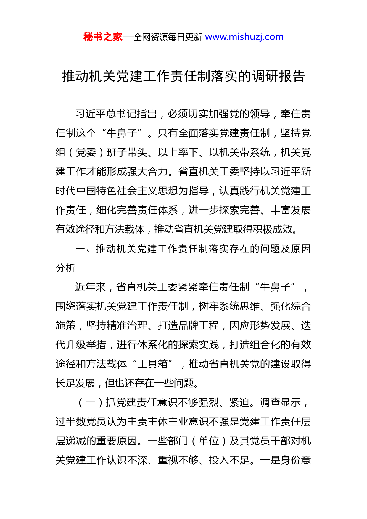 秘书之家—全网资源每日更新www.mishuzj.com推动机关党建工作责任制落实的调研报告习近平总书记指出,必须切实加强党的领导,牵住责任制这个“牛鼻子”。只有全面落实党建责任制,坚持党组(党委)班子带头、以上率下、以机关带系统,机关党建工作才能形成强大合力。省直机关工委坚持以习近平新时代中国特色社会主义思想为指导,认真践行机关党建工作责任,细化完善责任体系,进一步探索完善、丰富发展有效途径和方法载体,推动省直机关党建取得积极成效。一、推动机关党建工作责任制落实存在的问题及原因分析近年来,省直机关工委紧紧牵住责任制“牛鼻子”,围绕落实机关党建工作责任制,树牢系统思维、强化综合施策,坚持精准治理、打造品牌工程,因应形势发展、迭代升级举措,进行体系化的探索实践,打造组合化的有效途径和方法载体“工具箱”,推动省直机关党的建设取得长足发展,但也还存在一些问题。(一)抓党建责任意识不够强烈、紧迫。调查显示,过半数党员认为主责主体主业意识不强是党建工作责任层层递减的重要原因。一些部门(单位)及其党员干部对机关党建工作认识不深、重视不够、投入不足。一是身份意秘书之家—全网资源每日更新www.mishuzj.com识不强,未能充分认识到机关政治属性和共产党员政治义务,对落实好机关党建工作责任制、履行好党建义务的责任意识淡薄。二是压力传导不透,机关党建工作责任缺乏清单规范和引导,工作不上心、不走心,“上热下冷”、层层敷衍等现象一定程度存在。三是工作导向不明。“把抓好党建作为最大的政绩”观念还未牢固树立,“说起来重要、干起来次要、忙起来不要”的现象不同程度存在。(二)抓党建能力水平不够高强、管用。一些部门(单位)及其党员干部抓机关党建工作能力水平与新时代机关党建高质量发展要求不适应。一是全局统筹不够,不能站在统揽“四个伟大”的高度谋划机关党建工作,在全局工作盘子里创造性一揽子落实“四个一起”要求有“落差”。二是工作结合欠佳,对机关党建工作“6条规律”认识把握不够、“5对关系”处理不够科学顺畅,机关党建与业务工作“两张皮”问题还比较突出。三是创新拓展不足,习惯于按照老思维、旧方法开展工作,不能很好满足新生一代党员干部重视自我、泛在互动、乐活趣享等需要。(三)抓党建方法载体不够丰富、有效。一些部门(单位)及其党员干部针对现实情况和问题抓机关党建工作的方法与载体的契合度、科学性、系统化不够。一是工作存在被动性僵硬化问题,不能自觉结合实际主动谋划推秘书之家—全网资源每日更新www.mishuzj.com动机关党建工作,习惯于按照机关工委、上级党组织的要求机械开展工作。二是系统性集成化不足,缺乏科学有效机关党建工作规划,各项工作碎片化,体系化工作思维与方法举措比较缺乏。三是联动性协同化推进乏力,党建工作践行新发展理念、服务区域协同发展的短板比较突出,特别是在跨行政区域、跨系统部门之间协同协力开展机关党建工作,服务成渝地区双城经济圈建设、“一干多支、五区协同”战略部署等国家、省中心工作大局上,实效有待彰显。(四)抓党建考核评价不够动真、碰硬。一些部门(单位)及其党员干部在机关党建考核评价上离求真务实、真刀实枪、动真碰硬要求还有差距。一是内容形式化。工作部署、开展和考核更多落脚在是否召开专题会议、组织相关学习、参加有关活动、制定配套文件以及其次数、规模、人数等。二是手段表面化。台账、记录等纸面资料虽然不再是考核主要依据,但仍然有重大影响,常态、深入、准确、有效的考核评价手段仍缺乏。三是结果平衡化。评先评优仍然存在部门、人员之间权衡平衡,以及与业务工作、专项工作评先评优事项的综合权衡平衡等现象,奖励先进、鞭策后进的效果因此被打折扣。(五)抓党建制度机制不够健全、严密。一些部门(单位)及其党员干部落实机关党建工作责任制与现代秘书之家—全网资源每日更新www.mishuzj.com化、法治化治理要求差距还比较大。一是“破”的方面。原有规章制度明显与新的形势任务不相适应,或明显超出文件最长试行期限,但迟迟不予修订完善或出台正式规范文件,导致相关工作运行缺乏科学有效制度指引。二是“立”的方面。一些工作明显出现规范空白或存在制度性漏洞,但缺乏解决问题的责任心和紧迫感,没有及时启动相关规章制度的论证和制定。三是“举”的方面。有规不依、选择性执行等现象还存在,严重影响机关党建工作责任制的硬性约束效果。二、丰富完善推动机关党建工作责任制落实的方法路径落实机关党建工作责任制,关键是紧紧扭住机关党的组织体系,层层压紧压实有关机关党组织及其负责人责任,紧密围绕党建工作与业务工作深度融合,体系化完善方法、拓展路径,营造人人重视、参与、干好党建工作良好氛围,形成强大合力,推动机关党建工作做实做细做好。(一)对标新时代新定位新职责,机关工委切实加强统一领导1.优化落实统一领导机制。一是抓制度。坚持围绕中心、建设队伍、服务群众,聚焦党委中心大局,把握机关工作共性,完善机关党建形势任务研判机制,认真制定实秘书之家—全网资源每日更新www.mishuzj.com施所属机关年度党建工作要点,进一步加强和改进机关