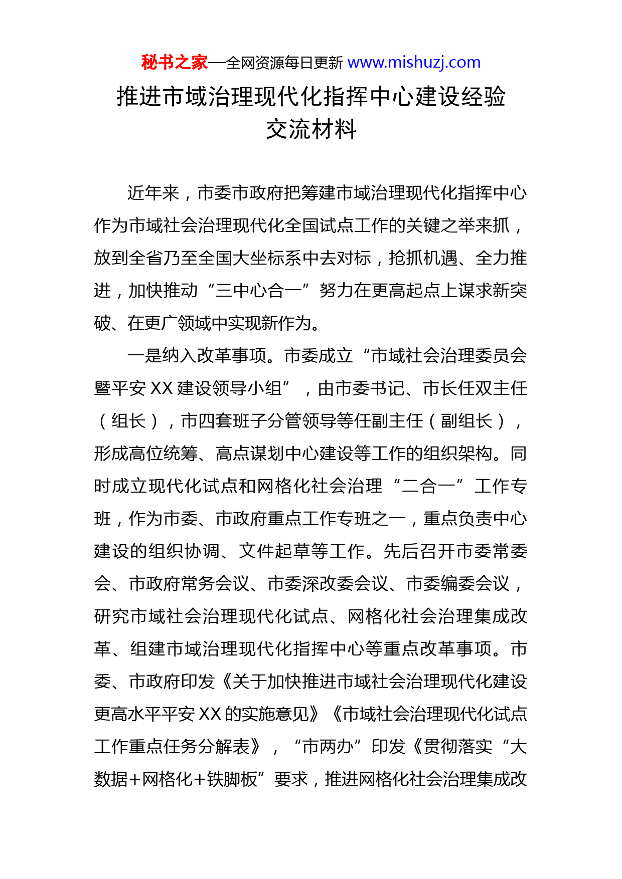 秘书之家—全网资源每日更新www.mishuzj.com推进市域治理现代化指挥中心建设经验交流材料近年来,市委市政府把筹建市域治理现代化指挥中心作为市域社会治理现代化全国试点工作的关键之举来抓,放到全省乃至全国大坐标系中去对标,抢抓机遇、全力推进,加快推动“三中心合一”努力在更高起点上谋求新突破、在更广领域中实现新作为。一是纳入改革事项。市委成立“市域社会治理委员会暨平安XX建设领导小组”,由市委书记、市长任双主任(组长),市四套班子分管领导等任副主任(副组长),形成高位统筹、高点谋划中心建设等工作的组织架构。同时成立现代化试点和网格化社会治理“二合一”工作专班,作为市委、市政府重点工作专班之一,重点负责中心建设的组织协调、文件起草等工作。先后召开市委常委会、市政府常务会议、市委深改委会议、市委编委会议,研究市域社会治理现代化试点、网格化社会治理集成改革、组建市域治理现代化指挥中心等重点改革事项。市委、市政府印发《关于加快推进市域社会治理现代化建设更高水平平安XX的实施意见》《市域社会治理现代化试点工作重点任务分解表》,“市两办”印发《贯彻落实“大数据+网格化+铁脚板”要求,推进网格化社会治理集成改秘书之家—全网资源每日更新www.mishuzj.com革工作方案》,几个重量级文件都明确提出“统筹构建一个联动指挥中心”的目标任务。二是厘定职责任务。研究确定中心九大职责,主要包括指挥协调、监督考核市域治理相关工作,制定并实施市域治理融合发展规划、信息化建设总体规划,拟订市域治理管理事项清单,承担市域治理和综合执法领域重大事项的指挥调度、联动处置以及网格中心、12345政府公共服务热线、政风热线受理事项的流转办理工作,分析研判部门业务数据等等。研究确定中心十大工作任务,逐一明确工单派遣、远程巡查、事项协调、应急指挥、督查指导、情况报告、绩效考核、数据汇聚、研判分析、系统运维等工作要求。三是深化智能建设。建设市域治理联动指挥主平台,按照“顶层设计、分步实施”原则,以信息汇聚共享、业务协同联动、流程闭环可溯、研判科学精准为核心,贯通12345政务公共服务平台、城市综合管理服务平台、网格化社会治理联动平台的业务流转和数据传输通道,融入综合执法业务元素,实现工单一体受理、事项分流处置、办理全程留痕、质态实时监测。建设“市域智慧脑”,依托公安警务大数据中心,全面汇聚整合各类数据资源,强化数据研判分析和结果运用,实现“一屏观天下、一键知体征”;聚焦市域治理一线实战需求,开展数据深度挖掘分秘书之家—全网资源每日更新www.mishuzj.com析,提供数据查询、模型调用、数据预警、可视化展现等多种形式的数据服务。建设“网格智能针”,以推进基层减负为目标,从打通数据壁垒入手,严格遵循基础数据一体化采集思路,推动基层治理“多通变一通”,实现基础数据一次上门、全科采集、动态更新、多方共享。四是建立运行制度。实行一体化的中心管理,有针对性地建立上岗公示、每周例会、联席会议、情况报告、督查督办、安全生产、学习培训等工作运行制度,建立工作人员考核、文明守则、保密、安全保卫和值班、办公设备、财务及固定资产等内部管理制度,提升中心工作规范化水平。实行一体化的分析研判,开展数据整合、数据监测、数据融通、数据汇聚等工作,实现数据安全、数据增值,全力服务为基层社会治理提供常态化、标准化、精准化、科学化、智能化的数据服务,打造互通共享、高效联动、精细管理、精准施策的数据治理新模式。实行一体化的联动处置,对社会治理中的重大问题、领导交办的重要任务和下级上报的疑难事项,及时召开专题部署会、协调推进会等会议,组织工作研讨,加大协调督办力度,扎扎实实做好各项工作,牢牢掌握安全稳定工作的主动权。实行一体化的考评督导,突出分流交办、检查督促、结果反馈、考核评价等重点环节,对每条线索、每件事项,实行全过程监督和结果性考评,做到线上考核数据化、信息秘书之家—全网资源每日更新www.mishuzj.com化,线下考核网格化、社会化。下一步,我们将全面落实省委、省政府关于“大数据+网格化+铁脚板”工作要求,加快推动市域治理现代化指挥中心落地运行,实现城市资源要素集成管理、一体运行、全域联动、融合发展,努力达到“1+1+1>3”的预期成效,进一步增强市域治理的统筹力和执行力。一是在提高站位、找准定位上下功夫。把市域治理现代化指挥中心建设作为贯彻落实党的十九大和十九届四中、五中全会精神的重要举措,作为建设高水平平安XX、高品质法治XX的关键之举,瞄准市域治理的“指挥部”、综治维稳的“统战部”、城市管理的“联勤部”、党政决策的“参谋部”这一总体定位,发挥中心承上启下、协调内外、统筹各方的“综合枢纽”作用,切实支撑公共管理、保障公共安全、助力公共服务。二是在整合资源、集成要素上下功夫。坚持和发扬网格化的到边到底和无缝衔接优势、12345的规范化流转处置优势、城管的长效管理考评机制优势,推动三方业务统分结合、有机融合,做到传统业务不弱化、不断线,增值业务有突破、有亮点,最终形成一个热线管受理、一支队伍管考评、一个
