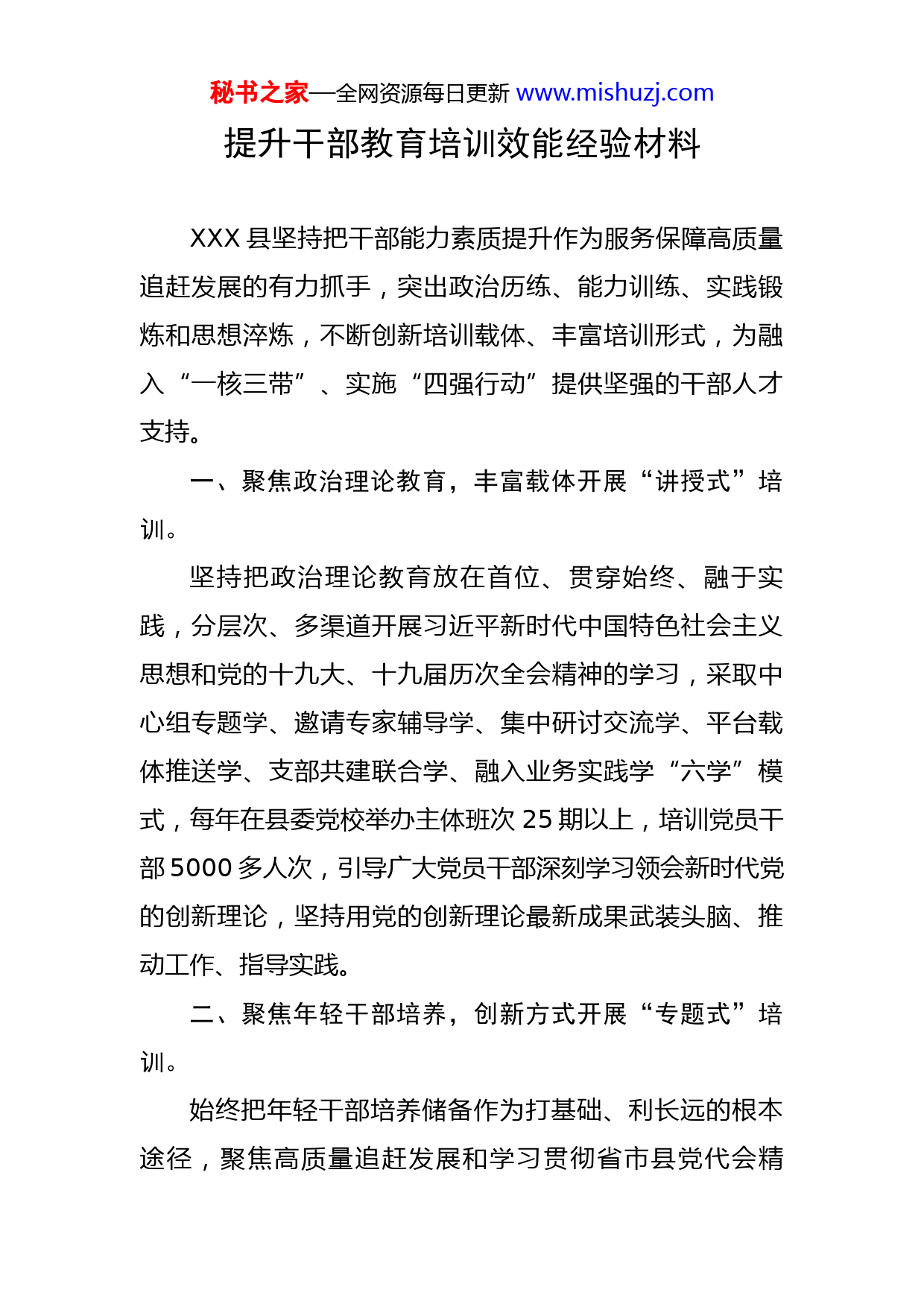 秘书之家—全网资源每日更新www.mishuzj.com提升干部教育培训效能经验材料XXX县坚持把干部能力素质提升作为服务保障高质量追赶发展的有力抓手,突出政治历练、能力训练、实践锻炼和思想淬炼,不断创新培训载体、丰富培训形式,为融入“一核三带”、实施“四强行动”提供坚强的干部人才支持。一、聚焦政治理论教育,丰富载体开展“讲授式”培训。坚持把政治理论教育放在首位、贯穿始终、融于实践,分层次、多渠道开展习近平新时代中国特色社会主义思想和党的十九大、十九届历次全会精神的学习,采取中心组专题学、邀请专家辅导学、集中研讨交流学、平台载体推送学、支部共建联合学、融入业务实践学“六学”模式,每年在县委党校举办主体班次25期以上,培训党员干部5000多人次,引导广大党员干部深刻学习领会新时代党的创新理论,坚持用党的创新理论最新成果武装头脑、推动工作、指导实践。二、聚焦年轻干部培养,创新方式开展“专题式”培训。始终把年轻干部培养储备作为打基础、利长远的根本途径,聚焦高质量追赶发展和学习贯彻省市县党代会精秘书之家—全网资源每日更新www.mishuzj.com神,固化专题辅导、现场教学、情景教学、体验教学、研讨教学、案例教学、网络教学、警示教育、社会调研、拓展训练等“十种”培训模式,严把学员选派关口,以35岁以下优秀年轻干部为重点,举办为期1个月的中青年干部培训班。以“全覆盖、专业化、破难题、过难关”为总要求,对新任科级干部、党务干部等进行全覆盖轮训,每年举办各类重点班次5期以上,培训优秀年轻干部400余人。三、聚焦特色经验推广,精心谋划开展“体验式”培训。始终把特色经验推广作为提升干部能力素质的有力举措,充分挖掘打造了讲述脱贫故事、观摩特色产业、调研乡村振兴、开展党性(廉政)教育、讲解农业实用技术等5条体验式现场教学路线,让参训学员切身感受脱贫攻坚、乡村振兴、产业发展、党性教育的丰硕成果和典型经验。依托全国脱贫攻坚典型太石镇后地湾村的成功脱贫之路,探索打造了情景访谈体验教学,省市县委党校先后邀请授课组开展培训25场次,培训党员干部1.1万人次。充分挖掘XXX儿女进新疆记、XXX长征故事、陇右革命等红色资源,创设情景“微党课”,使学员如临其境,思想受到深刻启迪,理想信念更加坚定。四、聚焦思维眼界拓展,紧盯需求开展“赴外式”培秘书之家—全网资源每日更新www.mishuzj.com训。坚持把干部专业化能力提升作为实施“四强行动”的有效抓手,依托东西部协作和中央单位定点帮扶有利契机,在山东青岛、浙江杭州、广东深圳等经济发展前沿举办XXX县党政干部能力提升经济管理、项目建设、党建引领高质量发展等专题培训班9期,培训党政干部410余人次。紧盯全县经济管理和公共管理型干部短板,委托上海同济大学培养MBA、MPA高层次干部10名,全部选派到县直经济部门挂职,对于表现突出的4名优秀干部优先提拔重用。五、聚焦实践能力提升,因人设岗开展“体悟式”培训。坚持把体悟和实训作为更新干部思维观念的有效载体,以干部实践锻炼和专业训练为抓手,充分利用东西协作和市县、县乡“双向挂职”契机平台,先后选派20名干部到青岛市市北区开展为期3个月的体悟实训,选派35名年轻干部到市属国有企业、县直经济发展重点部门和川河经济带建设重点乡镇双向挂职,选派37名干部到县内规上企业担任“首席服务员”,通过“零距离”感受、“沉浸式”体验,切实解决干部眼界不宽、思路不活、能力不足、方法不优等“本领恐慌”难题。