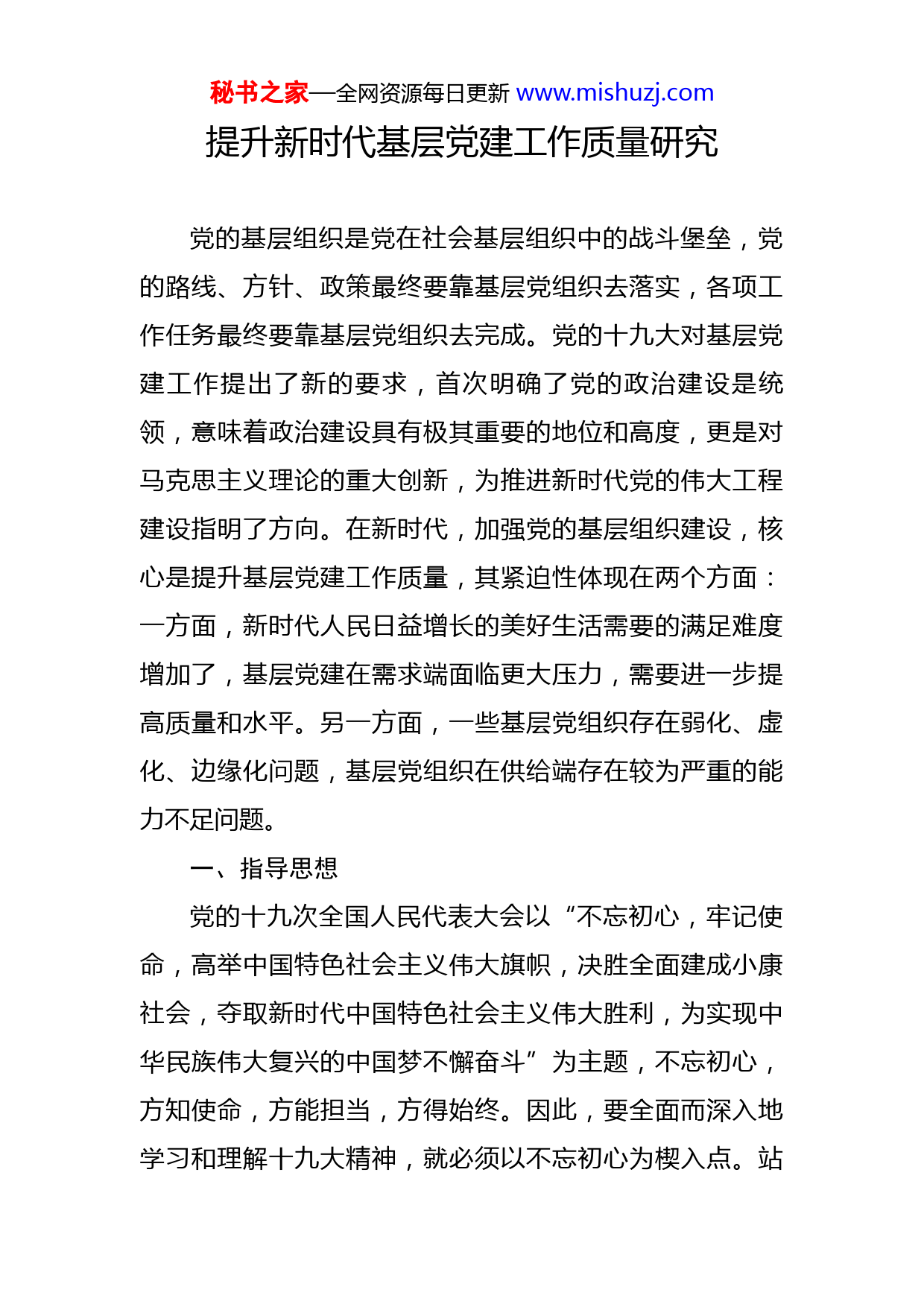 秘书之家—全网资源每日更新www.mishuzj.com提升新时代基层党建工作质量研究党的基层组织是党在社会基层组织中的战斗堡垒,党的路线、方针、政策最终要靠基层党组织去落实,各项工作任务最终要靠基层党组织去完成。党的十九大对基层党建工作提出了新的要求,首次明确了党的政治建设是统领,意味着政治建设具有极其重要的地位和高度,更是对马克思主义理论的重大创新,为推进新时代党的伟大工程建设指明了方向。在新时代,加强党的基层组织建设,核心是提升基层党建工作质量,其紧迫性体现在两个方面:一方面,新时代人民日益增长的美好生活需要的满足难度增加了,基层党建在需求端面临更大压力,需要进一步提高质量和水平。另一方面,一些基层党组织存在弱化、虚化、边缘化问题,基层党组织在供给端存在较为严重的能力不足问题。一、指导思想党的十九次全国人民代表大会以“不忘初心,牢记使命,高举中国特色社会主义伟大旗帜,决胜全面建成小康社会,夺取新时代中国特色社会主义伟大胜利,为实现中华民族伟大复兴的中国梦不懈奋斗”为主题,不忘初心,方知使命,方能担当,方得始终。因此,要全面而深入地学习和理解十九大精神,就必须以不忘初心为楔入点。站秘书之家—全网资源每日更新www.mishuzj.com在新时代的起点上,不忘初心就是要以加强党的长期执政能力建设、先进性和纯洁性建设为主线,全面推进具有根本性的党的政治建设、具有基础性的党的思想建设,以及党的组织建设、作风建设和纪律建设,并把党的制度建设贯穿于全面从严治党之始终,实现治党的系统性、预见性、创造性、实效性,增强党自我净化、自我完善、自我革新、自我提高的能力,把党建成既朝气蓬勃又经得起各种风浪考验的新型马克思主义执政党。二、当前农村基层组织党建工作中存在的问题当前,一些基层党组织在思想上产生偏差,忽略了思想建设工作,对基层党建工作的重视度不足,跟不上时代发展的需要,阻碍了党建工作的展开。部分党员干部没有认识到基层党建工作的重要性,没有将基层党建工作落到实处,导致基层党建工作形同虚设,起不到实质性作用,存在诸多问题。(一)村级党组织方面1.部分村党组织书记没有种好自己的“责任田”,主责主业意识还不强。部分党组织书记对“党要管党、从严治党”的认识不到位,一定程度存在“重经济轻党建、重业务轻党务”的现象,没真正树立“抓党建是最大的政绩”观念。有的借口忙于抓经济发展、社会事业等工作,对党建工作情况不清、思路不明,工作浮在表面,支持少秘书之家—全网资源每日更新www.mishuzj.com投入小,脱离实际。有些作风不民主,村上的事情个人说了算,党务村务、财务管理不规范、不公开、不透明,群众意见大,致使党组织的凝聚力、战斗力不强。2.村干部队伍结构不优,存在“源头活水”不足的问题。目前村干部队伍普遍存在着“年龄大、文化低、技能少”的状况,影响了村级组织作用的发挥。随着农村劳动力向城市大量转移,有知识、有一技之长的青壮年劳动力纷纷外出经商务工,造成村级后备干部严重匮乏,换届中人选难、难选人的问题更加凸显。加之村干部工资待遇普遍偏低、政治上无前途,很难吸引、留住人才,一些农村“能人”不愿担任村干部,甚至一些经济落后村出现没人当村干部的局面。3.农村党员整体素质不高,先锋模范作用发挥不够充分。一些党员党性观念不强,理想信念滑坡,宗旨意识淡化,存在思想不够解放、素质能力与形势发展不相适应、主动服务意识不强等问题。有的党组织为党员发挥作用创造的条件不够,党员管理教育缺乏有效的手段,流动党员管理上还存在漏洞,部分党员在社会公益性服务中不愿发挥先锋模范作用,有些党员在表现上跟普通群众差不多甚至不如普通群众,等等。4.党建基本制度落实不力,务实管用的工作机制、工作载体探索建立的还比较少。有的村两委班子不能认真贯秘书之家—全网资源每日更新www.mishuzj.com彻党内民主集中制,批评与自我批评流于形式。一些基层党组织“三会一课”、组织生活会、民主评议党员等党内生活制度落得不实,空转突出、走样厉害。有的党组织缺乏对新形势党建工作的研究,片面追求词语新、口号新,工作载体的设计,活动与农村发展、群众愿望不合拍。还有一些村软弱涣散,班子内部关系不顺,工作机制不健全,存在无人管事、无章理事、无钱办事现象,党员教育培训、日常组织生活开展不经常、不规范。(二)屯级党组织方面1.有的支部职能作用发挥还不够充分。在新的历史条件下,“推进发展、服务群众、凝聚人心、促进和谐”是基层党组织职能作用的新概括和新定位。从我们XX镇的情况看,党委下属115个党支部,支部书记老龄化严重,思想滞后,业务水平跟不上时代步伐。如有的基层党组织不能及时了解和把握所属党员的思想、工作和学习情况;党员队伍的教育、管理和监督工作也还存在缺陷;对于党内的一系列制度规定,有的在执行与落实上也还不尽到位。这些问题都充分显露了基层党组织在发挥职能作用中的薄弱环节,在一定程度上也影响了基层党组织整体工作的有效推进。2.有的支部组织生活还不够规范。过好党内组织生活,是我们党的性质及其执政地位所决定的,是党要管秘书之家—全网资源每日更新www.m
