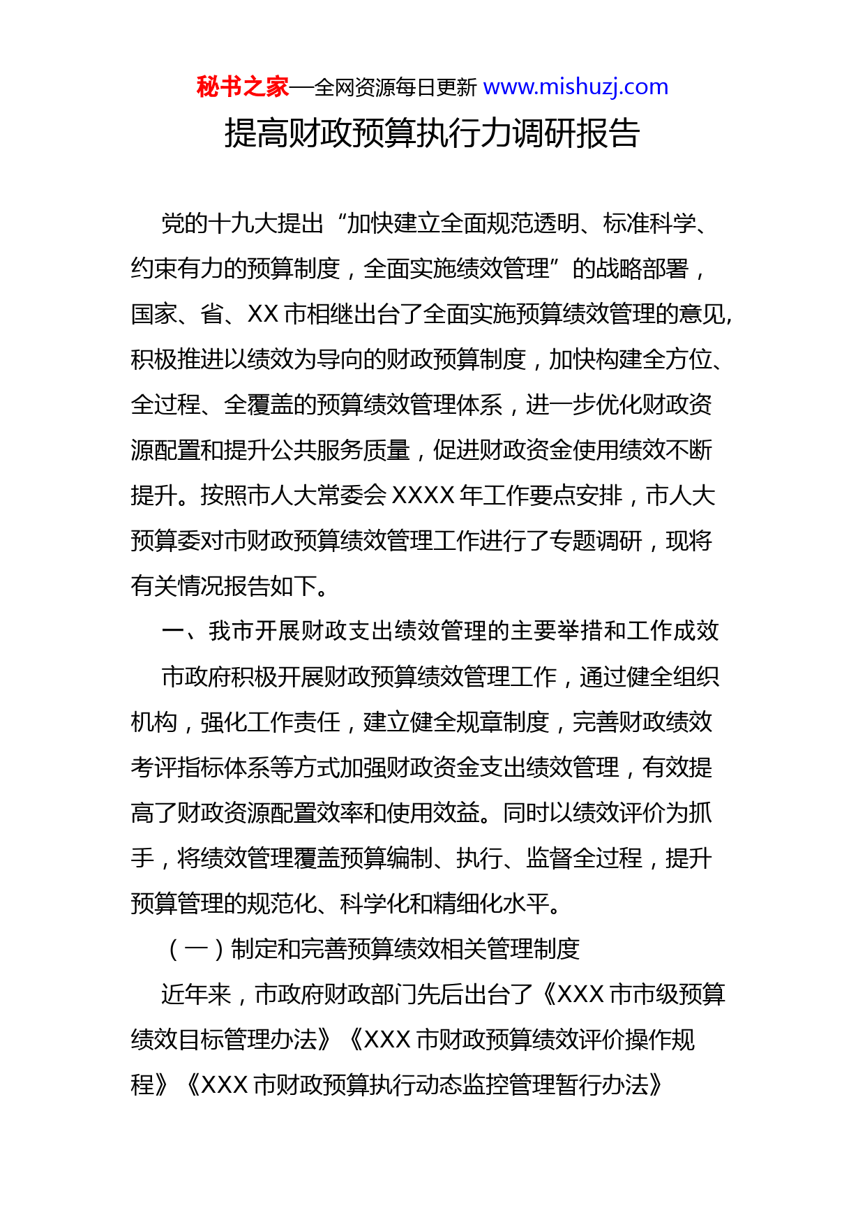 秘书之家—全网资源每日更新www.mishuzj.com提高财政预算执行力调研报告党的十九大提出“加快建立全面规范透明、标准科学、约束有力的预算制度,全面实施绩效管理”的战略部署,国家、省、XX市相继出台了全面实施预算绩效管理的意见,积极推进以绩效为导向的财政预算制度,加快构建全方位、全过程、全覆盖的预算绩效管理体系,进一步优化财政资源配置和提升公共服务质量,促进财政资金使用绩效不断提升。按照市人大常委会XXXX年工作要点安排,市人大预算委对市财政预算绩效管理工作进行了专题调研,现将有关情况报告如下。一、我市开展财政支出绩效管理的主要举措和工作成效市政府积极开展财政预算绩效管理工作,通过健全组织机构,强化工作责任,建立健全规章制度,完善财政绩效考评指标体系等方式加强财政资金支出绩效管理,有效提高了财政资源配置效率和使用效益。同时以绩效评价为抓手,将绩效管理覆盖预算编制、执行、监督全过程,提升预算管理的规范化、科学化和精细化水平。(一)制定和完善预算绩效相关管理制度近年来,市政府财政部门先后出台了《XXX市市级预算绩效目标管理办法》《XXX市财政预算绩效评价操作规程》《XXX市财政预算执行动态监控管理暂行办法》秘书之家—全网资源每日更新www.mishuzj.com《XXX市全过程预算绩效管理实施办法》和《XXX市市级预算绩效信息公开实施细则》等制度,加强全过程预算绩效管理制度的建设,进一步规范了预算资金的支出管理,增强了预算绩效理念。(二)加强预算绩效目标管理市级各部门编制项目绩效目标,财政部门进行审核把关,并将绩效目标作为建设项目库、编制部门预算、实施绩效监控、开展绩效评价的重要基础和依据。全面推进了绩效目标管理,实现预算绩效目标与预算资金安排“编审同步、上会同步、批复同步、公开同步”。(三)强化绩效评价结果的考核财政部门制定了XXXX年财政监督检查(含绩效评价)目标考评实施细则,考评部门资金分配决策和项目管理情况,将财政资金绩效评价结果与市级部门目标考核挂钩。着力推进绩效管理与预算管理的深度融合,充分发挥绩效评价在全过程预算绩效管理中的基础性地位,提升了预算绩效管理的质量和效率。(四)加强预算绩效管理的培训XXXX年X月,市财政局对全市机关事业单位财务人员和分管绩效管理的部门领导XXX多人,举办了“市级预算绩效管理理论及实践”专题培训会。增强部门对财政资金秘书之家—全网资源每日更新www.mishuzj.com使用要“讲绩效、重绩效、管绩效、用绩效”的绩效理念,强化部门的支出责任意识。二、XXXX年预算绩效评价情况(一)财政绩效评价情况预算绩效评价采取部门自评和财政部门委托第三方中介机构评价的方式进行。今年,市财政局对XXXX年的XX个项目开展财政支出绩效评价,涉及资金XXXXX.XX万元(其中财政重点评价项目XX个,涉及资金XXXXX.X万元,单位重点评价项目XX个,涉及资金XXXXX.XX万元);对X个单位开展部门整体支出评价;对X个专项项目开展财政政策绩效评价;对X个部门开展市级预算绩效运行重点监控管理的试点工作。X、第三方中介机构评价的XX个财政重点评价项目涵盖文化、教育、科技、卫生、农业、扶贫、社会保障等方面。评价项目预算资金XX,XXX.XX万元(其中:本级财政资金XX,XXX.XX万元、上级财政资金XXX.XX万元),实际到位资金XX,XXX.XX万元,已使用资金XX,XXX.XX万元,结余资金XXX.XX万元。从评价结果看,XX个项目平均得分XX.XX分,其中XX个项目得分在XX分以上,X个项目得分在XX分以下。评分最高的是市检察院“智慧检察”建设及检察专网专项项目XX分,评分最低的是市生态环境局农村环境连片整治项目XX.XX分。总体来看,重点评价项秘书之家—全网资源每日更新www.mishuzj.com目得分较上年有所提高,XX分以上的比例比上年度提升了XX%。X、整体绩效评价单位X个,分别是市交通局,得分XX.X分;市土储中心,得分XX.XX分;市水务局,得分XX.XX分;市教育局,得分XX.XX分。整体绩效评价的X个部门平均得分XX.X分,比上年度的平均分高X分。X、财政政策绩效评价项目X个,分别是市民政局“幸福美丽新村农房改造”项目,得分为XX.XX分;市教育局“农村义务教育学生营养改善计划”项目,得分为XX.XX分。(二)绩效评价专题审计调查情况XXXX年X月,市审计局对XXXX年度本级财政资金绩效评价情况进行了专项审计调查,并延伸审计调查了市新闻中心、市城市管理局、市规划管理局、市旅游局等XX个一级预算单位。XXXX年,市本级安排项目资金总额XXX,XXX万元,已实施了绩效评价的项目资金总额X,XXX.XX万元,其中:财政重点评价项目XX个,涉及财政资金X,XXX.X万元;指定部门评价项目X个,涉及财政资金X,XXX.XX万元。市本级预算项目支出个数XXX个,纳入部门预算项目支出个数XXX个,编制绩效目标的项目XXX个,编制绩效目标的项目占本级预算项目支出个数秘书之家—全网资源每日更新www.mishuzj.comXX.XX%。市级部门XX个,已进行绩效评价的部门XX个,绩效平均得分XX.XX分。三、财政预算绩效管理工作存在的问题根据市财政局、市审计局对XXXX年项目绩效评价的结果,以及对部分单位进行的走访调研,发现财政预算绩效管理工作还存在以下问题:(一)部分单位对预算绩效管理意识淡薄财政部门虽然在绩效目标、绩效评价、绩效监控、反馈应用等环节做了大量工作,但在预算管