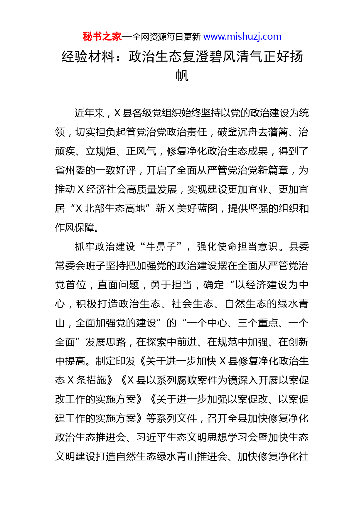 秘书之家—全网资源每日更新www.mishuzj.com经验材料:政治生态复澄碧风清气正好扬帆近年来,X县各级党组织始终坚持以党的政治建设为统领,切实担负起管党治党政治责任,破釜沉舟去藩篱、治顽疾、立规矩、正风气,修复净化政治生态成果,得到了省州委的一致好评,开启了全面从严管党治党新篇章,为推动X经济社会高质量发展,实现建设更加宜业、更加宜居“X北部生态高地”新X美好蓝图,提供坚强的组织和作风保障。抓牢政治建设“牛鼻子”,强化使命担当意识。县委常委会班子坚持把加强党的政治建设摆在全面从严管党治党首位,直面问题,勇于担当,确定“以经济建设为中心,积极打造政治生态、社会生态、自然生态的绿水青山,全面加强党的建设”的“一个中心、三个重点、一个全面”发展思路,在探索中前进、在规范中加强、在创新中提高。制定印发《关于进一步加快X县修复净化政治生态X条措施》《X县以系列腐败案件为镜深入开展以案促改工作的实施方案》《关于进一步加强以案促改、以案促建工作的实施方案》等系列文件,召开全县加快修复净化政治生态推进会、习近平生态文明思想学习会暨加快生态文明建设打造自然生态绿水青山推进会、加快修复净化社秘书之家—全网资源每日更新www.mishuzj.com会生态推进会,采取一系列强有力举措,整体打造政治、社会、自然“三个生态”相得益彰,取得综合效应,全县党风廉政建设和反腐败斗争工作在X年度州级专项检查考核中取得“优秀”名次;同时,县委通过发放纸质版调查问卷、微信APP网络调查等形式,全面开展政治生态问卷调查和修复净化政治生态情况验收工作,党员干部修复净化政治生态的思想自觉和行动自觉明显提升。突出学习教育“压舱石”,厚植对党忠诚底色。县委坚持把深入学习习近平新时代中国特色社会主义思想、党的十九大、十九届历次全会和党的二十大精神和党的重大理论路线方针政策作为各党委(党组)“第一议题”,作为理论学习中心组学习、“三会一课”、政治教育、党员培训的重要内容,扎实开展各类学习教育,教育引导全县党员干部不断提高政治判断力、政治领悟力、政治执行力。坚持党管意识形态、党管新闻媒体不动摇,注重运用县融媒体中心、“金X”微信公众平台和县乡村广播等媒介宣传党风廉政建设亮点做法,举办“廉政文化宣传月+检举控告宣传周+廉政文化‘七进’+廉政文艺节目下乡+廉政大讲堂”活动,全力营造反腐倡廉良好舆论环境。在全县范围深入开展“学习党内法规,强化制度执行”活动,通过对系列案例的反思,教育引导全县党员干部时刻用党章党规“扫描”自己,深刻领悟“两个确立”的决定性意秘书之家—全网资源每日更新www.mishuzj.com义,不断增强“四个意识”,坚定“四个自信”,做到“两个维护”。把稳组织建设“定盘星”,夯实党的执政根基。通过深入开展“党支部建设年”活动、“组织体系建设三年行动”“基层组织规范建设和质量提升年”和“促百分百达标、迎党百年华诞”以评促建活动以及庆祝建党X周年系列活动,持续加大共产党员信仰宗教排查整治力度和党的七项制度落实情况督查力度,以“七个一”措施常态化开展软弱涣散基层党组织排查整顿,强化机关党建“亮灯行动”;因地制宜大力发展村集体经济,截至X年底,村均收益达X.X万元;大力实施村级综合服务中心“提标升级”工程和“阵地温暖”工程,党的领导力、凝聚力、战斗力和号召力大大增强。进一步理顺中小学校党组织隶属关系,实现交叉任职。在“两新”组织选派X名党建指导员、指派X名党支部书记开展驻地指导,“两个覆盖”持续扩大。筑牢正风肃纪“高压线”,立好遵规守纪标尺。县委制定印发的《关于全县党员干部和公职人员禁酒控酒的通知》作为典型经验,被《人民日报》刊登报道,力戒“酒桌文化”,受到了干部群众的一致好评。先后召开县党风廉政建设责任制工作领导小组(扩大)会议、新任职干部座谈会和新一届乡镇领导班子集体谈话会、县直部门“一秘书之家—全网资源每日更新www.mishuzj.com把手”座谈会,认真开展作风纪律整治和整治违规收送礼金问题专项行动等工作,深入挖掘并灵活运用X感恩教育基地和《传承红色基因,筑牢初心使命》情景党课等阵地资源优势,扎实开展政法队伍教育整顿,常态化开展“廉洁提醒”教育,探索形成了“清风X”X+X工作模式,全县党员干部在是非面前的辨别能力,诱惑面前的自控能力,警示面前的醒悟能力明显增强。深刻汲取木里非法采煤问题教训,制定印发《关于以文国栋案为镜鉴开展以案促改持续涵养全县政治生态实施方案》,召开专题民主生活会和生态环境整治及“山水林田湖草”项目“百日攻坚”工作推进集体约谈会,切实以政治生态的山清水秀守护自然生态绿色健康。用好选人用人“指挥棒”,营造干事创业环境。县委坚持把干部队伍建设作为修复净化政治生态的基础和关键来抓,突出“事业为上、人岗相适、人事相宜”的原则,圆满完成县乡村三级组织换届选举。在X年换届工作中,共交流提任X名考核优秀干部,提拔任用X名乡镇一线干部,发现使用X名表现突出的优秀干部,大胆提拔任用X名优秀年轻干部,树立了鲜明的选人用人导向。严格执行《公务员奖励规定》《公务员法》,开展公务员日常管理工