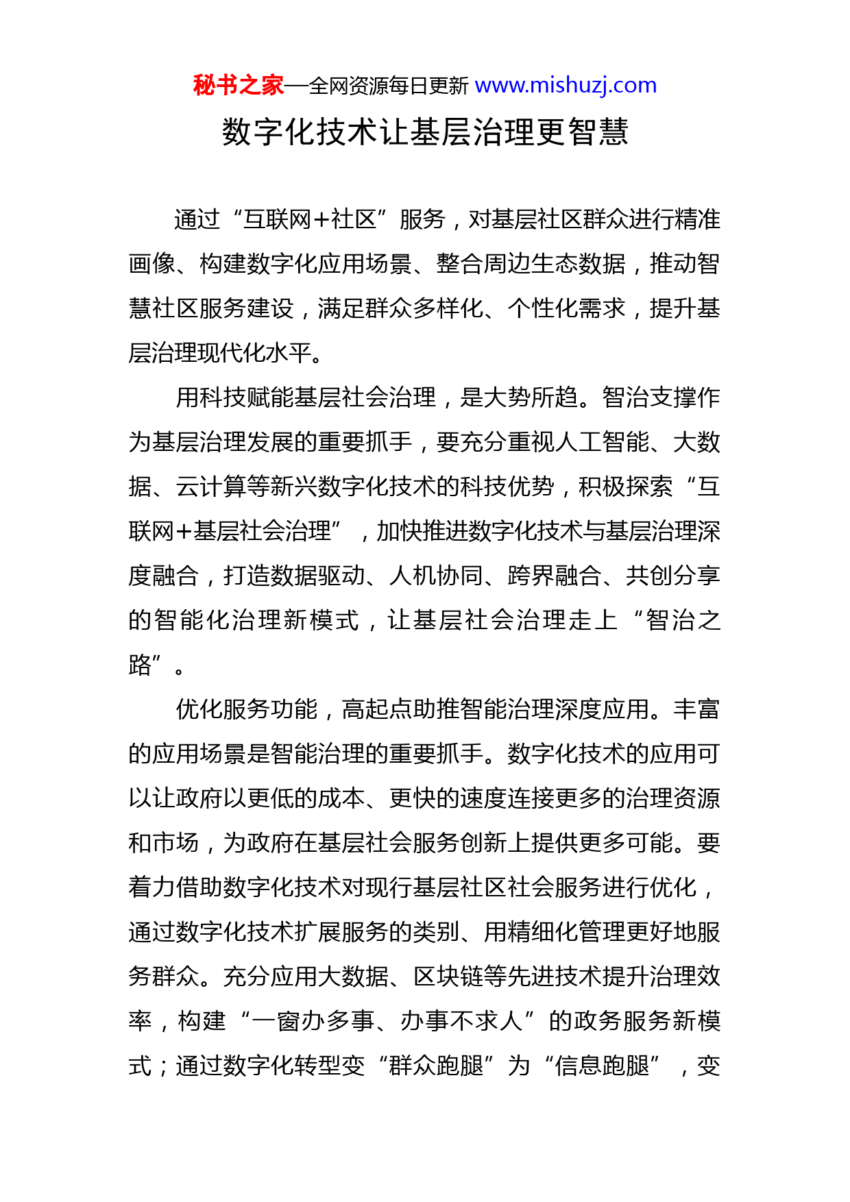 秘书之家—全网资源每日更新www.mishuzj.com数字化技术让基层治理更智慧通过“互联网+社区”服务,对基层社区群众进行精准画像、构建数字化应用场景、整合周边生态数据,推动智慧社区服务建设,满足群众多样化、个性化需求,提升基层治理现代化水平。用科技赋能基层社会治理,是大势所趋。智治支撑作为基层治理发展的重要抓手,要充分重视人工智能、大数据、云计算等新兴数字化技术的科技优势,积极探索“互联网+基层社会治理”,加快推进数字化技术与基层治理深度融合,打造数据驱动、人机协同、跨界融合、共创分享的智能化治理新模式,让基层社会治理走上“智治之路”。优化服务功能,高起点助推智能治理深度应用。丰富的应用场景是智能治理的重要抓手。数字化技术的应用可以让政府以更低的成本、更快的速度连接更多的治理资源和市场,为政府在基层社会服务创新上提供更多可能。要着力借助数字化技术对现行基层社区社会服务进行优化,通过数字化技术扩展服务的类别、用精细化管理更好地服务群众。充分应用大数据、区块链等先进技术提升治理效率,构建“一窗办多事、办事不求人”的政务服务新模式;通过数字化转型变“群众跑腿”为“信息跑腿”,变秘书之家—全网资源每日更新www.mishuzj.com“群众来回跑”为“部门协同办”,让群众享受到“一站式”公共服务的便捷与高效。通过智慧治理的深度应用,提升治理效能,积极开展社会安全监测预警与控制、城镇公共安全风险防控等应用示范与推广,提高基层政府智能感知、科学预警和精准处置的能力。通过“互联网+社区”服务,对基层社区群众进行精准画像、构建数字化应用场景、整合周边生态数据,推动智慧社区服务建设,满足群众多样化、个性化需求,提升基层治理现代化水平。提升治理能力,高标准打造智能治理新模式。通过提升基层治理业务过程的数字化、透明化和智能化水平,进一步增强基层治理能力,探索构建基层治理智能化新模式。首先,基层管控导向向社区共同体导向转变、日常运行从强调控制向注重数字化赋能转变、任务执行从周密计划向数字化精益创新转变、信息管理方面从侧重保密向政务公开转变,从这四个维度的转变着力构建基层组织的领导力,助推基层治理转型。其次,着力推行“共享服务、融合业务和整合决策”的基层治理支持体系,构建基层智能治理新模式。一是充分借鉴北京基层治理“数据池”和深圳“块数据”的经验,加快基层社会服务管理体系数字化建设,将市域街镇、社区(乡村)统一纳入市域信息化建设规划,加快构建基层治理信息化综合平台,实现市域内三级管理和四级应用,以共享服务为目标打破基层治理秘书之家—全网资源每日更新www.mishuzj.com“信息孤岛”。二是着力推进基层治理服务业务流程再造与城乡基层治理功能整合,完善街镇与部门政务信息系统数据资源共享交换机制,以达到城乡基层治理共享服务的“多网合一、一网多能”式高度数字化,提升“政府-市场-社会-群众”多元协同基层治理水平。三是完善市域党政主导型治理与基层社会自治的整合衔接机制,并将“行政+自治”合作型基层治理纳入市域社会治理现代化发展规划及各级政府年度考核体系,助推政府部门横向协同社会治理。构建治理体系,高水平推进智能治理基础建设。通过构建5G网络、物联网、数据中心等基础设施,统筹智慧城市、智慧社区等系统平台和应用终端建设,搭建统一的基层治理智慧云平台,构建贯穿“城市大脑”和“基层细胞”的智能化体系。一是充分借鉴典型智慧城市建设的治理经验,加快推进基层治理场景驱动、流程驱动和数据驱动三轮驱动,实现智能系统架构搭建的中心化和场景应用的个性化。二是借助数字化技术,将可重复利用的基层治理经验进行基层治理“大脑”模块化、微服务化构建,以基层治理服务业务中台、数据中台、人工智能中台等“中台”重构为抓手,弥补基层治理“前台”需求与“后台”资源之间的矛盾,不断提升治理服务的满意度。基于基层治理互联网平台通过连接进行数据聚合,通过国家政务服秘书之家—全网资源每日更新www.mishuzj.com务平台、“渝快办”等App实现数、物、人的融合,为基层治理的数字化转型提供全新的思路。三是加强基层治理数据标准化建设,推进系统联动,强化数据融合,打通地方、部门、企事业单位之间的信息壁垒,切实解决多头管理、重复建设、重建轻用等问题,持续推进基层社会治理智能化、智慧化,力求打造共建共治共享的社会治理新格局。