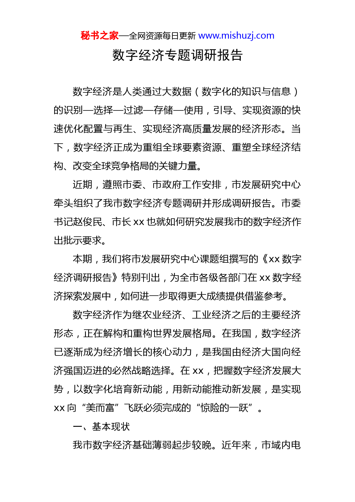 秘书之家—全网资源每日更新www.mishuzj.com数字经济专题调研报告数字经济是人类通过大数据(数字化的知识与信息)的识别—选择—过滤—存储—使用,引导、实现资源的快速优化配置与再生、实现经济高质量发展的经济形态。当下,数字经济正成为重组全球要素资源、重塑全球经济结构、改变全球竞争格局的关键力量。近期,遵照市委、市政府工作安排,市发展研究中心牵头组织了我市数字经济专题调研并形成调研报告。市委书记赵俊民、市长xx也就如何研究发展我市的数字经济作出批示要求。本期,我们将市发展研究中心课题组撰写的《xx数字经济调研报告》特别刊出,为全市各级各部门在xx数字经济探索发展中,如何进一步取得更大成绩提供借鉴参考。数字经济作为继农业经济、工业经济之后的主要经济形态,正在解构和重构世界发展格局。在我国,数字经济已逐渐成为经济增长的核心动力,是我国由经济大国向经济强国迈进的必然战略选择。在xx,把握数字经济发展大势,以数字化培育新动能,用新动能推动新发展,是实现xx向“美而富”飞跃必须完成的“惊险的一跃”。一、基本现状我市数字经济基础薄弱起步较晚。近年来,市域内电秘书之家—全网资源每日更新www.mishuzj.com子商务发展较快,一批高精尖数字化智能制造、电子信息类企业开始入驻xx高新区西北电子城、小巨人产业园等市县园区。同时,为满足社会各方对高品质便捷化党务、政务和公共服务需求,通过“中国建行援建xx智慧治理”服务平台牵引带动,统筹实施各领域数据整合共享,加快推进数字政府建设,为发展数字经济奠定了基础。(一)信息化基础设施加快改造提升。20xx年以来,按照省上统一部署,我市连续四年加快通信基础设施建设行动,成效显著,全市光纤网络、4G网络覆盖的广度、深度、速率较之前大幅提升,为数字经济发展提供基础支撑。截至20xx年底,全市光缆总长累计xx.x万余公里,光纤到户端口达xxx.x万个,互联网宽带用户达xx.x万户,全市xG基站xxxx个、xG用户xxx.x万户,新建xG基站xxx个、新发展xG用户xx.x万户,xG网络覆盖中心城区和县城重点区域,xG网络和光纤宽带网络实现全市所有行政村全覆盖。采用市场化机制以“x+N”多云架构在本地建设的市政务云平台全面建成投入运行,已部署上云信息系统xx个。国家电子政务外网和内网市级节点全面建成,省、市、县三级电子政务骨干传输网全面贯通,国家电子政务外网已覆盖全市镇以上党政机关。(二)政务信息化水平及服务能力不断增强。全市智慧党务平台、政务服务系统、政府网站集约化平台、工程秘书之家—全网资源每日更新www.mishuzj.com建设领域行政审批系统、不动产信息管理系统、住房公积金管理系统、xxxxx政务服务热线、数字城管系统、社会治理综合治理平台、地质灾害预警平台、公共信用信息管理平台、电子公文传输系统、网络协同办公系统、区域卫生信息平台、居民医保管理系统等一大批信息系统陆续建成投入运行,全市电子政务应用水平稳步提升。市智慧治理指挥中心不断汇聚公安、环保、城管、水利等视频资源,接入相关应用系统,初步具备综合指挥能力。在政务服务方面,目前已建成覆盖传统互联网、手机APP、微信公众号、线下实体大厅的一体化政务服务平台,市级xxxx项政务服务事项中,有xxxx项实现“最多跑一次”,xxxx项实现“网上可办”,xxx项实现全程网办。“ixx”APP已汇聚xx市党政各部门和有关单位机构的xx个主题、xx个局(委、办)共计xxx多个便民服务事项,已能基本满足服务群众办事。xx大数据运营公司作为全市首家国有信息化平台运营公司顺利完成体制机制优化调整,系统开发和数字综合服务能力得以增强。(三)社会公共服务信息化走向多元。截至20xx年底,全市社会保障卡累计制发xxx.xx万张,使用社保卡发放和支付相关费用占比达xx.xx%;居民健康卡已累计应用超xxx万人次,线上交易金额x.x亿元,预约挂号、计划免疫、生育证件办理、献血服务等卫生健康业务全部实现秘书之家—全网资源每日更新www.mishuzj.com线上办理;医保电子凭证应用全面铺开,接入定点医院xxx家、定点药店xxxx家、村卫生室xxxx家,群众使用医保电子凭证即可享受“码”上购药和就医;xx公交实现扫码乘车、NFC支付,公交“一卡通”与全国联网,可在xxx个城市刷卡乘坐公共交通工具;“ixx”APP不断拓展民生服务功能,水费、电费、燃气费实现网上交费。汉阴县探索建立城乡安全供水智慧水务体系,有效破解了农村供水投入不足、管理不善、运转不畅等难题,全面改善了xx.x万农村群众的饮水条件,解决x.x万建档立卡人口饮水安全问题。(四)数字经济与传统产业加速融合。我市电商产业已初步与传统产业相融合,全市xx县(市、区)全部创建为国家电子商务进农村综合示范县。xx区数字经济产业园、x西(xx)扶贫空间大数据平台已相继建成,带动发展电商企业xxx家、个体网店xxx多家、手机微店xxxx多家,打造了一批电商创业典型。借助每年在国内外开展的大型招商引资活动,以线上引流和线下展销等形式,将全市各县(市、区)名优特新农产品销往国内外,20xx年仅xx区电商销售农产品就超过x.x亿元。20xx年全市电子商务交易额xxx.xx亿元,电子商务零售额xx.x亿元,本地商品出口xx余个国家和地区。同时,各县(市、区)电商平台和电商产业园积极孵化各类数字化新
