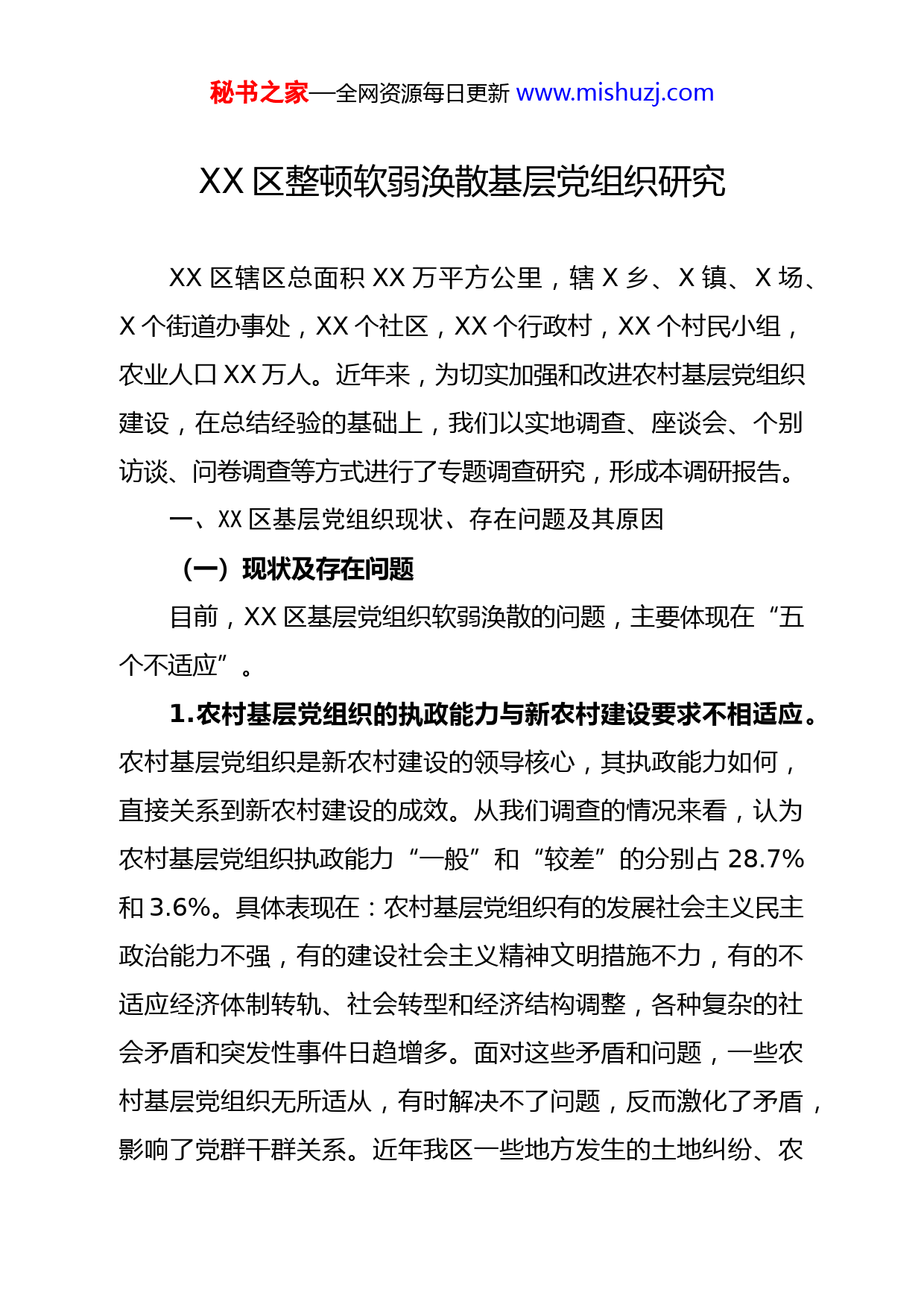 秘书之家—全网资源每日更新www.mishuzj.comXX区整顿软弱涣散基层党组织研究XX区辖区总面积XX万平方公里,辖X乡、X镇、X场、X个街道办事处,XX个社区,XX个行政村,XX个村民小组,农业人口XX万人。近年来,为切实加强和改进农村基层党组织建设,在总结经验的基础上,我们以实地调查、座谈会、个别访谈、问卷调查等方式进行了专题调查研究,形成本调研报告。一、XX区基层党组织现状、存在问题及其原因(一)现状及存在问题目前,XX区基层党组织软弱涣散的问题,主要体现在“五个不适应”。1.农村基层党组织的执政能力与新农村建设要求不相适应。农村基层党组织是新农村建设的领导核心,其执政能力如何,直接关系到新农村建设的成效。从我们调查的情况来看,认为农村基层党组织执政能力“一般”和“较差”的分别占28.7%和3.6%。具体表现在:农村基层党组织有的发展社会主义民主政治能力不强,有的建设社会主义精神文明措施不力,有的不适应经济体制转轨、社会转型和经济结构调整,各种复杂的社会矛盾和突发性事件日趋增多。面对这些矛盾和问题,一些农村基层党组织无所适从,有时解决不了问题,反而激化了矛盾,影响了党群干群关系。近年我区一些地方发生的土地纠纷、农秘书之家—全网资源每日更新www.mishuzj.com田灌溉用水纠纷等,就是当地农村基层党组织缺乏处理复杂问题能力的表现。2.农村党员队伍的整体素质与新农村建设要求不相适应。农村党员是新农村建设的生力军,是贯彻执行党在农村各项方针政策的先行者,是团结带领农民群众共同致富奔康的骨干力量。与此相对照,目前农村基层党员干部队伍的整体素质和能力还存在一定差距,主要表现在“五化五不够”现象:即党员政治信仰和政治热情淡化,对新农村建设重视不够;党员思想意识老化,加快农村发展的朝气不够;党员理想宗旨观念退化,先进性保持不够;党员能力弱化,带头致富作用发挥不够;党员生活作风和工作作风虚化,在群众中威信不够。在一定程度上存在老龄党员无力带头,贫困党员无威信带头,新党员不会带头,个别党员不愿带头的“两无两不”现象。调查情况就显示:农村党员发挥先锋模范作用“一般”的占22%,差的占2.5%。3.农村基层党组织引领经济发展的方式方法与新农村建设要求不相适应。生产发展是新农村建设的中心环节,是实现其他目标的物质基础。在区场经济条件下,大部分农村基层党组织引领经济发展的方式方法简单,村集体经济薄弱,乡村两级维持自身运转捉襟见肘,集体长期负债的问题也无法解决,更谈不上带领群众加快经济发展,这显然是与新农村建设要求不秘书之家—全网资源每日更新www.mishuzj.com相适应的。据调查,当前农村基层党组织指导发展经济的能力一般和较差的占了40.3%。4.农村基层党组织管理体制和运行机制与新农村建设要求不相适应。中央强调,建设社会主义新农村要动员全社会广泛参与,形成推进新农村建设的强大合力。这都为农村基层党组织管理体制和运行机制提出了新的更高要求,但从调查情况来看,目前,农村基层党组织在体质机制上却存在三方面的问题:一是基层党组织设置不合理。原来按行政区域设置的乡村基层党组织,在新形势下“空间覆盖不到位、职能定位不科学、作用发挥不充分”的问题正日益突出。二是基层党组织权责不清晰。如乡镇地域内所设的国土、财政、计生、司法等有吸纳能力的站所,虽确定了行政上双重领导、党务上分块管理的体制,但对如何实施双重领导和分块管理则没有明确规定,造成了人权与事权相分离、财权与事权也相分离的权责不清的现象,乡镇党委政府对它们的管理难以到位和奏效,常常都受到制肘。三是基层组织关系不协调。如实行村民自治以后,农村主要依据《中国共产党农村基层组织工作条例》和《中华人民共和国村民委员会组织法》,从大的框架上规定各级的职能及运作方式,规定了村党支部是村各种组织和各项工作的领导核心,但现实中有的村委会部分班子成员作用发挥不突出,开展工作存有畏难情绪。所有这些,都突显了农村党政管理体制和运行机秘书之家—全网资源每日更新www.mishuzj.com制的不足,使新农村建设难以形成强大的合力。5.农村基层党组织在发挥农民主体作用方面与新农村建设要求不相适应。建设新农村,政府是主导,农民是主体。农民主体作用发挥得不充分,新农村建设就会成为一句空话。调查结果显示,当前农村基层党组织在发挥农民主体作用方面,认为一般和较差的占了35.6%。具体表现在:一是调动农民的积极性不力。农村基层党组织在引导农民建设新农村工作中,对新农村建设的宣传不够、指导不力,一些农民“等、靠、要”的思想还比较严重,少数群众甚至有抵触情绪。二是吸引新农村建设人才工作不力。大部分青壮年农民长期外出务工,且其中多数都不愿意回来。现在从事农业生产的多是老年人、妇女,新农村建设队伍结构严重失衡。三是对新农村建设的主体利益保障不力。基层组织对一些惠农政策缺乏配套措施,农民感觉实惠不多,在很大程度上影响了农民参与建设的积极性。如农民不愿意参与农村新型合作医疗的原因,就是与之相配套的医疗体制改革没有跟上,政府给农民的实惠被某些定点医院高昂的医疗费抵消了。(二)问题的主要成因1.个体因素。党员