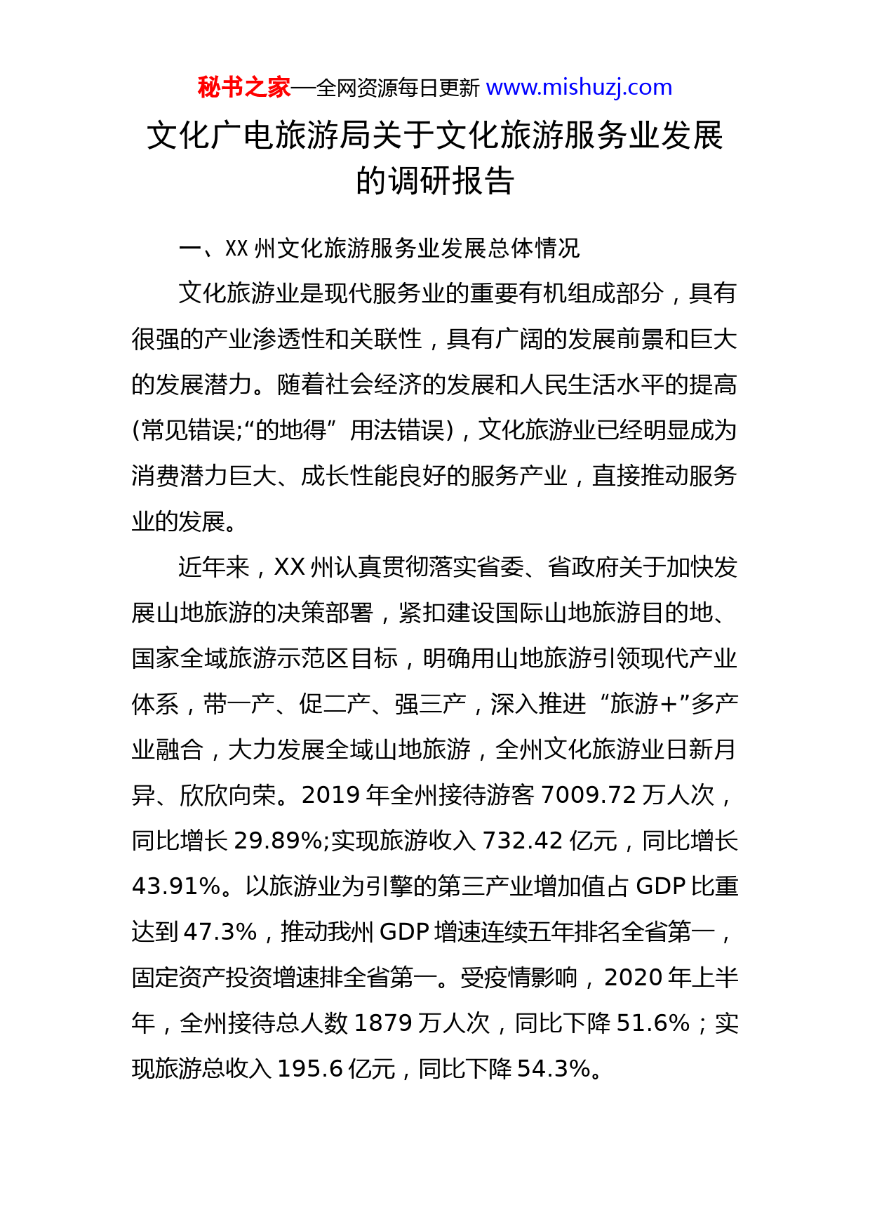 秘书之家—全网资源每日更新www.mishuzj.com文化广电旅游局关于文化旅游服务业发展的调研报告一、XX州文化旅游服务业发展总体情况文化旅游业是现代服务业的重要有机组成部分,具有很强的产业渗透性和关联性,具有广阔的发展前景和巨大的发展潜力。随着社会经济的发展和人民生活水平的提高(常见错误;“的地得”用法错误),文化旅游业已经明显成为消费潜力巨大、成长性能良好的服务产业,直接推动服务业的发展。近年来,XX州认真贯彻落实省委、省政府关于加快发展山地旅游的决策部署,紧扣建设国际山地旅游目的地、国家全域旅游示范区目标,明确用山地旅游引领现代产业体系,带一产、促二产、强三产,深入推进“旅游+”多产业融合,大力发展全域山地旅游,全州文化旅游业日新月异、欣欣向荣。2019年全州接待游客7009.72万人次,同比增长29.89%;实现旅游收入732.42亿元,同比增长43.91%。以旅游业为引擎的第三产业增加值占GDP比重达到47.3%,推动我州GDP增速连续五年排名全省第一,固定资产投资增速排全省第一。受疫情影响,2020年上半年,全州接待总人数1879万人次,同比下降51.6%;实现旅游总收入195.6亿元,同比下降54.3%。秘书之家—全网资源每日更新www.mishuzj.com(一)文化服务业发展情况1、公共文化服务设施不断完善。XX州设置有9个文化行政部门、9个公共图书馆、9个公共文化馆、8个博物馆、126个乡(镇、街道办)综合文化站、1052个村文化服务中心、186个社区(居委会)文化服务中心。2、文化资源丰富多彩。(1)物质文化遗产中,不可移动文物1248处,其中:国家重点文物保护单位(常见错误)9处16个点、省级文物保护单位37处、州级文物保护单位19处、县级文物保护单位413处,涵盖古墓葬、古遗址、古建筑、石刻、近现代史迹和代表性建筑等多个门类。可移动文物种类丰富、数量庞大、价值十分突出,馆藏文物11000余件。还有1个省级历史文化名城、1个历史文化街区、1个历史文化名村和7个中国传统村落。(2)全州非物质文化遗产5000余项,其中:国家级非物质文化遗产保护名录12项18处;省级非物质文化遗产保护名录111项128处;州级非物质文化遗产保护名录244项;县级非物质文化遗产保护名录501项。(3)我州共有文化市场经营单位315家,其中:歌舞娱乐场所167家,互联网上网服务营业场所137家,文艺表演团体8家,演出经纪机构1家,经营性互联网文化单位4家。(二)旅游服务业发展基本情况。秘书之家—全网资源每日更新www.mishuzj.com1.旅游服务业蓬勃发展。全州目前拥有A级旅游景区共34个(其中:4A级景区10个,3A级景区24个)。国家级风景名胜区1个、省级旅游度假区2个、省级风景名胜区6个;国家地质公园、国家森林公园、国家级水利风景区、全国工业旅游示范点各1个,全国农业旅游示范点2个;省级自然保护区4个。全州住宿业达2400余家、7.17万间房、12.45万张床。星级酒店9家(其中:五星级酒店2家<金州翠湖酒店、富康国际酒店>、三星级及以下饭店7家<盘江宾馆、海钰酒店、黔山酒店、贞丰宾馆、安龙泰安酒店、兴义隆泰酒店、安龙鸿钰酒店>);民宿(客栈)331家,其中万峰林景区内就有民宿(客栈)220家,占全州民宿业66.5%。全州精品级、优品级民宿客栈37家。旅行社(国内社)23家、分社13家、网点55家,旅游交通运输服务企业16家,约175辆车(此数据以交通部门为准)。2.旅游服务业提质增效以2014年和2019年数据相比较,我州旅游业近五年发展突飞猛进,表现在以下方面:一是经济“增”。旅游总收入从2014年的112.01亿元上升到2019年的732.42亿元,旅游人数从1526.68万人次增加至7009.72万人次,以旅游业为引擎的第三产业增加值占GDP比重达到47.3%,推动我州GDP增速连续五年排名秘书之家—全网资源每日更新www.mishuzj.com全省第一,固定资产投资增速均排全省前两位。二是项目“实”。围绕国际山地旅游暨户外运动大会、旅游产业发展大会,以市场化投资为主,总投资868亿元,建设项目412个,项目涵盖旅游、体育、文化创意、基础设施、特色小镇等建设。三是景区“多”。全州目前拥有A级旅游景区共34个(其中:4A级景区10个,3A级景区24个)。4A级旅游由2014年的2个发展到目前的10个。目前,义龙山地旅游运动休闲博览园景区已申请4A级旅游景区创建验收,验收结果待省文旅厅公布;晴隆阿妹戚托小镇景区、义龙云屯生态体育公园景区已参加4A级旅游景区景观质量评审会议,评审结果待省文旅厅公布;兴义万峰林景区申报5A级旅游景区工作稳步推进。四是住宿“丰”。住宿业由2014年429家,房间数11253间,床位数2万余张,发展到2019年的2400余家,房间数7.17万间,床位数12.5万余张,从业人员由2014年的4.59万人发展到2019年的12.9万人。2014年达标星级酒店15家,2019年达标星级酒店90家。引进社会资本12余亿元,建成了峰林悦山、野奢蘑菇、峰兮半山、蔸兰小筑等特色民宿酒店。五是交通“畅”。2014年6条航线,飞行3370架次,旅客吞吐量17.4万人次,货邮吞吐量149吨,2019年已培育航线18条,通达城市26个,飞行14767架次,旅客吞吐量138万人次,货邮吞吐量秘书之家—全网资源每日更新www.mishuzj.com1350.6吨。已实现县县通高速,县域高速路网互通,沪昆高铁穿境而过,与高铁时代全面接轨。六是品牌“显”。XX州从2015年起,连续五年成功举办国际山地旅游暨户外运动大会,这是经国务院批准的中国目前唯一一个以山地旅游为主题的国家级、国际性