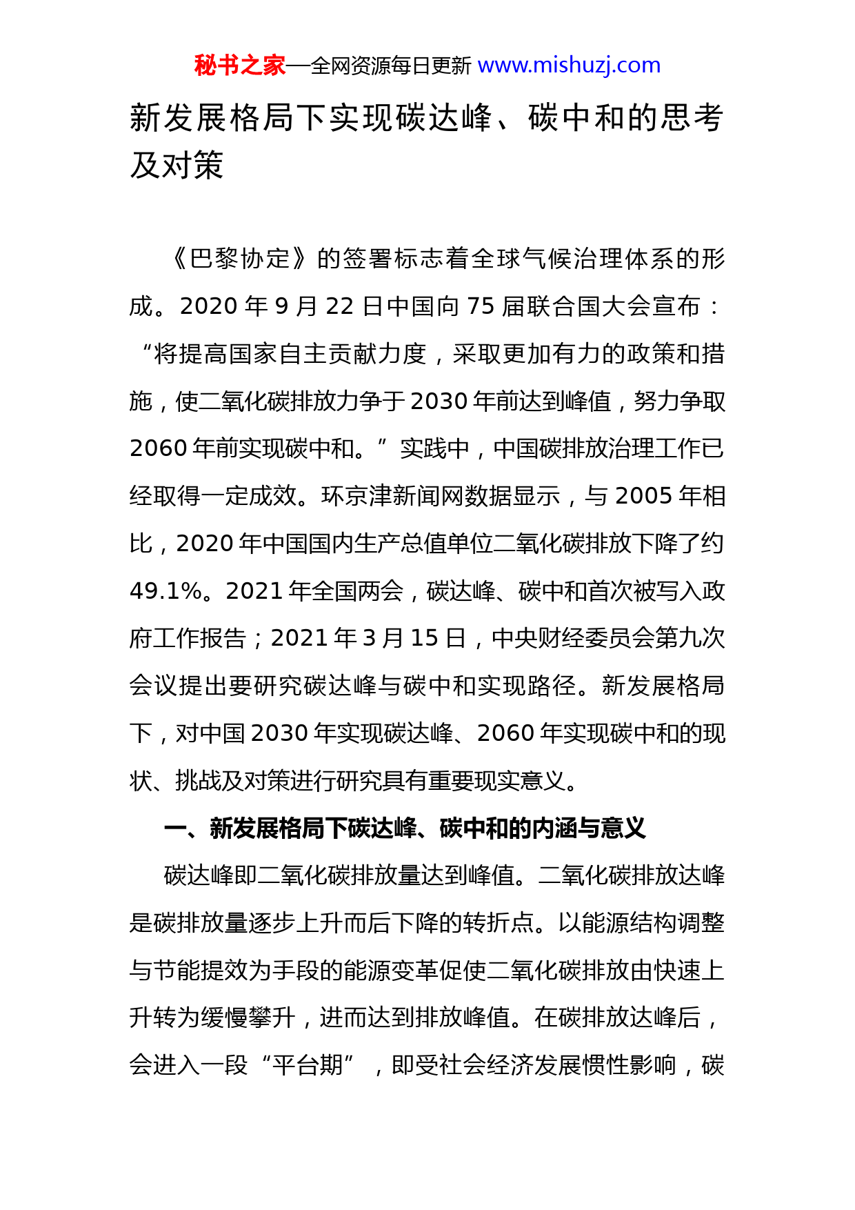 秘书之家—全网资源每日更新www.mishuzj.com新发展格局下实现碳达峰、碳中和的思考及对策《巴黎协定》的签署标志着全球气候治理体系的形成。2020年9月22日中国向75届联合国大会宣布:“将提高国家自主贡献力度,采取更加有力的政策和措施,使二氧化碳排放力争于2030年前达到峰值,努力争取2060年前实现碳中和。”实践中,中国碳排放治理工作已经取得一定成效。环京津新闻网数据显示,与2005年相比,2020年中国国内生产总值单位二氧化碳排放下降了约49.1%。2021年全国两会,碳达峰、碳中和首次被写入政府工作报告;2021年3月15日,中央财经委员会第九次会议提出要研究碳达峰与碳中和实现路径。新发展格局下,对中国2030年实现碳达峰、2060年实现碳中和的现状、挑战及对策进行研究具有重要现实意义。一、新发展格局下碳达峰、碳中和的内涵与意义碳达峰即二氧化碳排放量达到峰值。二氧化碳排放达峰是碳排放量逐步上升而后下降的转折点。以能源结构调整与节能提效为手段的能源变革促使二氧化碳排放由快速上升转为缓慢攀升,进而达到排放峰值。在碳排放达峰后,会进入一段“平台期”,即受社会经济发展惯性影响,碳秘书之家—全网资源每日更新www.mishuzj.com排放在达峰后一段时间内会出现小幅波动。因此,在碳达峰后往往需要一段时间检验碳排放是否真正达峰。通常情况下,一国实现碳达峰是由于经济衰退或经济转型而实现的自然达峰过程。因此,中国提出“力争于2030年前达到峰值”完全属于自我加压的主动行为,具体碳排放峰值为116亿吨tCO2e(吨CO2当量)。从哥本哈根气候大会上拒绝承担超过本国发展水平的绝对量化减排指标,到巴黎气候大会上提出2030年左右实现碳达峰,再到2020年9月22日向联合国大会宣布“使二氧化碳排放力争于2030年前达到峰值”,中国碳排放目标经历了由被动到主动的过程。2021年中央经济工作会议再次强调要做好碳达峰、碳中和工作。2018年10月8日,联合国政府间气候变化专门委员会(IPCC)在韩国仁川发布了《IPCC全球升温1.5℃特别报告》指出,碳中和是一个国家或组织在一年内通过二氧化碳消除技术达到碳排放平衡的过程,也可称之为净零二氧化碳。《特别报告》还提出,碳中和的首要任务是在21世纪末将全球气候变暖限制在1.5℃而非2.0℃。碳中和是人类保护生态环境、避免物种灭绝的根本措施。全国能源信息平台数据显示,全球已有2个国家(不丹和苏里南)实现碳中和,还有25个国家和地区承诺实现碳中和目标(见秘书之家—全网资源每日更新www.mishuzj.com表1)。其中,芬兰与爱尔兰通过执政党联盟协议承诺实现碳中和;哥斯达黎加、欧盟等5个国家和地区通过提交联合国确定碳中和目标;瑞典、丹麦、法国等7个国家通过立法制定碳中和目标;奥地利、冰岛等10个国家向联合国宣布其碳中和目标。大多数国家和地区将实现碳中和目标的时间设置在2050年前后,2020年9月,中国在第75届联合国大会中承诺“努力争取2060年前实现碳中和”,即中国二氧化碳总量需在2060年通过造林、碳捕捉等方式进行回收,实现全国碳排放总量最终为零。新发展格局下,中国实现碳中和目标与本国经济高质量发展、全球经济发展目标是一致的。2021年1月25日,习近平主席在福建考察时提出将碳达峰与碳中和纳入生态省建设布局,进一步明确了“双碳”目标在国家经济建设中所处的定位及其与生态文明建设之间的关系。“双碳”目标对人类改善生存环境及实现绿色低碳生活具有重要现实意义。一方面,实现“双碳”目标可以加快解决气候变暖问题。近些年来,全球气候变暖引起了海平面上升、病虫害增加及土地干旱等问题。极端气候事件及其连带产生的一系列诸如生物濒危等现象,给人类生存带来极大威胁。为此,联合国秘书长号召各国进入“气候紧急状态”,联合国环境署提出“为实现全球气候变暖限制在秘书之家—全网资源每日更新www.mishuzj.com1.5℃目标,需在本世纪中叶实现全球碳中和”。目前实现全球碳中和存在两方面挑战:一是世界各国碳中和目标实现方法存在一定差距;二是全球气候变暖限制在1.5℃目标由各国政府主导推动仍然缺乏社会认知。作为碳排放总量最高国家之一,中国宣布2030年实现碳达峰、2060年实现碳中和目标,并着力加速处理因二氧化碳浓度高而产生的气候变暖等全球性问题。从整体进程看,中国实现碳达峰目标的速度直接关系到世界碳达峰发展进度。另一方面,“双碳”目标的快速实现可有效促进全球经济绿色复苏。因此,中国2030年前碳排放量达峰需兼顾新发展格局下的经济高质量发展,同时要构建节能、高效、清洁、环保的绿色发展格局,以满足人民日益增长的物质需求与“软需求”。新发展格局下,中国承诺“力争于2030年前达到峰值,努力争取2060年前实现碳中和”,在一定程度上向世界展示了推进气候治理的决心,必将为推进社会经济全方位绿色低碳发展、为全球经济绿色复苏作出巨大贡献。二、中国低碳发展现状(一)政策体系趋于完善一方面,国家出台了诸多法律法规及政策,努力夯实低碳发展基础。自1998年以来,中国围绕低碳发展先后出台秘书之家—全网资源每日更新www.mishuzj.com了《中华人民共和国节约能源法》《中国节能产品认证管理办法》、《节能减排“十二五”规家的大力推动下,中国节能减排工作得以有