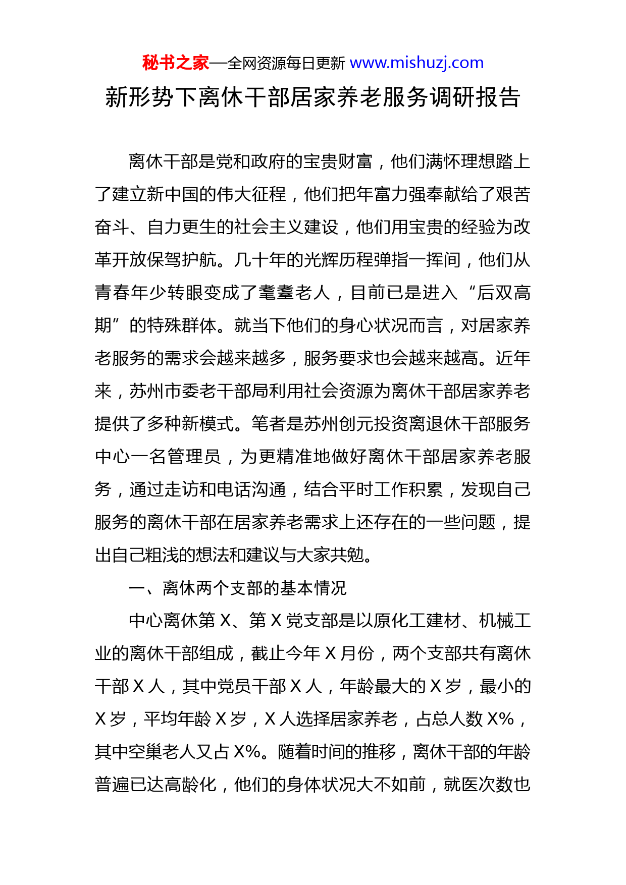 秘书之家—全网资源每日更新www.mishuzj.com新形势下离休干部居家养老服务调研报告离休干部是党和政府的宝贵财富,他们满怀理想踏上了建立新中国的伟大征程,他们把年富力强奉献给了艰苦奋斗、自力更生的社会主义建设,他们用宝贵的经验为改革开放保驾护航。几十年的光辉历程弹指一挥间,他们从青春年少转眼变成了耄耋老人,目前已是进入“后双高期”的特殊群体。就当下他们的身心状况而言,对居家养老服务的需求会越来越多,服务要求也会越来越高。近年来,苏州市委老干部局利用社会资源为离休干部居家养老提供了多种新模式。笔者是苏州创元投资离退休干部服务中心一名管理员,为更精准地做好离休干部居家养老服务,通过走访和电话沟通,结合平时工作积累,发现自己服务的离休干部在居家养老需求上还存在的一些问题,提出自己粗浅的想法和建议与大家共勉。一、离休两个支部的基本情况中心离休第X、第X党支部是以原化工建材、机械工业的离休干部组成,截止今年X月份,两个支部共有离休干部X人,其中党员干部X人,年龄最大的X岁,最小的X岁,平均年龄X岁,X人选择居家养老,占总人数X%,其中空巢老人又占X%。随着时间的推移,离休干部的年龄普遍已达高龄化,他们的身体状况大不如前,就医次数也秘书之家—全网资源每日更新www.mishuzj.com逐年增加,需要人全天候照顾的情况越来越多,但多数老干部传统观念比较强,认为养儿防老,主张亲情照顾,对长年居住的环境、融洽的邻里关系的留恋,社会上集中养老中出现个别负面事件的影响无形中对社会化集中养老有排斥的想法。另外,近年来老干部局开展的“适老化”改造、每月提供离休干部居家一次服务,老干部对组织有信任感,对享受的待遇有满足感,因此绝大部分老干部仍然选择居家养老。二、离休干部相对突出的需求随着离休干部年龄逐年增大,从近几年老干部参加活动频率来看人数逐年减少,一方面是老干部身体疾病客观因素造成,有的腿脚不便、有的视力退化;另一方面老干部的家属子女从外出风险考虑也不愿意他们出门。但居家的老干部仍然在政治上需要学习、生活上需要照顾、医疗上需要帮助,满足多方面的关心照顾显得尤为突出。从现实的工作中发现,离休干部居家养老相对突出的需求主要体现在以下五个方面。一是心理抚慰需求。随着老干部普遍进入“后双高期”,大多数离休干部外出范围变小,社会交往减少,生理上出现记忆力差、耳背等现象,心理上孤独感、寂寞感倍增,迫切希望有人看望聊天,得到心理安慰。在走访过程中,了解到大部分离休干部喜欢聊天,愿意把心里想的秘书之家—全网资源每日更新www.mishuzj.com倾诉出来,比如子女家庭情况、自己被照顾的情况、身体情况等等,每次都会说上半个多小时,老干部一点也不觉得累,反而能看出他们内心的快乐。离休X支部就有一位离休干部,子女不在身边,一个人独居,每次“居家乐”阿姨上门,她要求家务干完要陪聊,这不是笑话,可以想象,老干部心中的寂寞。二是安全保障需求。居家养老的离休干部大部分是独居和空巢老人,一旦在家中突发疾病或发生意外,自我救助能力不够;例如住在虎丘附近的一位离休干部,他在家中不慎摔倒,头破血流。后来在看望他时,他回忆自己摔倒后只感觉头昏昏的,没有注意到头已经磕破,后来钟点工阿姨上门,才通知子女拨打了X救护车,医生说流了好多血要是晚一点就麻烦了。因此,老干部的居家安全必须重视,除了提高自身安全行为外,如何更精准地使用电子保姆,采取应急措施来保障老干部的安全也是必不可少的。三是医疗医护需求。随着年龄的增高,患老年常见疾病已经是普遍现象。近年来,省市开展离休干部看病就医“三有一落实”工作要求,对我市离休干部提供了家庭医生签约服务,普遍得到了老干部的认可。但还需在细致上下功夫。就拿住在桐泾路上的老干部为例,他向单位服务人员反映,最近几个月一直没有家庭医生上门服务,经过秘书之家—全网资源每日更新www.mishuzj.com了解,得知每次家庭医生上门前会电话联系,他有老年性耳背,家中来电他都听不到,导致服务遗漏。定期和不定期医疗咨询服务是保障老干部身心健康的有力措施。四是家政服务需求。离休干部空巢独居、年老体弱是普遍存在的现象。现在居家生活不光光是有一般的洗衣做饭、打扫卫生家政服务,个性化的需求已显得比较突出,购物、购书,代购药物,聊天、读书读报等多方面需求。同时还会遇到一系列突发的问题,比如:家电产品的突然故障需要维修、排污堵漏需要及时抢修等,对于这些情况老干部已经力不从心,都需要有由外来的服务才能得到妥善的处置。因此,对个性化的家政服务需求越来越强烈,涉及的面越来越广,服务项目要求也越来越多。五是精神慰藉需求。离休干部虽然进入“后双高期”,但他们的精神需求没有减弱,有时甚至还表现的尤为突出,只是由于他们的行动不便导致在内容和形式上的有所改变;他们依然保持学习的习惯,希望能和时代同步;他们虽然不能保证每次都能准时参加集体活动,但发挥自己正能量的愿望一点也没有减弱;他们愿意与外界沟通交流,继续得到尊重;他们愿意通过乐于奉献,来体现自我价值。就拿这次疫情而言他们一方面得到组织的关怀;另一方面又主动踊跃捐款,即得到慰藉又弘扬