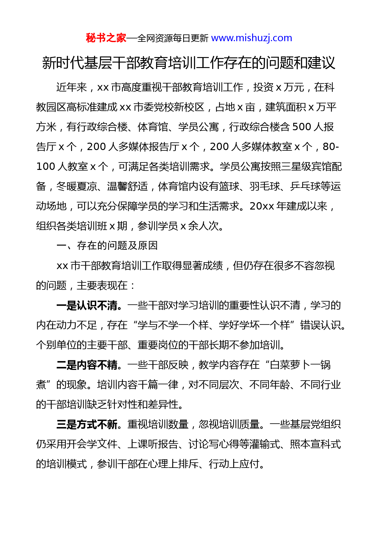 秘书之家—全网资源每日更新www.mishuzj.com新时代基层干部教育培训工作存在的问题和建议近年来,xx市高度重视干部教育培训工作,投资x万元,在科教园区高标准建成xx市委党校新校区,占地x亩,建筑面积x万平方米,有行政综合楼、体育馆、学员公寓,行政综合楼含500人报告厅x个,200人多媒体报告厅x个,200人多媒体教室x个,80-100人教室x个,可满足各类培训需求。学员公寓按照三星级宾馆配备,冬暖夏凉、温馨舒适,体育馆内设有篮球、羽毛球、乒乓球等运动场地,可以充分保障学员的学习和生活需求。20xx年建成以来,组织各类培训班x期,参训学员x余人次。一、存在的问题及原因xx市干部教育培训工作取得显著成绩,但仍存在很多不容忽视的问题,主要表现在:一是认识不清。一些干部对学习培训的重要性认识不清,学习的内在动力不足,存在“学与不学一个样、学好学坏一个样”错误认识。个别单位的主要干部、重要岗位的干部长期不参加培训。二是内容不精。一些干部反映,教学内容存在“白菜萝卜一锅煮”的现象。培训内容千篇一律,对不同层次、不同年龄、不同行业的干部培训缺乏针对性和差异性。三是方式不新。重视培训数量,忽视培训质量。一些基层党组织仍采用开会学文件、上课听报告、讨论写心得等灌输式、照本宣科式的培训模式,参训干部在心理上排斥、行动上应付。秘书之家—全网资源每日更新www.mishuzj.com四是师资不强。基层党校人员有限,能走上讲台的师资力量更是薄弱,“个个都是万金油、什么都能教”。而理论的深度、联系的广度、授课的生动性趣味性等方面十分欠缺。二、意见建议(一)调动干部学习积极性这个“根本”。建议建立领导干部任职资格考试制度,把干部的教育培训情况作为干部选拔任用的重要依据,激发学员学习的积极性。比如,xx市实行干部任职资格考试制度。根据各类岗位职责需要,提出各类干部应具备的政治理论素养、文化知识水平和工作能力要求等任职资格标准,每位拟提拔干部都必须通过考试,对未通过的,给予一次补考机会,对仍未通过的,暂缓提拔使用,充分调动干部学习的主动性和自觉性。(二)精选培训内容这个“主线”。坚持按需培训,针对不同层次、不同类别干部的实际需要,精心设计培训班次和培训内容。首先,必须坚持“党校姓党”的根本原则,把党的理论教育和党性教育作为主业主课,组织广大干部深入学习中国特色社会主义理论体系,将习近平新时代中国特色社会主义思想作为所有班次的必修课程,教育引导干部牢固树立“四个意识”,坚定“四个自信”。抓好党章党规党纪、党的宗旨和作风,党史国史、党的优良传统和政德教育,教育引导党员干部牢记初心使命,永葆共产党人本色。其次,根据自身实际发展情况,加强专业化能力和知识培训。比如,xx市按照建设生态智慧健康文明幸福区域性副中心城市的战略目标,围绕供给侧结构性改革、防范金融风险、脱贫攻坚等十大主题,开展专题培训。第三,秘书之家—全网资源每日更新www.mishuzj.com根据不同的对象,确定不同的培训内容,设置不同的课程,力求突出重点。对科级干部、乡镇干部、科级以下中青年干部、村支部书记、村主任主任、村“两委”成员等不同群体的培训,科学设置内容,力戒“上下一般粗,左右一个样”(三)创新教学方式这个“手段”。县级党校培训的对象大多是来自一线的基层党员干部。建议创新教学方式,在坚持和完善讲授式教学的基础上,根据不同培训内容和不同学员的特点,采取研究式、互动式、案例式、体验式、模拟式等教学方法,进一步增强教学的吸引力和感染力。比如,xx市邀请xx省委党校王志立教授、丁琼博士讲解《领导干部突发事件应急处置》,形式新颖、别开生面且贴合工作实际的课程,受到学员们一致好评。同时,以“温、学、颂”为主题,开展体验式教学。组织学员集体重温入党誓词,学习诵读党章,以红歌歌颂社会主义新中国,真学实唱,读出、唱出精气神,点燃课堂气氛,调动学员的学习热情。(四)强化师资力量这个“保障”。首先,建议加强专职师资队伍建设。比如,xx市委党校现有专职教师x人,其中高级讲师x人,讲师x人,全日制硕士研究生x人。特别是20xx年以来,xx市通过“硕博研究生”、“211-985大学”等人才引进计划,先后为引进x名全日制硕士研究生、x名211大学本科生,师资力量在全省县级党校走在前列。其次,建议加强兼职教师队伍建设。进一步开发、整合、优化兼职培训师资资源,加大聘请优秀领导干部、成功企业家、优秀专业人士和基层一线优秀干部进党校的力度。比如,xx市着力秘书之家—全网资源每日更新www.mishuzj.com打造“四型”兼职教师团队。聘请具有经济、文化、法律、规划等特长的四大班子领导,组建领导型教师队伍;聘请以省委党校常务副校长焦国栋教授为代表的省委党校知名教授、专家学者,组建专家型教师队伍;聘请知名企业高管和专业技术人员,组建管理型教师队伍;聘请优秀乡镇党委书记和农村党支部书记,组建模范型教师队伍。