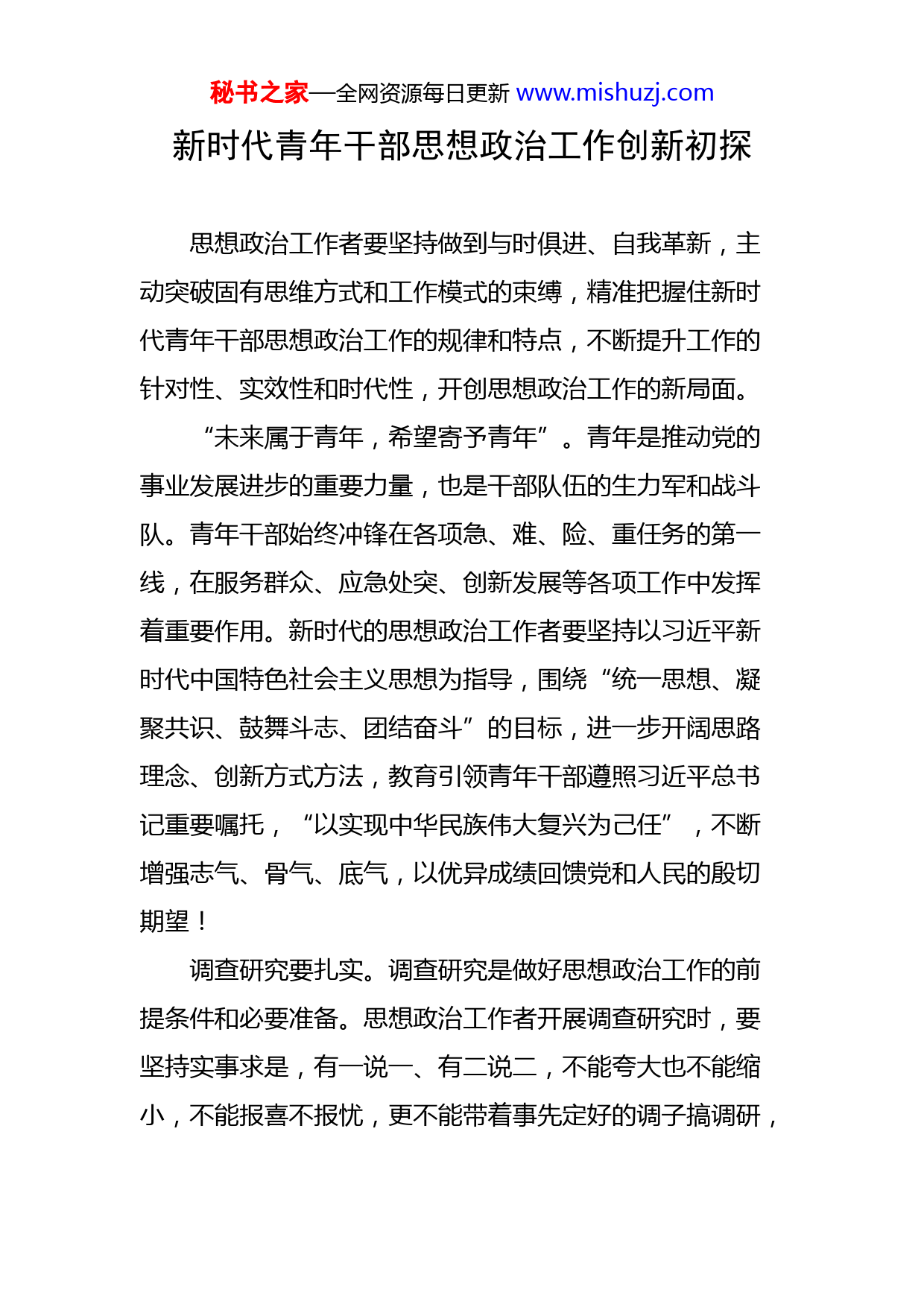 秘书之家—全网资源每日更新www.mishuzj.com新时代青年干部思想政治工作创新初探思想政治工作者要坚持做到与时俱进、自我革新,主动突破固有思维方式和工作模式的束缚,精准把握住新时代青年干部思想政治工作的规律和特点,不断提升工作的针对性、实效性和时代性,开创思想政治工作的新局面。“未来属于青年,希望寄予青年”。青年是推动党的事业发展进步的重要力量,也是干部队伍的生力军和战斗队。青年干部始终冲锋在各项急、难、险、重任务的第一线,在服务群众、应急处突、创新发展等各项工作中发挥着重要作用。新时代的思想政治工作者要坚持以习近平新时代中国特色社会主义思想为指导,围绕“统一思想、凝聚共识、鼓舞斗志、团结奋斗”的目标,进一步开阔思路理念、创新方式方法,教育引领青年干部遵照习近平总书记重要嘱托,“以实现中华民族伟大复兴为己任”,不断增强志气、骨气、底气,以优异成绩回馈党和人民的殷切期望!调查研究要扎实。调查研究是做好思想政治工作的前提条件和必要准备。思想政治工作者开展调查研究时,要坚持实事求是,有一说一、有二说二,不能夸大也不能缩小,不能报喜不报忧,更不能带着事先定好的调子搞调研,秘书之家—全网资源每日更新www.mishuzj.com才能确保调查研究的真实性;要端正认识态度,注意保持虚心和耐心,不要怕有不同意见,以诚恳、亲热、自然的态度与青年干部交朋友,倾听他们内心深处最真实的想法和意见,以确保调查研究的有效性;要掌握科学方法,围绕既定的目标和对象,采取开调查会、个别谈话和实地调查等方式,尽量收集第一手真实资料,并采取审慎方式对调查所得材料进行梳理归纳和总结,以提出解决问题的思路和办法。身份定位要准确。思想政治工作者在以青年干部为对象开展工作时,要准确把握“三种角色”的职责定位。要做好“后勤部长”,以真心和诚心深入了解青年干部在工作中、家庭里和心理上的各种困难和负担,及时帮助他们解决后顾之忧;要做好“引路人”,在充分激发青年干部优势和潜能的同时,还要善于发现他们的问题和不足,适时加以理论引导和实践指导,实现补短板强弱项的目标;要做好“深度管理者”,紧紧抓住青年干部的目标理想和事业追求,以符合他们逻辑思维和行为特点的方式,加深沟通交流与合作共事,引导他们合理调控个人预期,沿着正确的方向发展进步。思想引领要及时。思想政治工作者要强化阵地意识,不断推动青年干部增进对习近平新时代中国特色社会主义思想的政治认同、思想认同、理论认同、情感认同,筑牢秘书之家—全网资源每日更新www.mishuzj.com思想根基;要按照符合信息传播规律和感知特点的方式,对内容进行精心的设计,并实施有计划、有步骤的推送,实现全方位全景式的引领教育;要创新方式方法,在坚持和加强好的宣传工作传统基础上,依托“两微一端”等新的媒介载体,通过文本、漫画、影像等新颖的叙事手段,及时传递给青年干部以提升思想政治工作的时代性有效性。心理干预要贴心。思想政治工作者要围绕为青年干部在“心理上解压”这个目标,不断提升开展心理干预的意识和能力,加强心理咨询方法的宣传力度,积极营造良好氛围,在逐步破除青年干部对心理干预的戒备和防范心理的前提下,针对青年干部工作强度高、家庭负担重的现实状况,适时采取心理干预和调节措施,帮助他们塑造积极健康的心理状态,为开展思想政治工作打下坚实心理基础。制度建设要持之以恒。近日,中共中央、国务院印发了《关于新时代加强和改进思想政治工作的意见》,为提升青年干部思想政治工作制度化建设水平,提供了范本,指明了方向。思想政治工作者要着力在此方面下功夫,以适应新时代的发展要求。思想政治工作者要不断完善工作程序和流程,突出强化跟踪问效,建立精准高效的考核评价机制,持之以恒地促使思想政治工作往“深、细、实”的方向发展。