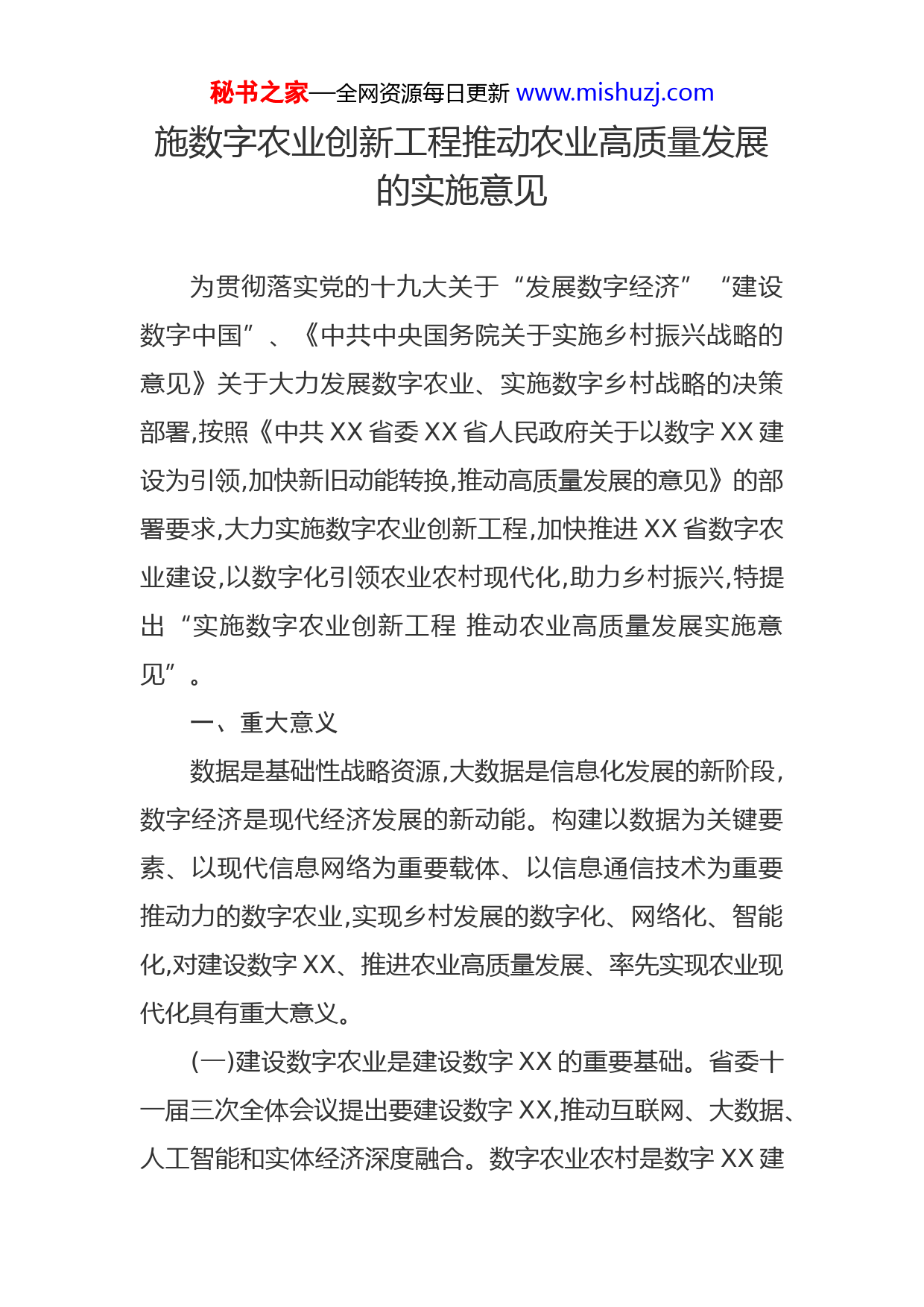 秘书之家—全网资源每日更新www.mishuzj.com施数字农业创新工程推动农业高质量发展的实施意见为贯彻落实党的十九大关于“发展数字经济”“建设数字中国”、《中共中央国务院关于实施乡村振兴战略的意见》关于大力发展数字农业、实施数字乡村战略的决策部署,按照《中共XX省委XX省人民政府关于以数字XX建设为引领,加快新旧动能转换,推动高质量发展的意见》的部署要求,大力实施数字农业创新工程,加快推进XX省数字农业建设,以数字化引领农业农村现代化,助力乡村振兴,特提出“实施数字农业创新工程推动农业高质量发展实施意见”。一、重大意义数据是基础性战略资源,大数据是信息化发展的新阶段,数字经济是现代经济发展的新动能。构建以数据为关键要素、以现代信息网络为重要载体、以信息通信技术为重要推动力的数字农业,实现乡村发展的数字化、网络化、智能化,对建设数字XX、推进农业高质量发展、率先实现农业现代化具有重大意义。(一)建设数字农业是建设数字XX的重要基础。省委十一届三次全体会议提出要建设数字XX,推动互联网、大数据、人工智能和实体经济深度融合。数字农业农村是数字XX建秘书之家—全网资源每日更新www.mishuzj.com设的重要组成部分和亟需补齐的短板,加快数字农业建设,弥合城乡数字鸿沟,让农业农村农民共享数字经济发展红利,将为数字XX建设提供有力支撑。(二)建设数字农业是推进农业高质量发展和乡村振兴的重要举措。目前,全省农业已经进入高质量发展新阶段,农村迎来全面振兴新征程。推动农业农村全方位、全角度、全链条数字化改造,有利于催生新业态新模式,释放数字对农业农村经济发展放大、叠加、倍增作用,促进生产成本节约、要素配置优化、供求有效对接、治理精准高效,推进产业数字化、数字产业化,推动实现农业农村发展质量变革、效率变革、动力变革。(三)建设数字农业是抢占农业制高点的必然要求。新一轮科技革命和产业变革孕育兴起,数字技术与农业农村的深度融合已成为经济增长的动力源、产业转型升级的驱动力世界主要农业发达国家都将数字农业作为国家战略重点和优先发展方向,将互联网、大数据、遥感、人工智能等现代信息技术广泛应用于农业发展全过程,构筑新一轮产业革命新优势。我省要成为农业强省、抢占农业制高点,必须顺应世界农业发展趋势,以数字技术驱动引领农业农村发展,掌握先机、赢得主动。当前,我省数字农业发展迎来前所未有的历史机遇。党中央、国务院和省委、省政府高度重视数字经济发展工作秘书之家—全网资源每日更新www.mishuzj.com并做出了一系列重要部署,为发展数字农业创造了良好环境。数字农业基础条件明显改善,遥感、大数据、物联网等数字技术在农业领域逐步运用。农业生产经营及管理服务领域数据资源不断丰富,数字产业化加快推进,新产业新业态蓬勃发展。但也应该看到,农业农村数字化进展仍总体滞后,还面临诸多挑战。农业农村数字化基础薄弱,数据资源分散,数据获取能力较弱。数据开发应用不够,整合共享不充分,管理服务支撑不强。面对新形势新要求,必须牢牢把握数字经济蓬勃发展的重大历史机遇,全面推进农业三大体系数字化进程,统筹谋划,抢抓机遇,主动作为,推动数字技术与农业农村经济加快融合,助推乡村振兴和数字XX战略加快实施。二、总体思路(一)指导思想全面贯彻党的十九大精神,以习近平新时代中国特色社会主义思想为指导,按照实施数字XX战略和乡村振兴战略的总体部署,以产业数字化为发展主线,以数字技术与农业农村经济深度融合为主攻方向,着力建设基础数据资源体系,加快农业农村生产经营、管理服务数字化改造,推动各类信息系统和公共数据互联开放共享,全面提升农业生产智能化、经营网络化、管理高效化、服务便捷化水平,用数字化引领驱动农业农村现代化和乡村治理能力现代化,为建设农业强省和数字XX提供有力支撑。秘书之家—全网资源每日更新www.mishuzj.com(二)基本原则——坚持问题导向、应用驱动。从面临的突出问题和迫切需求入手,明确建设重点,主攻薄弱环节,以应用为内生动力,推动科学高效可持续发展。——坚持创新共享、整合资源。加强顶层设计,以数据资源整合促进数据采集、带动数据开发利用,建立标准统一、各负其责、共建共享的工作机制。——坚持先易后难、逐步推进。优先选择基础较好的地区、重点领域、重点品种建设数字农业,逐个品种、逐个环节开展试点,边试点边总结,边推进边见成效,带动不同地区、不同领域数字农业稳步发展。(三)发展目标到2025年,数字农业建设取得初步成效。农业农村基础数据资源体系初步建成,数字技术与现代农业产业体系、生产体系、经营体系深度融合,农业农村产业数字化和数字产业化水平大幅提升,数字农业成为数字经济的重要组成部分。三、主要任务(一)加快推进农业三大体系数字化进程,推动产业升级。加快推动产业数字化,利用物联网、大数据、云计算、移动互联等新技术,对农业农村传统产业进行全方位、全角度、秘书之家—全网资源每日更新www.mishuzj.com全链条改造,提高全要素生产率,释放数字要素的放大、叠加、倍增作用,改造提升传统发展动能。(二)加快推动数字经济发展,培育新发展动能。发挥互