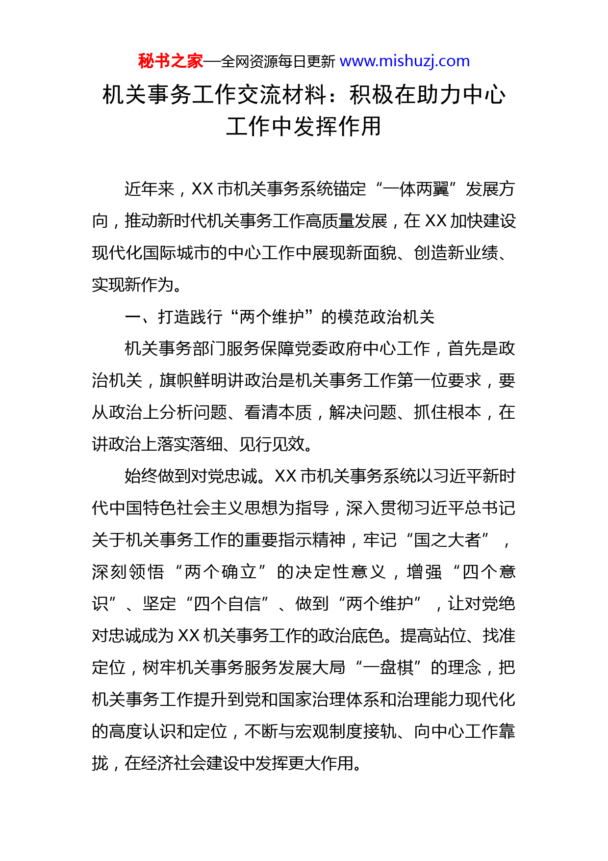 秘书之家—全网资源每日更新www.mishuzj.com机关事务工作交流材料:积极在助力中心工作中发挥作用近年来,XX市机关事务系统锚定“一体两翼”发展方向,推动新时代机关事务工作高质量发展,在XX加快建设现代化国际城市的中心工作中展现新面貌、创造新业绩、实现新作为。一、打造践行“两个维护”的模范政治机关机关事务部门服务保障党委政府中心工作,首先是政治机关,旗帜鲜明讲政治是机关事务工作第一位要求,要从政治上分析问题、看清本质,解决问题、抓住根本,在讲政治上落实落细、见行见效。始终做到对党忠诚。XX市机关事务系统以习近平新时代中国特色社会主义思想为指导,深入贯彻习近平总书记关于机关事务工作的重要指示精神,牢记“国之大者”,深刻领悟“两个确立”的决定性意义,增强“四个意识”、坚定“四个自信”、做到“两个维护”,让对党绝对忠诚成为XX机关事务工作的政治底色。提高站位、找准定位,树牢机关事务服务发展大局“一盘棋”的理念,把机关事务工作提升到党和国家治理体系和治理能力现代化的高度认识和定位,不断与宏观制度接轨、向中心工作靠拢,在经济社会建设中发挥更大作用。秘书之家—全网资源每日更新www.mishuzj.com落实全面从严治党。推动从严管党治党和机关事务改革发展深度融合、一体推进,不断完善管思想、管工作、管作风、管纪律的从严管理制度。围绕廉政风险重点,加强分析研判,强化日常管理,下好先手棋、打好主动仗。认真落实中共中央八项规定及实施细则精神,积极贯彻《党政机关办公用房管理办法》《党政机关公务用车管理办法》等,结合“1+X”专项督查,强化党政机关国有资产监督管理,遏制“舌尖上的浪费”、刹住“车轮上的腐败”、杜绝“楼堂馆所的奢华”。二、树立“集约管理”的科学治理标杆深刻把握新时代XX机关事务工作的新形势、新任务、新要求,找准机关事务工作在XX现代化国际城市建设中的职责定位,以机关事务管理数字化、信息化、法治化为着力点,优化配置人、财、物等要素,形成集约高效的科学化治理模式。聚焦数字赋能,打造智慧型机关。以打响“数字XX”国际品牌为契机,规划实施以“数字乌山”项目为代表的机关事务数字化建设,运用大数据、云计算等智能化手段,把握优势、综合集成,实现“四数三全”治理模式,即数字化安防、数字化节能、数字化资产、数字化服务和全要素设计、全方位感知、全系统集成。引入社会互联网服务模式,打通各个业务模块数据藩篱,建设机关事务秘书之家—全网资源每日更新www.mishuzj.com“全图景智慧生态”,使之成为一个有机整体。持续挖掘“数字化”应用的深度和广度,通过指尖上的“微服务”,提供高效、便捷的办公、生活服务管理。建成全省首个党政机关办公用房数字化管理平台,实现办公用房数据随时随地可视、可查、可联、可调。依托公车智能调度补充系统,把互联网软件打车模式引入公务用车管理,实现用车申请、车辆调派在线办理,大幅度提升工作效率。打造公共机构节能数字化管理试点,建设远程集成控制管理平台,助力碳达峰、碳中和的目标实现。聚焦节能降耗,打造节约型机关。XX市积极发挥公共机构示范引领作用,把节能降碳作为节约型机关建设的重要着力点,扎实做好公共机构生活垃圾分类工作,逐步推进停止使用不可降解一次性塑料制品。把过紧日子要求和绿色低碳理念贯穿工作全过程,大力推行绿色办公,鼓励绿色出行,引导干部职工养成简约适度、低碳环保的生活和工作方式。“十三五”期间,全市公共机构单位建筑面积能耗、人均综合能耗、人均用水量分别下降XX%、XX%和XX%,降幅远超“十三五”规划要求X倍以上,走在全省前列。全市共建成XXX家国家级节约型机关,X家公共机构获评国家级公共机构节约型示范单位,XX市机关事务管理局被评为“公共机构能效领跑者”“公共机构水效领跑者”。秘书之家—全网资源每日更新www.mishuzj.com聚焦集约高效,打造科学管理模式。推进集中统一管理,打造“共建、共享、共用”的融合生态,实现“财力、物力、人力”效能最大化。运用程序化、标准化的手段,通过购买市场化服务等方式,打通关节、疏通堵点、破除阻力,实现降本增效。针对部分单位办公用房分散办公、占有不均、使用无序的现状,按照资源共享、优化配置、提高效益的原则,多方调研、量化标准、统筹调配,做到应收尽收、应调尽调、应保尽保。发挥“全省一张网”统管优势,从标准化信息化两端发力,通过“一网通办”“电子化全周期管理”压缩公务用车审批周期,对公务用车使用时间、地点,加油、维修等信息进行全程监督,实现公务出行便捷合理、交通费用节约可控、车辆管理规范透明、监管问责科学有效。三、擦亮“优质服务”的后勤保障品牌服务是机关事务工作的重点,也是衡量机关事务工作质量、水平、成效的重要标尺。XX市机关事务部门积极主动作为,学习先进经验,在落实落细上求深化,在真抓实干里促提升,展现“优、细、实”的工作特色和精神风貌。“优”字当头,主动融入中心工作。发挥大型政务活动保障的窗口展示作用,圆满完成数字中国建设峰会、世界遗产大会等后勤保障任务,在疫情防控、餐饮住宿、车辆秘书之家—全网资源每日更新www.mishuzj.com调度